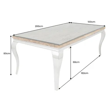 Luksusowy design tego barokowego stołu podkreślają elegancko wygięte, chromowane nogi stołu i blat z drewna tekowego. Dzięki temu mebel ten stanie się wyjątkowym elementem przyciągającym wzrok w Twoim salonie. Dzięki temu eleganckiemu projektowi możesz nadać swojemu domowi imponujący wygląd. Ten imponujący stół możesz połączyć z nowoczesnymi lub naturalnymi dodatkami. Po prostu spróbuj!