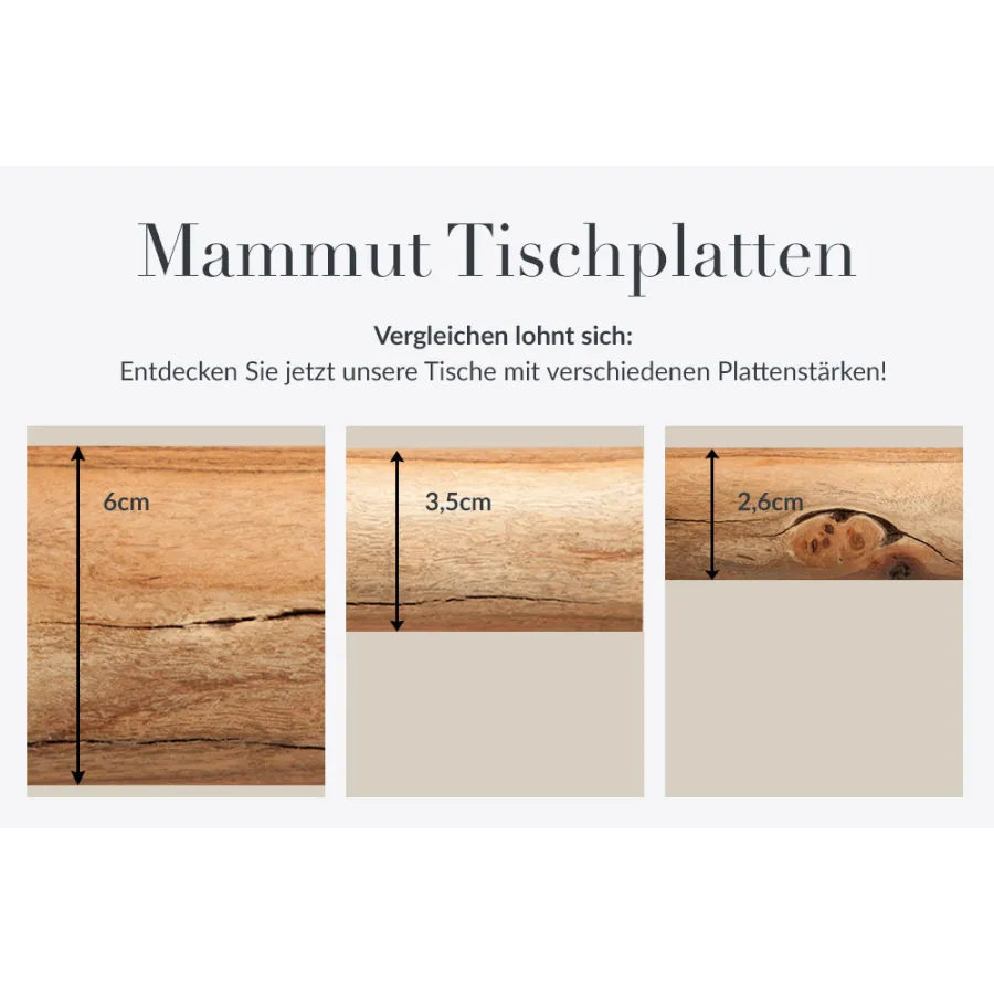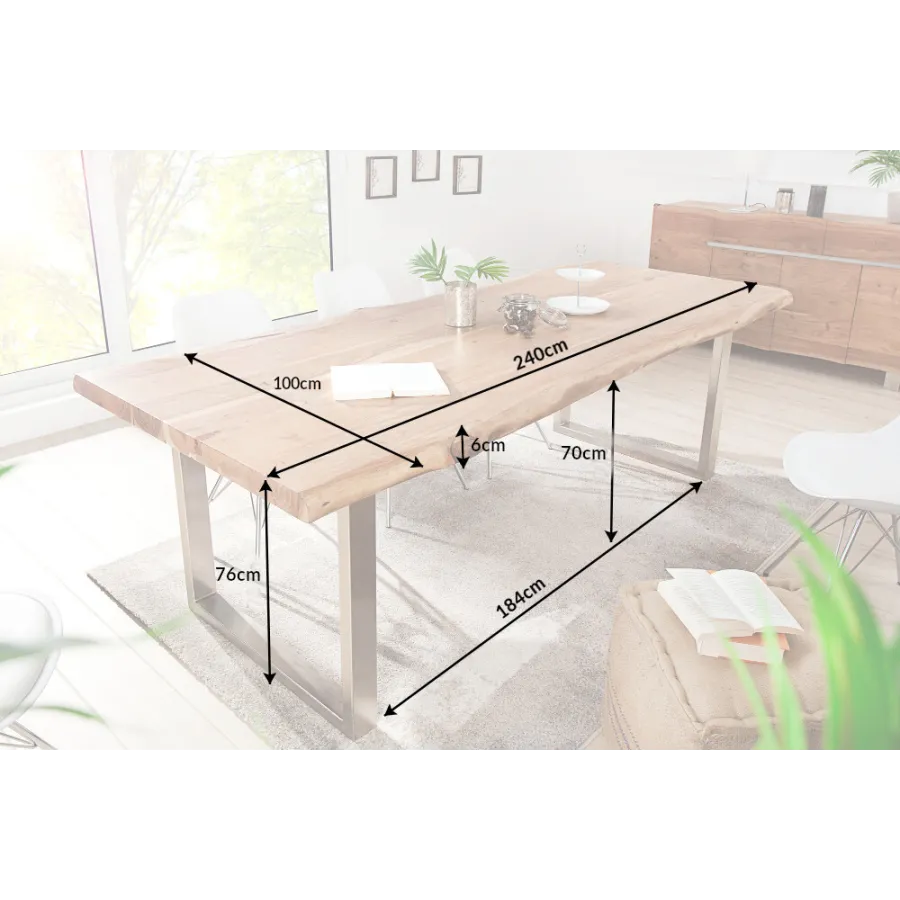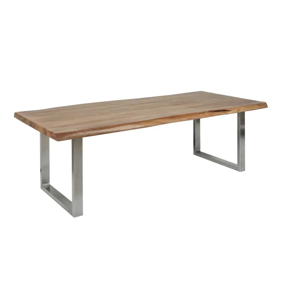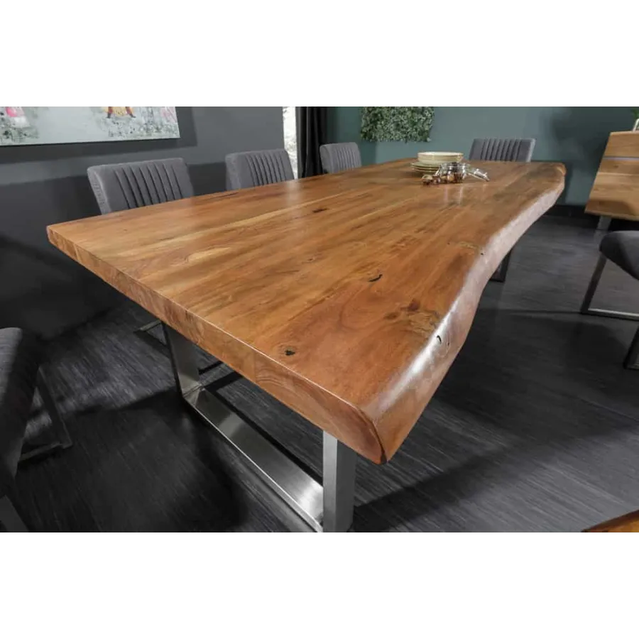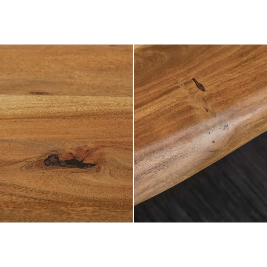 Odkryj nasz duży stół jadalny MAMMUT NATURE z naturalnym blatem! Jako specjalny akcent, krawędzie stołu zostały obrobione maszynowo, aby stworzyć oryginalny charakter i naturalne wrażenie kawałka gigantycznej akacji. To tak, jakby duże drzewo zostało przecięte na pół, aby stworzyć blat! Jest to możliwe dzięki specjalnie opracowanej maszynie, która tnie drewno, nadal w oryginalnym stanie, z nienaruszoną korą, do pożądanej grubości.