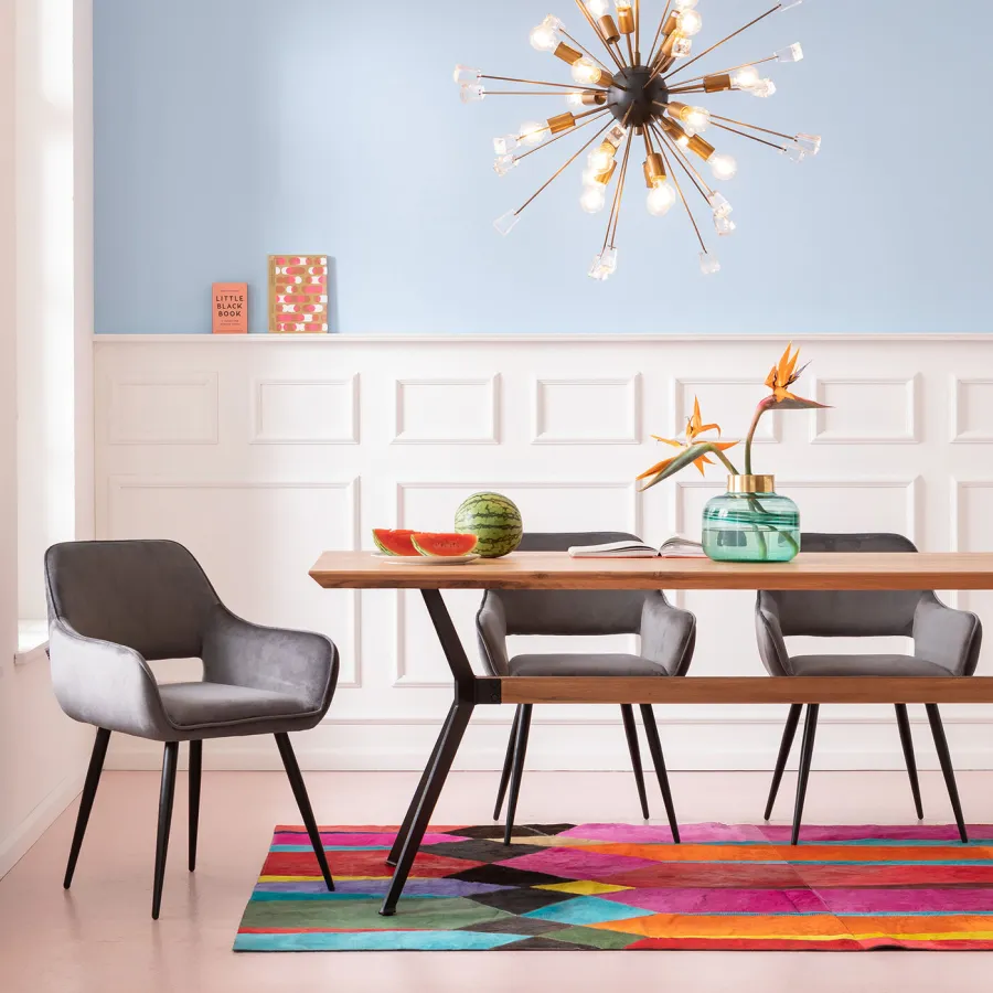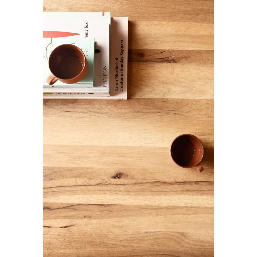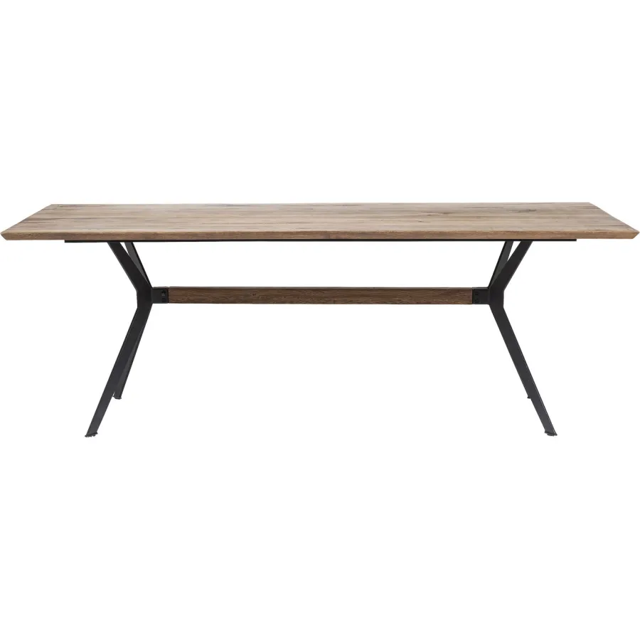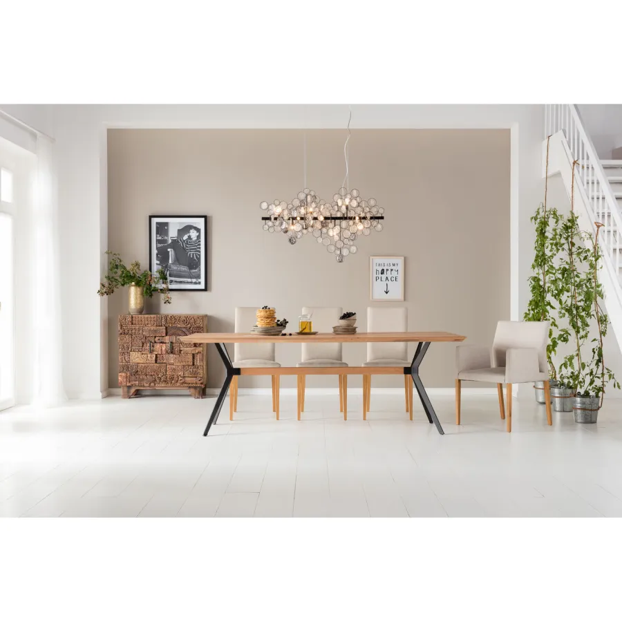 Stół do jadalni o jakości designu. Charakteryzuje się z jednej strony żywą powierzchnią blatu z litego dębu, co świadczy o naturalnym wzroście drzewa. Pokrycie bezbarwnym lakierem chroni i podkreśla cechy drewna. Jednocześnie uderzająca jest również dynamicznie ukształtowana podstawa z czarnej stali, która nadaje dużemu stołowi dynamikę i lekkość. Jako stylowy dodatek drewniana środkowa rozpórka ramy stołu współgra z blatem