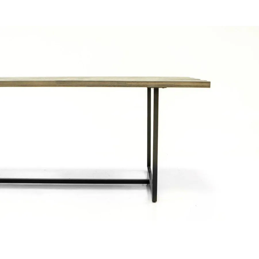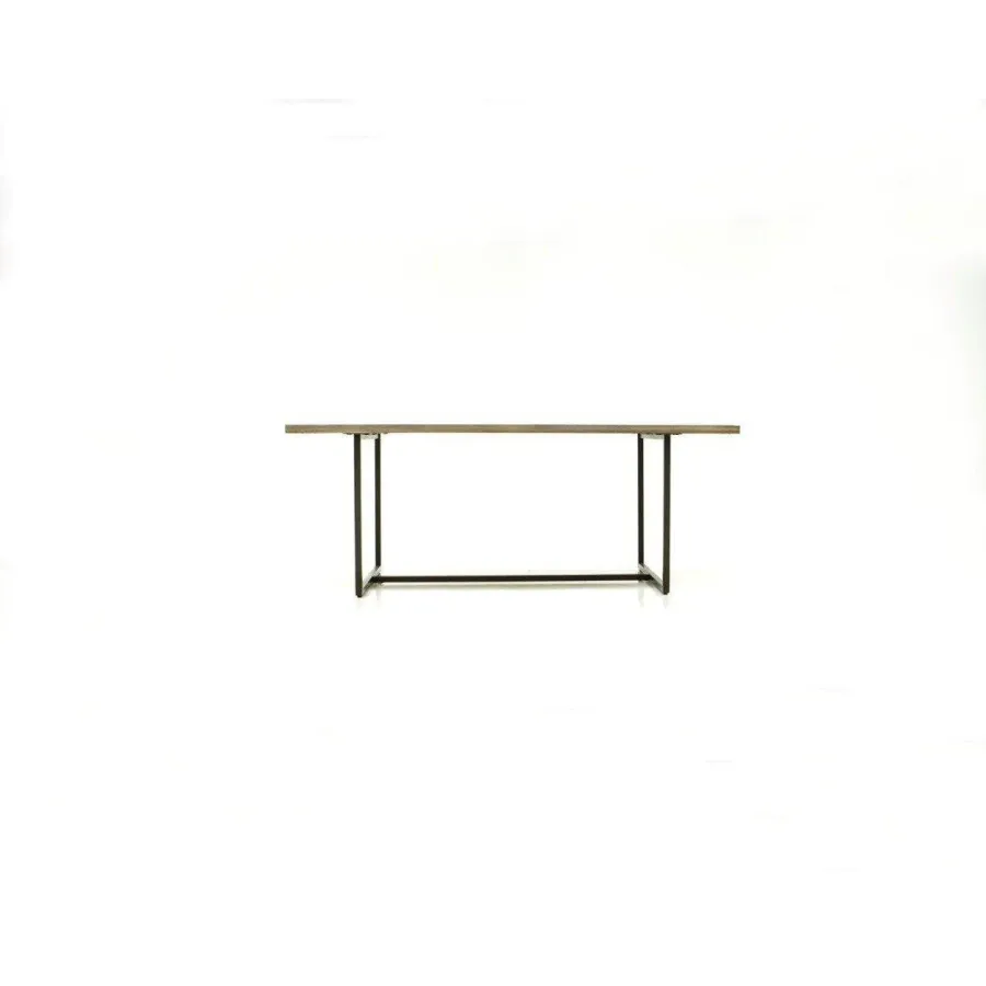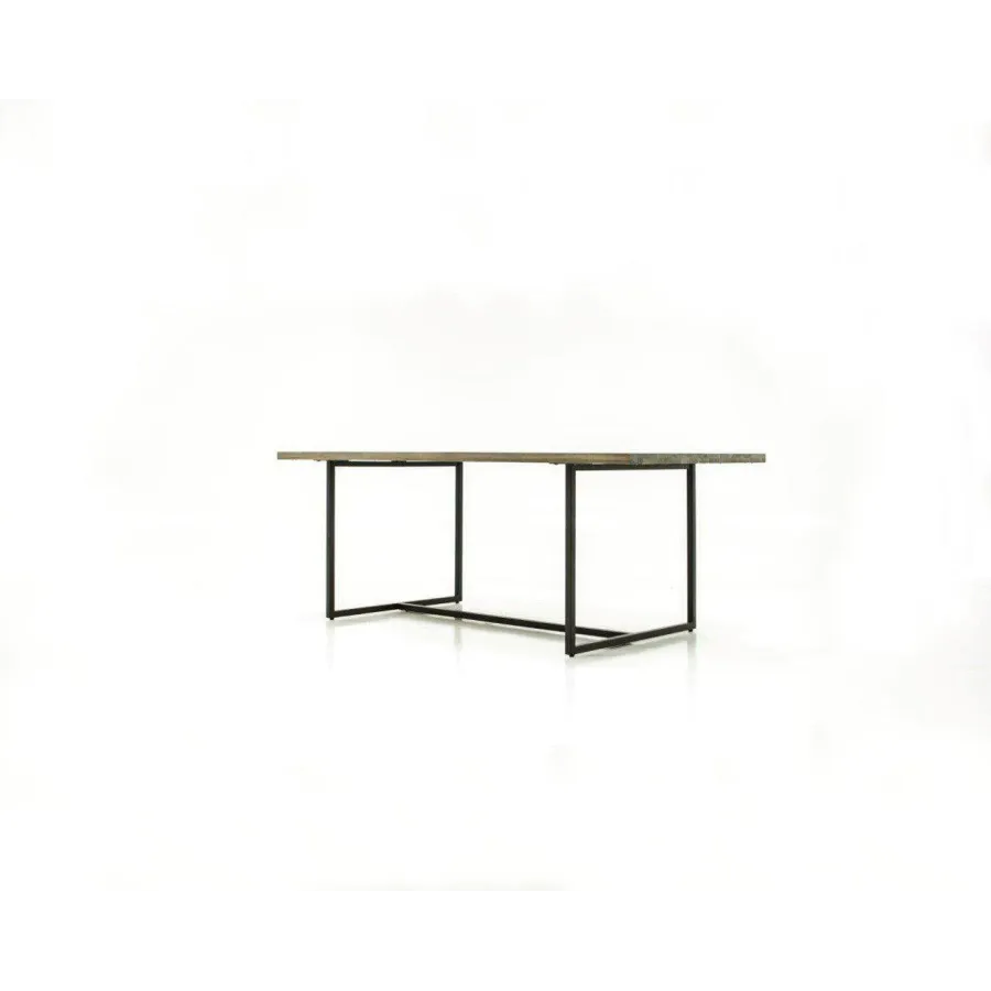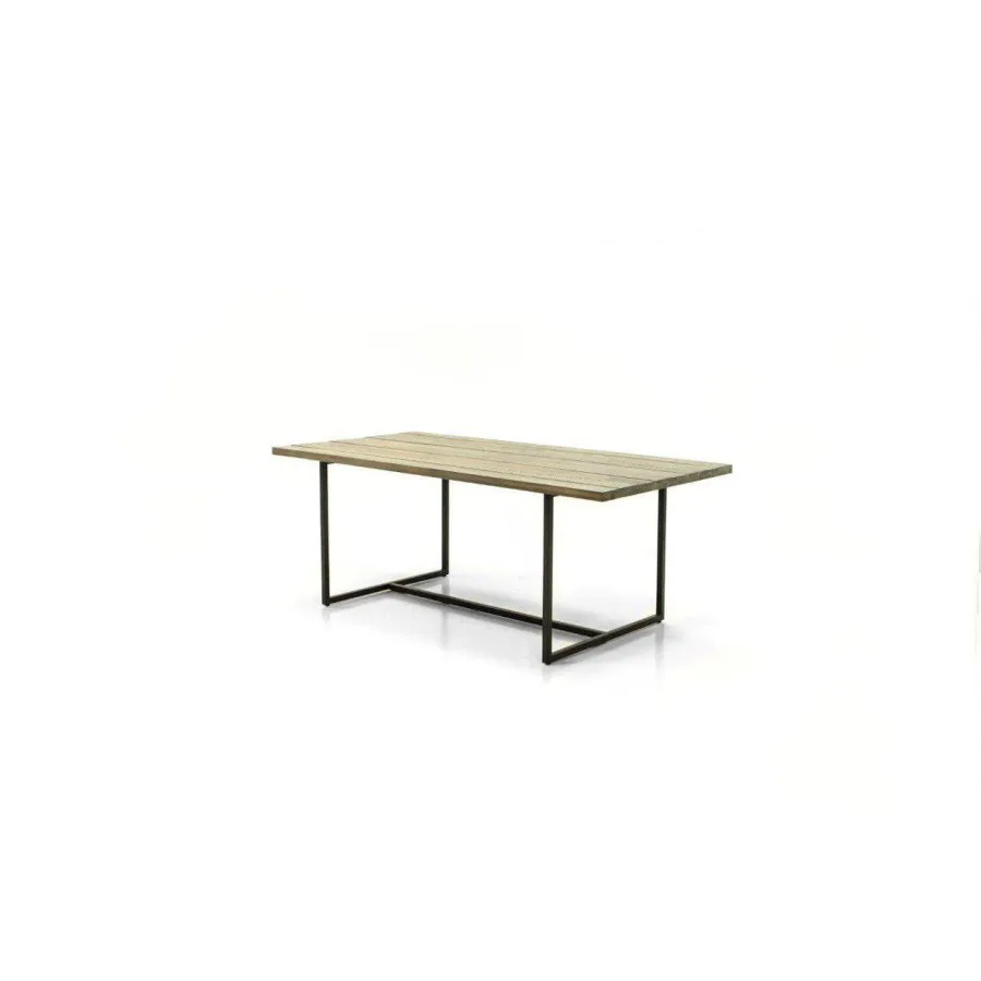 Stół drewniany w stylu loftowym, wykonany z wysokiej jakości szczotkowanego drewna akacji egzotycznej. Proste, przecierane metalowe nogi w kolorze grafitowym w ciepłym odcieniu, tworzą kształt litery U połączonych ze sobą w środkowej dolnej części.