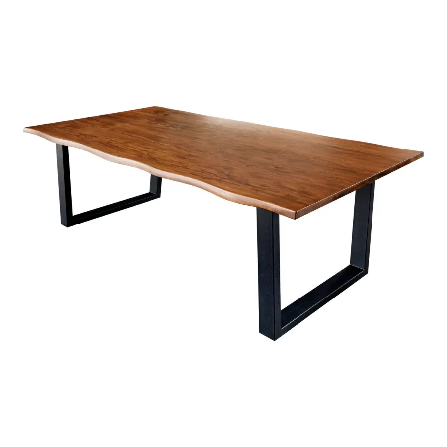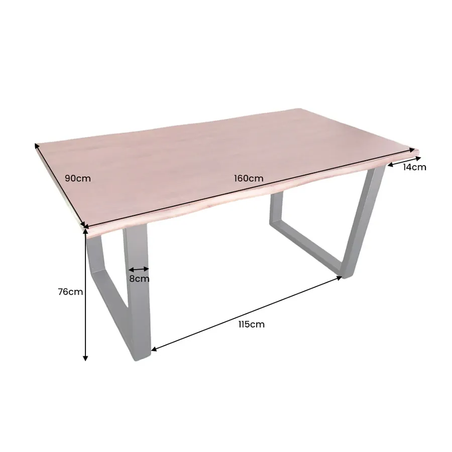 Stół jadalniany GENESIS to połączenie szlachetnego, naturalnego materiału z industrialną, współczesną formą. Jego masywny blat wykonano z olejowanego drewna akacjowego, które wyróżnia się ciepłym odcieniem brązu i pięknym, niepowtarzalnym usłojeniem. Każdy egzemplarz ma własny układ słojów oraz subtelnie nieregularną krawędź typu live edge, dzięki czemu stół staje się wyjątkowym elementem wystroju.