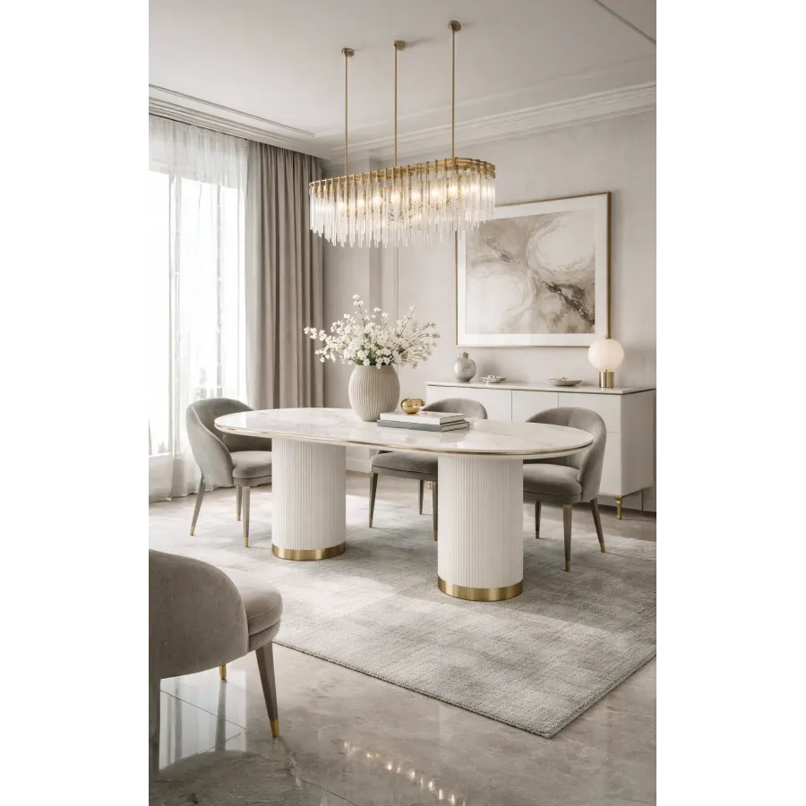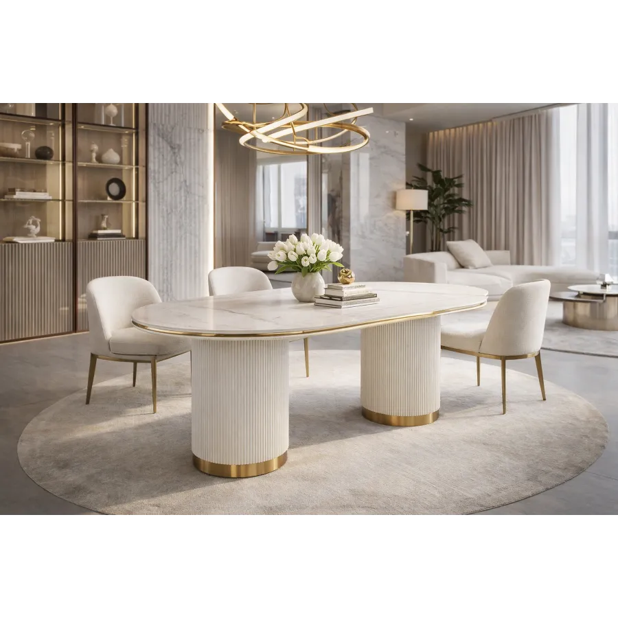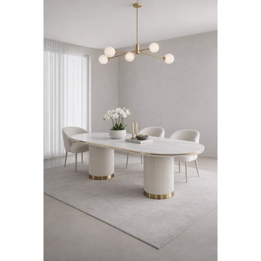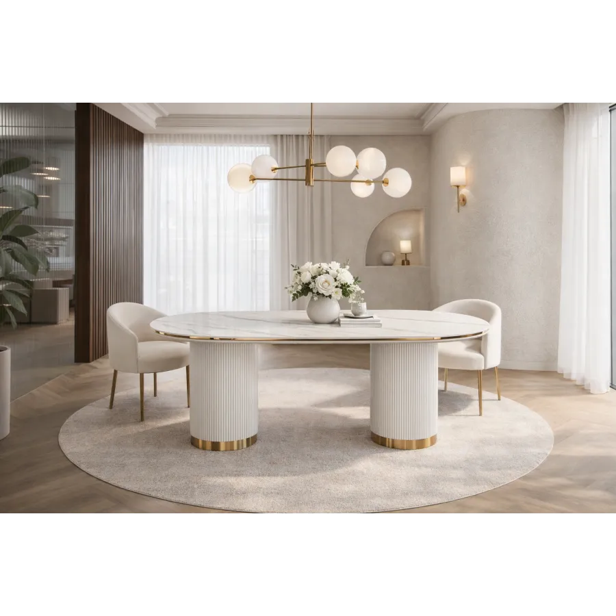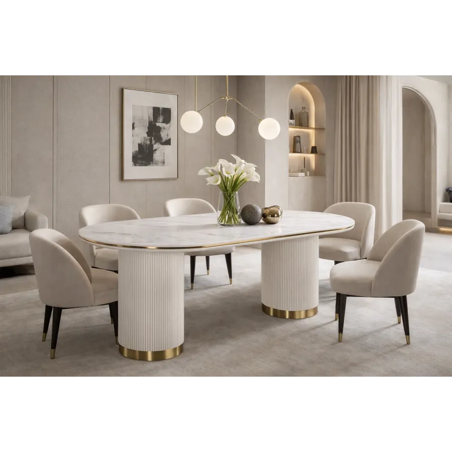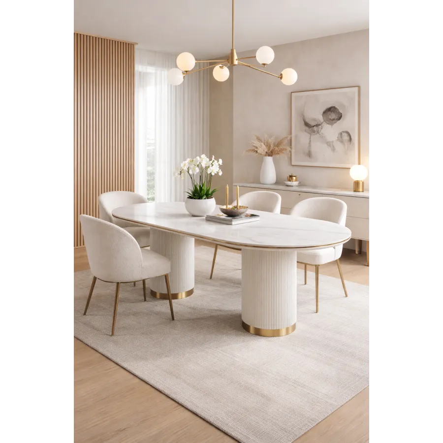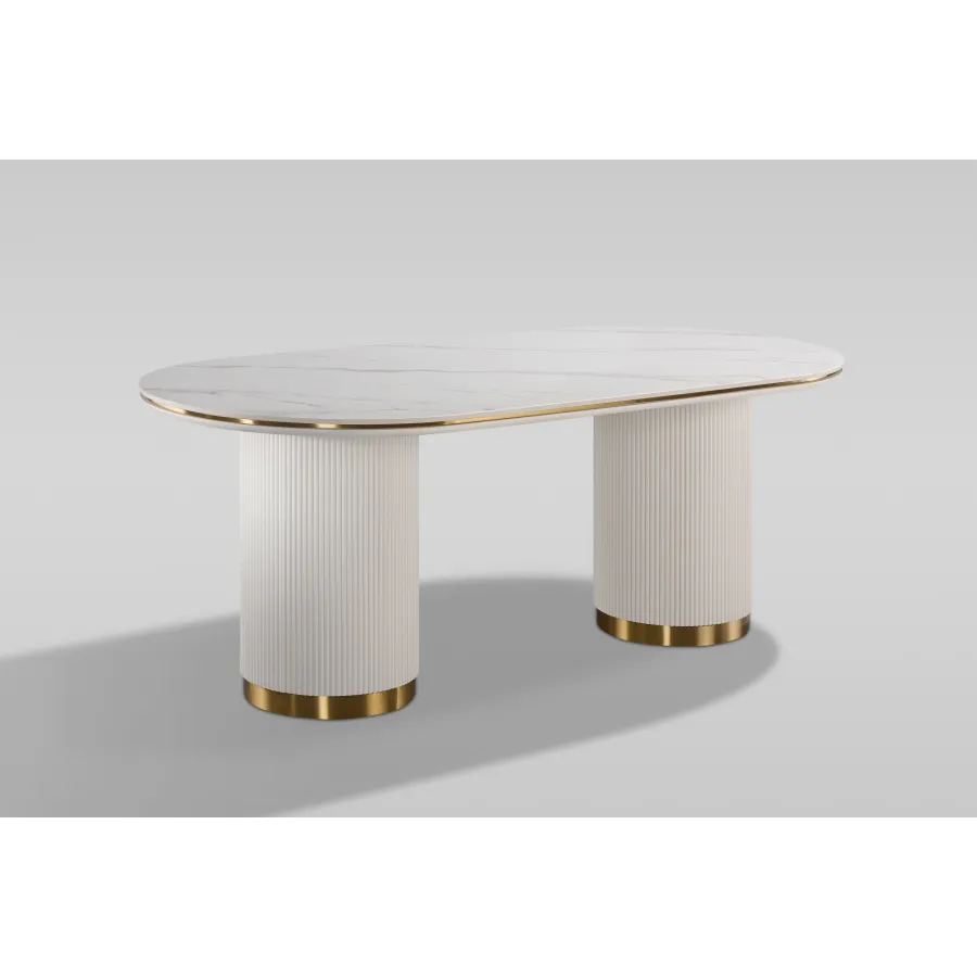 Nowoczesny stół w kolorze białym ecru z masywnymi nogami w kształcie walca, posiadającymi ryflowane drewno zakończone złotym wieńcem dolnym. Owalny biały blat jest imitacją marmuru.