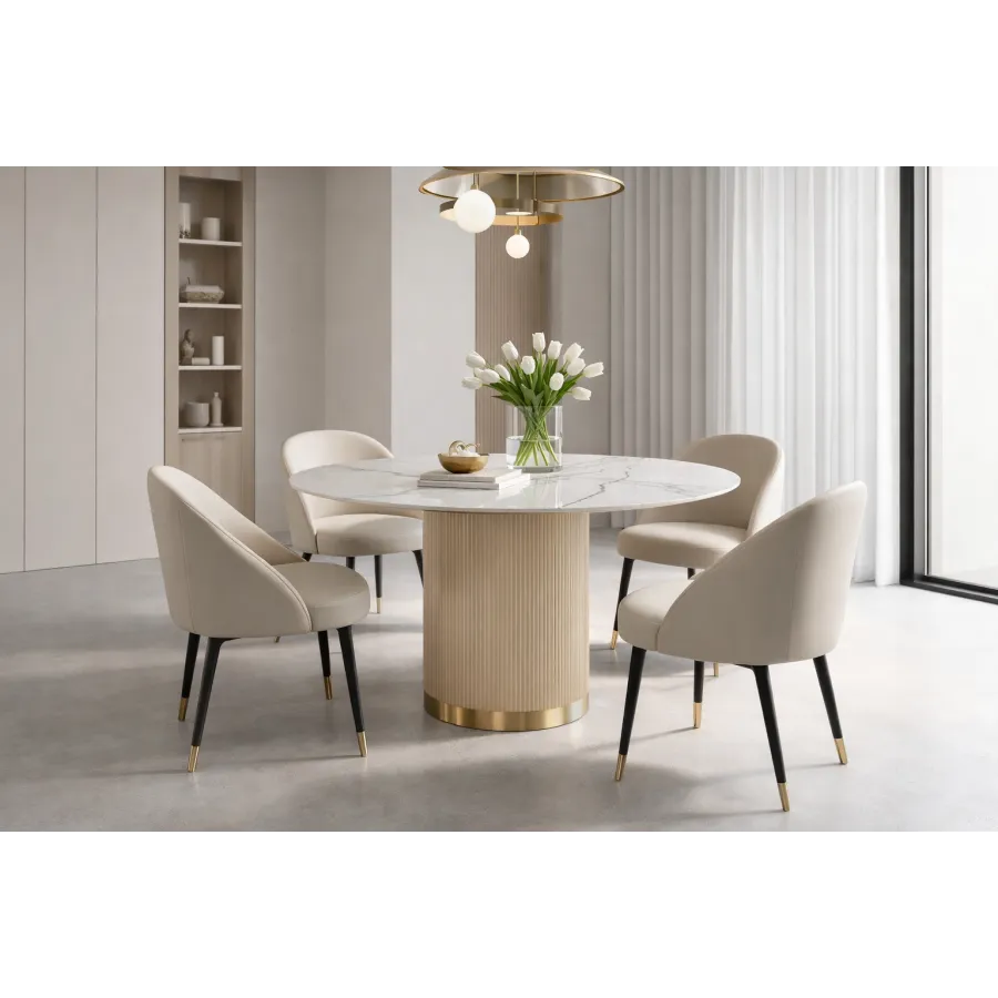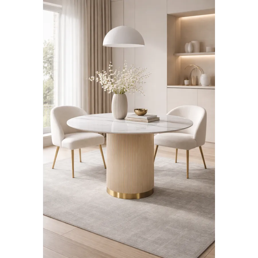 Nowoczesny stół w kolorze szampańskiego złota z masywną nogą w kształcie walca, posiadającą ryflowane drewno zakończone złotym wieńcem dolnym. Okrągły biały blat jest imitacją marmuru.
