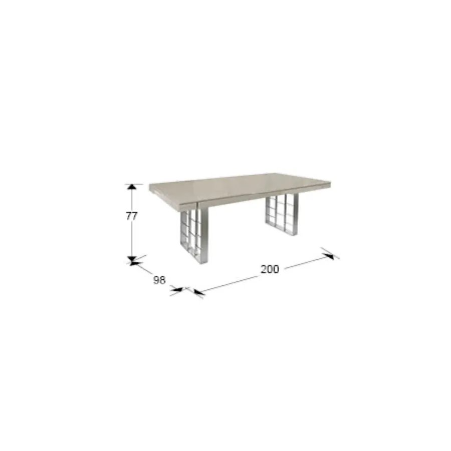 Stół jadalny z płyty MDF w kolorze popielatoszarym, lakierowany na połysk, z ozdobnymi rowkami i chromowanymi wykończeniami. Metalowe nogi z matowym, srebrnym wykończeniem.