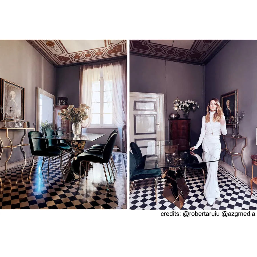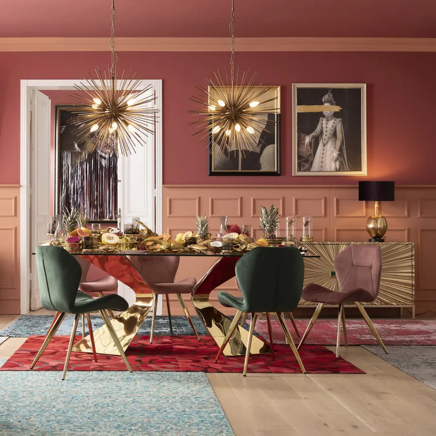 Luksusowy wygląd i wyrafinowanie. Trochę blasku jeszcze nikomu nie zaszkodziło. Ten stół jadalny może być również nowoczesną rzeźbą meblową w muzeum. Robi wrażenie kreatywnym wyrafinowaniem i eleganckim, nieco ekscentrycznym akcentem. Blat ze szkła bezpiecznego o grubości 13 mm wsparty jest na dwóch artystycznie ukształtowanych nogach w kolorze chromu. Stół idealnie wpasuje się do wnętrz w stylu glamour i eklektycznym, dodając im hollywoodzkiego uroku. Zwiększa to gwiazdorską jakość Twoich mebli. Dostępne inne wersje