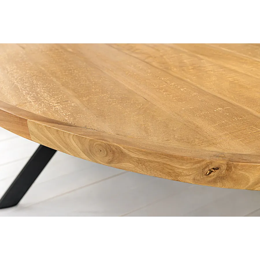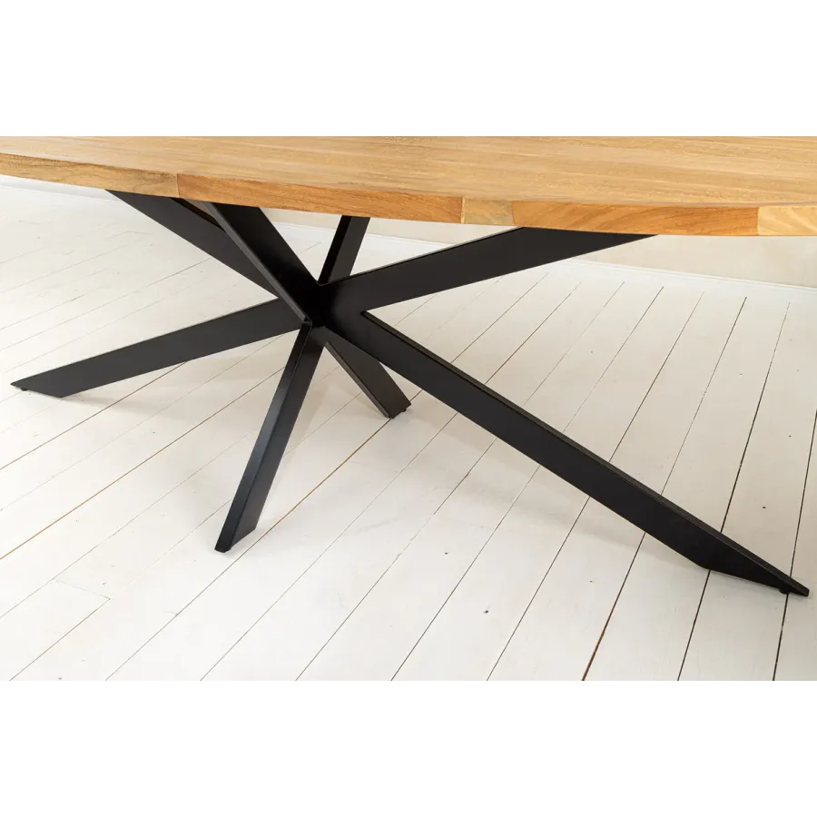Stół jadalny GALAXIE łączy w sobie nowoczesny design z naturalnymi elementami, dzięki czemu będzie prawdziwą ozdobą Twojej jadalni. Duży, owalny blat stołu wykonany z litego drewna mango zachwyca ciepłym wyglądem i indywidualnym usłojeniem. Czarna, żelazna rama w kształcie gwiazdy nadaje stołowi wyrazisty, industrialny wygląd, zapewniając jednocześnie stabilność.