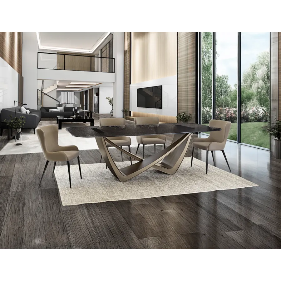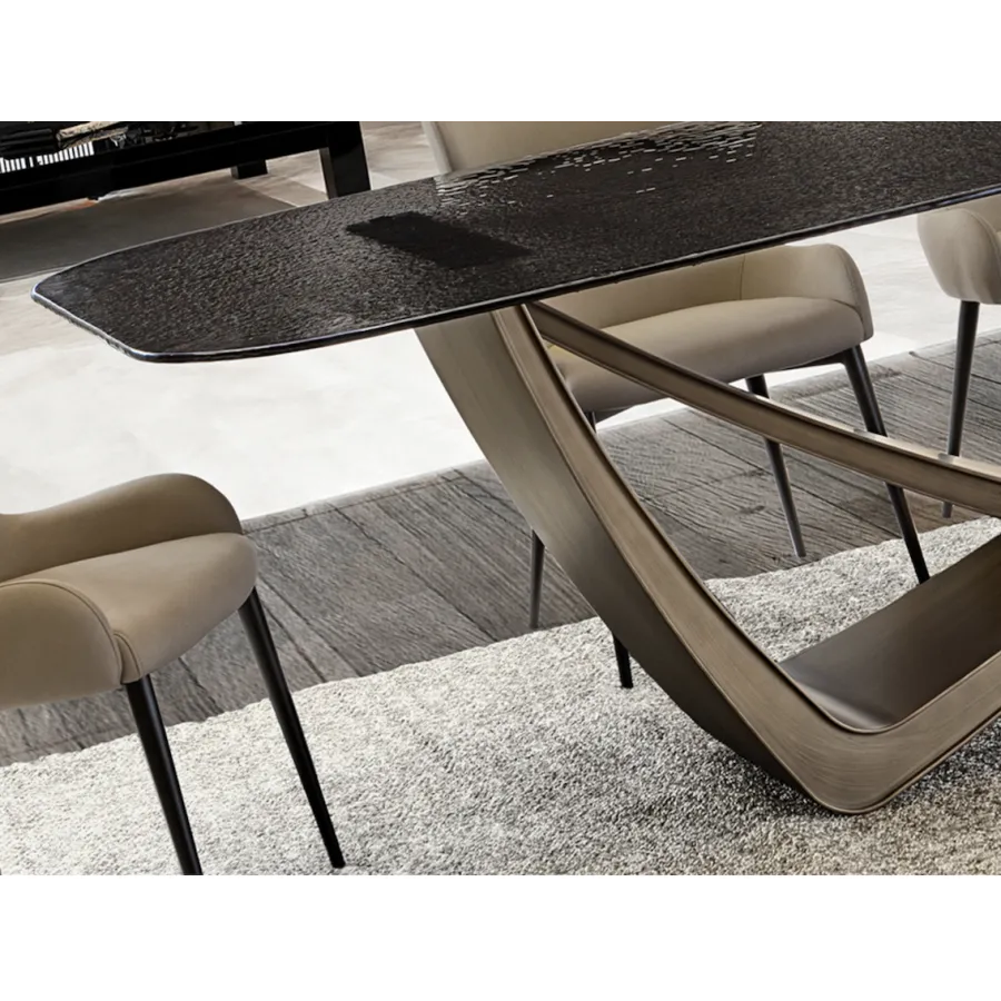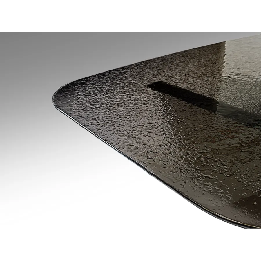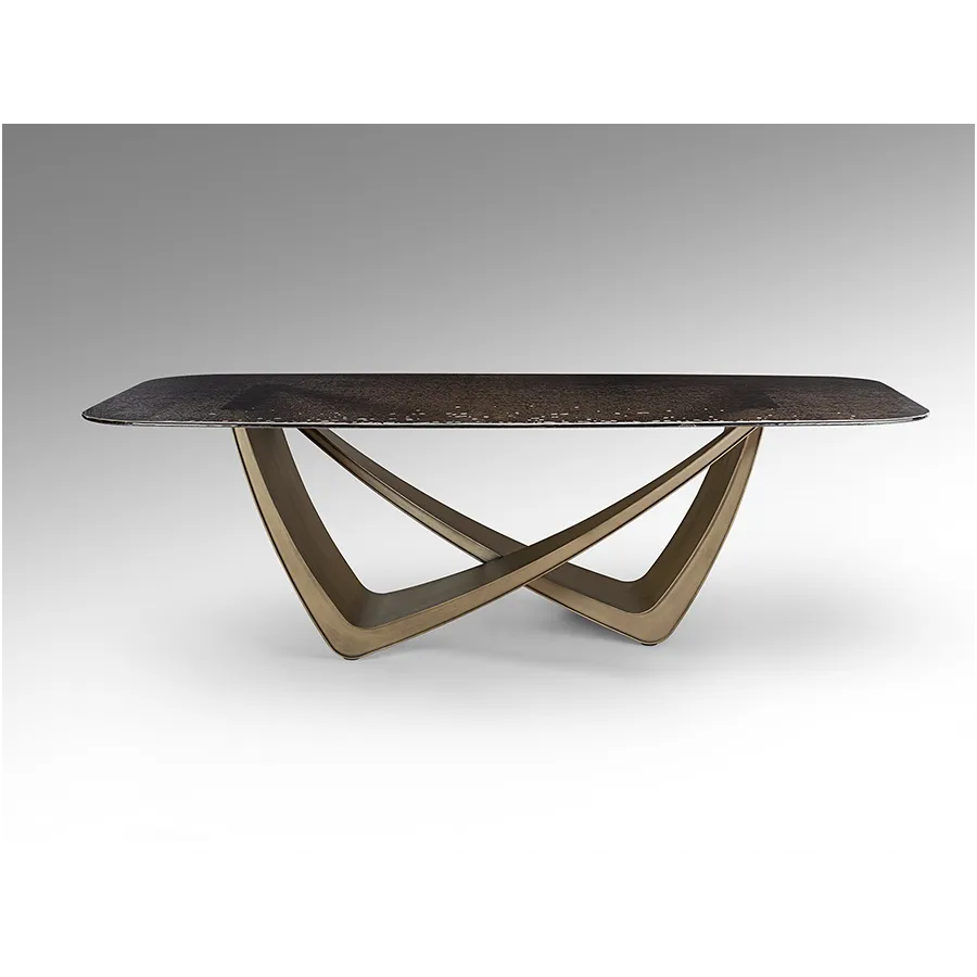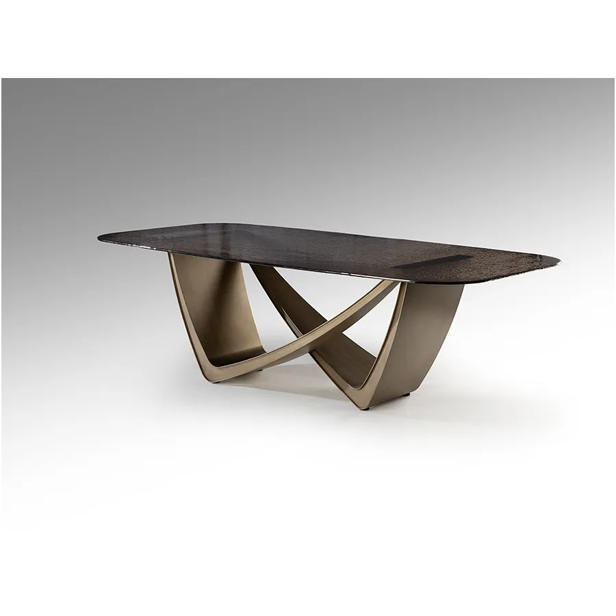 Stół jadalny wykonany z metalu w kolorze postarzanego brązu. Blat z szarego szkła formowanego termicznie, powierzchnia teksturowana.