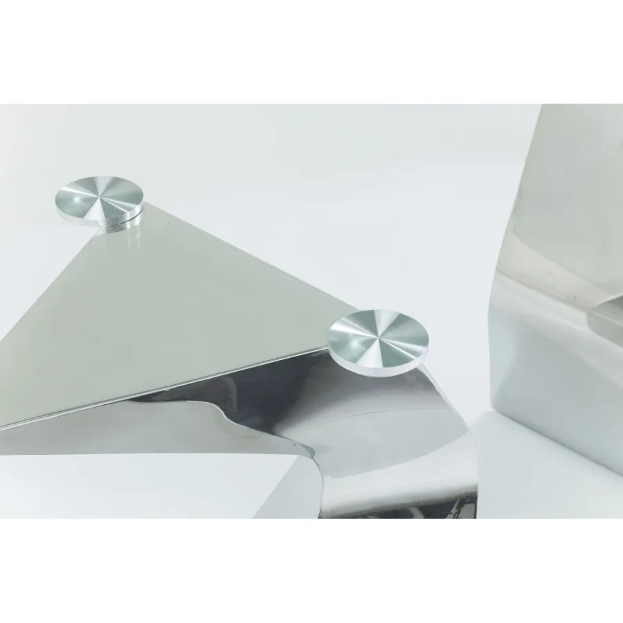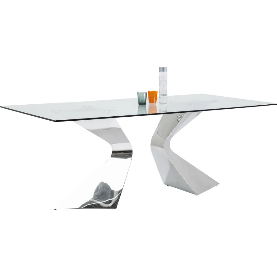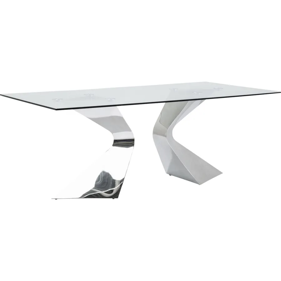 Luksusowy wygląd i wyrafinowanie. Trochę blasku jeszcze nikomu nie zaszkodziło. Ten stół jadalny może być również nowoczesną rzeźbą meblową w muzeum. Robi wrażenie kreatywnym wyrafinowaniem i eleganckim, nieco ekscentrycznym akcentem. Blat ze szkła bezpiecznego o grubości 13 mm wsparty jest na dwóch artystycznie ukształtowanych nogach w kolorze chromu. Stół idealnie wpasuje się do wnętrz w stylu glamour i eklektycznym, dodając im hollywoodzkiego uroku. Zwiększa to gwiazdorską jakość Twoich mebli. Dostępne inne wersje