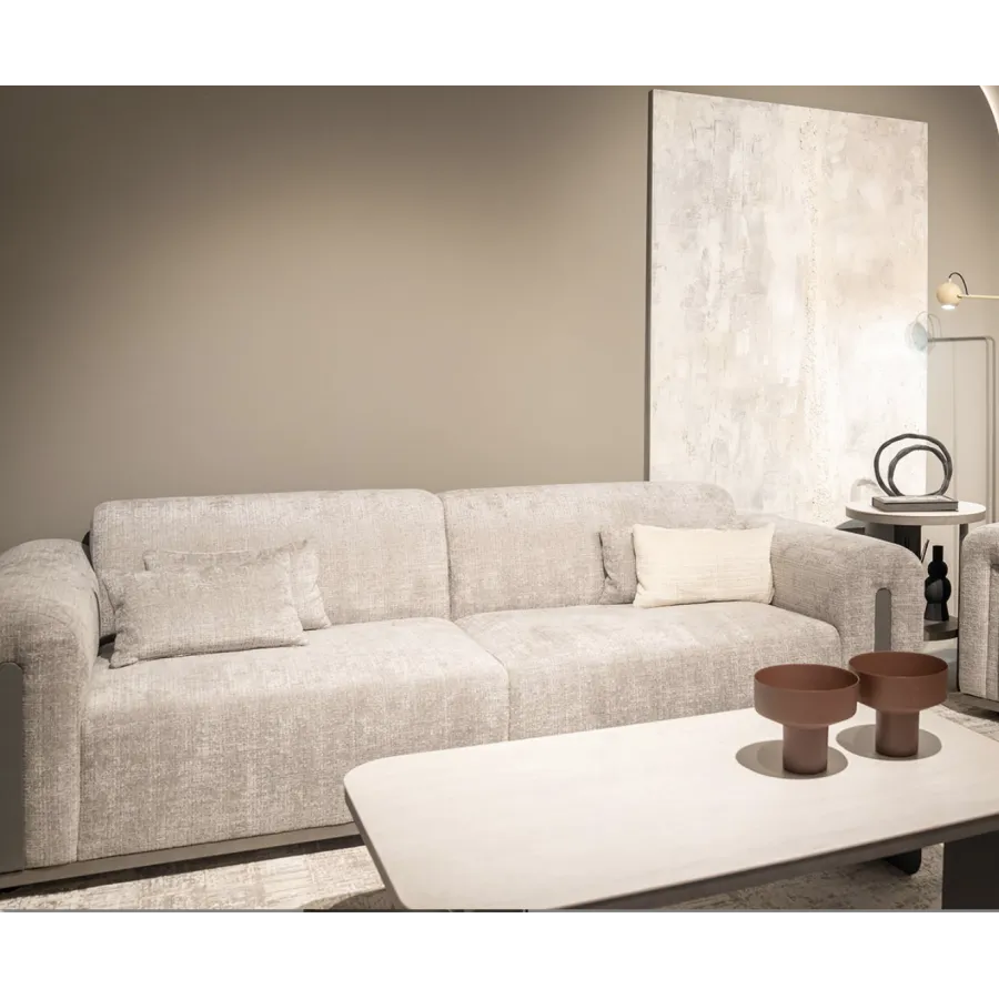 Subtelne metalowe profile wprowadzają elegancki kontrast, podkreślając geometryczną formę mebla i nadając mu wyjątkowy charakter. Ich obecność w centralnym pasie harmonijnie dopełnia całość, tworząc spójną i nowoczesną kompozycję.