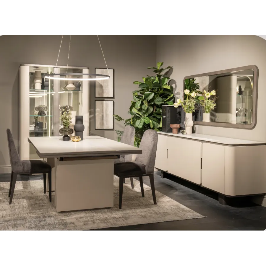 Komoda z dużym lustrem oraz szafki nocne zintegrowane stylistycznie z łóżkiem tworzą spójną kompozycję, która wpisuje się w estetykę nowoczesnego luksusu. Gładkie powierzchnie, miękkie krawędzie, minimalistyczne uchwyty i delikatne nóżki czynią tę sypialnię zarówno piękną, jak i praktyczną.