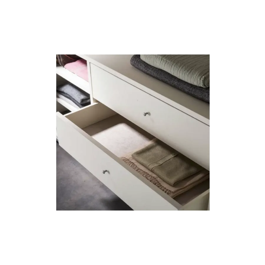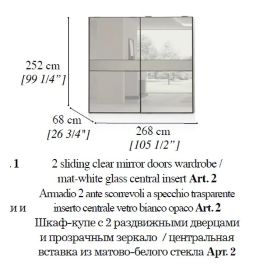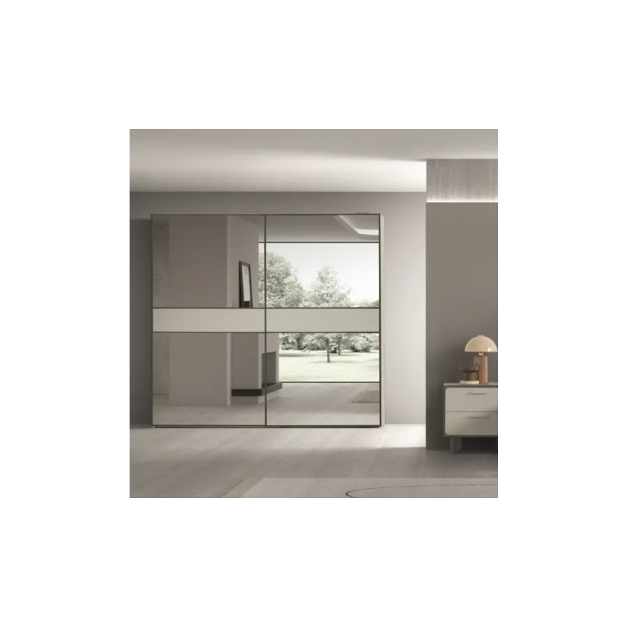 Wersja z centralnym panelem z matowego białego szkła dodaje szafie wyrafinowania i doskonale współgra z innymi elementami wyposażenia, takimi jak stoliki nocne czy komody z lakierowanym wykończeniem. Delikatne zestawienie matowej powierzchni z lustrem tworzy elegancki, ponadczasowy efekt.