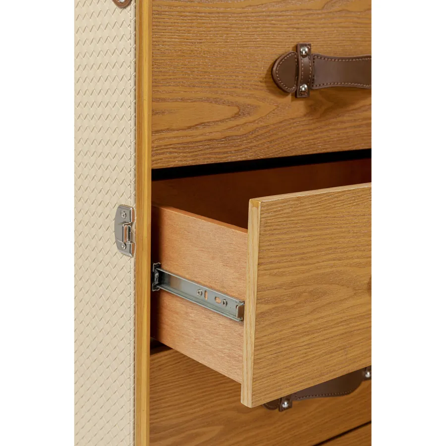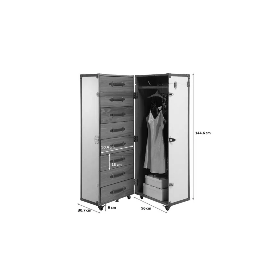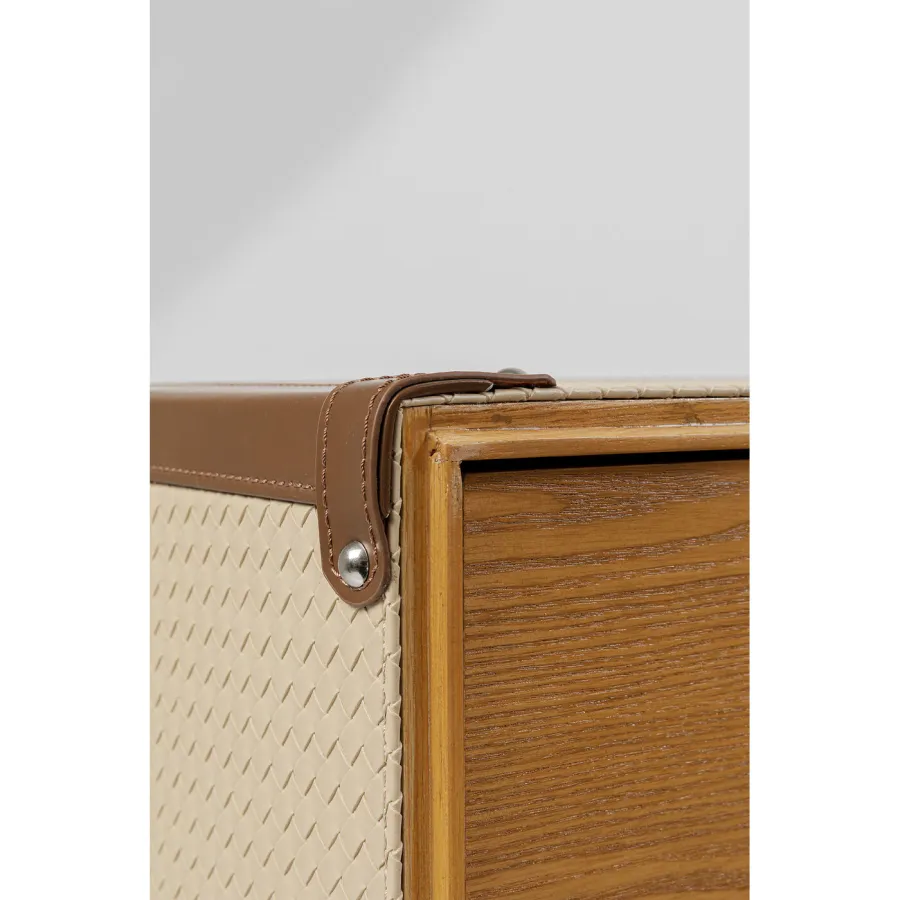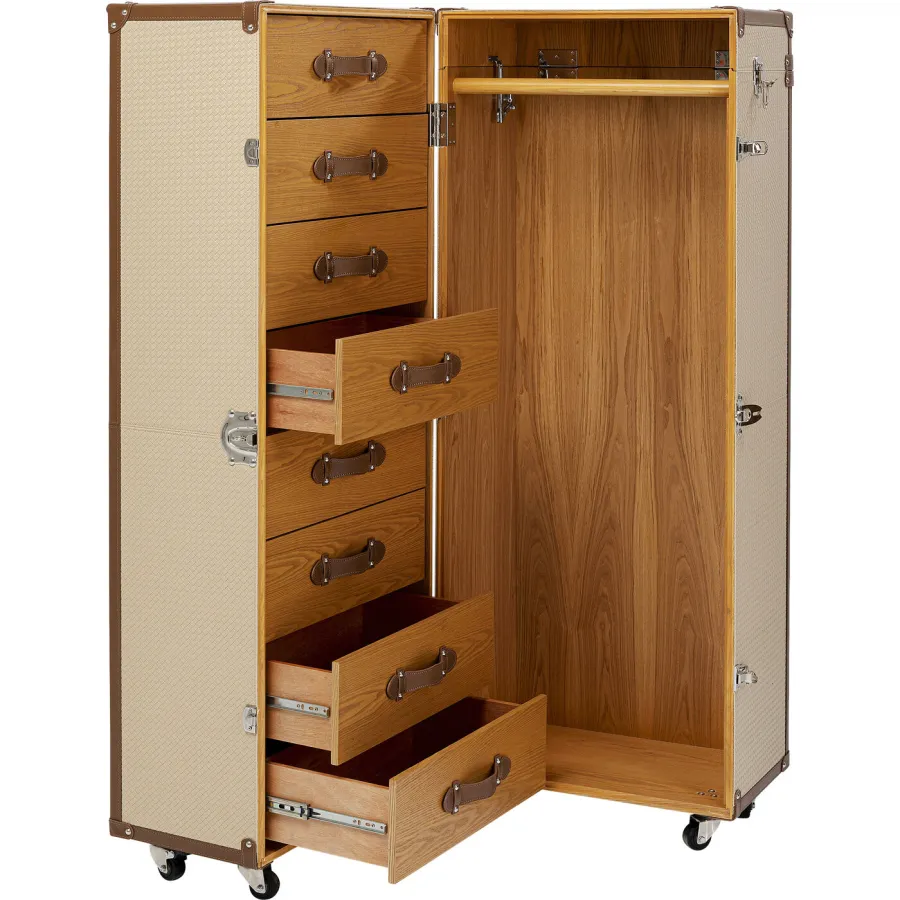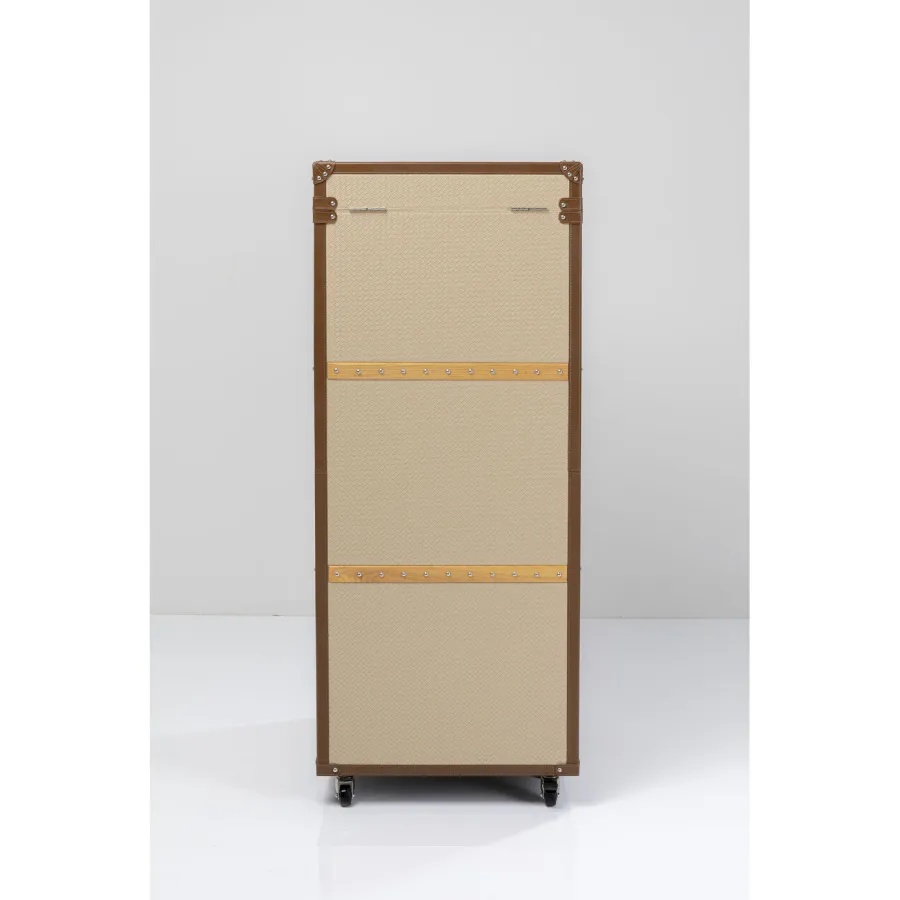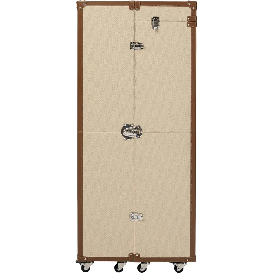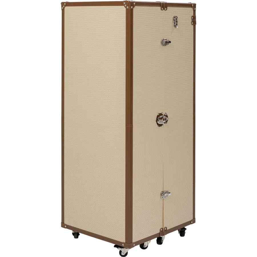 Jak połączyć funkcjonalność, rozwiązania oszczędzające miejsce i styl? Z meblami przypominającymi kufry kabinowe na kółkach, w stroju haute couture! Dzięki kolekcji Venezia wniesiesz styl i miłość do podróży do swojego mieszkania. Powierzchnia kufra posiada łatwy w pielęgnacji pokrowiec wykonany z powlekanej tkaniny o klasycznym wyglądzie wikliny. Kreatywny projekt w kształcie kufra kabinowego sprawia, że szafa jest prawdziwą atrakcją. Ten kreatywny mebel, który pełni funkcję szafy w sypialni, zapewnia dużo miejsca na ubrania. Świetnie sprawdzi się także jako garderoba w przedpokoju. Praktyczne kółka sprawiają, że jest mobilny i wszechstronny. Szafa to must-have dla wszystkich, którzy chcą połączyć nowoczesny design z funkcjonalnością
