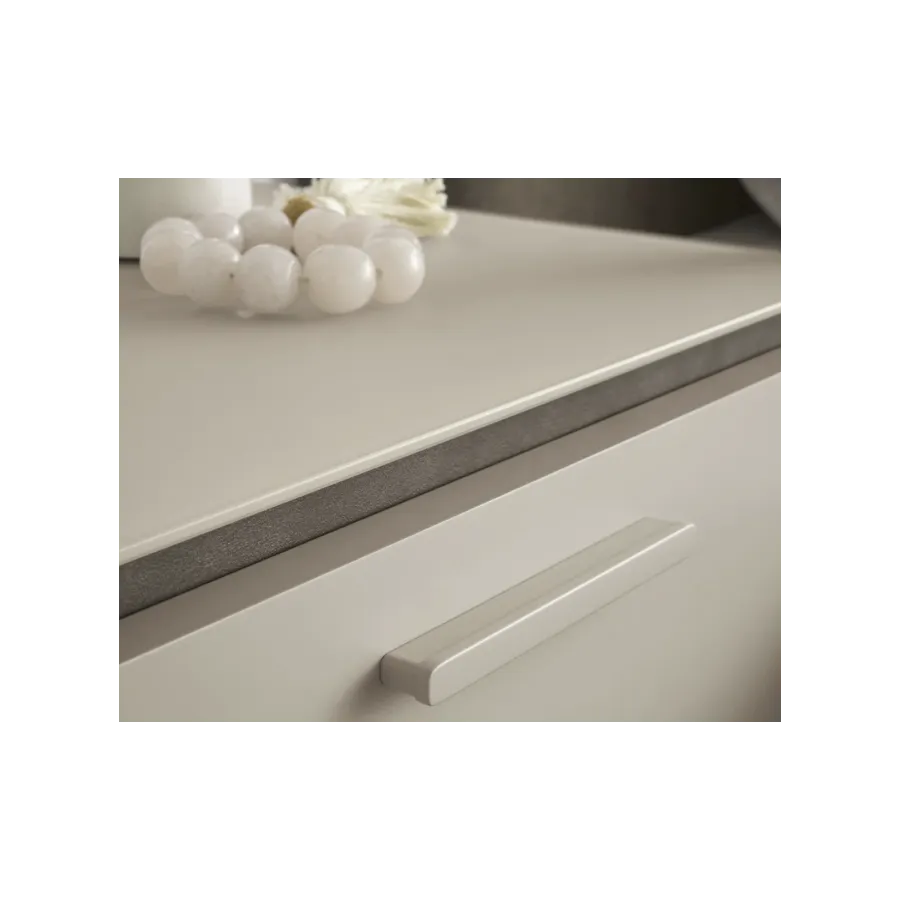 Szafka ma zaokrąglone narożniki i subtelnie cofnięte nóżki, dzięki czemu prezentuje się lekko i nowocześnie. Dwukolorowa kolorystyka – połączenie ciepłej kości słoniowej z ramą w odcieniu ciemnego taupe – nadaje jej szlachetnego, spokojnego charakteru.