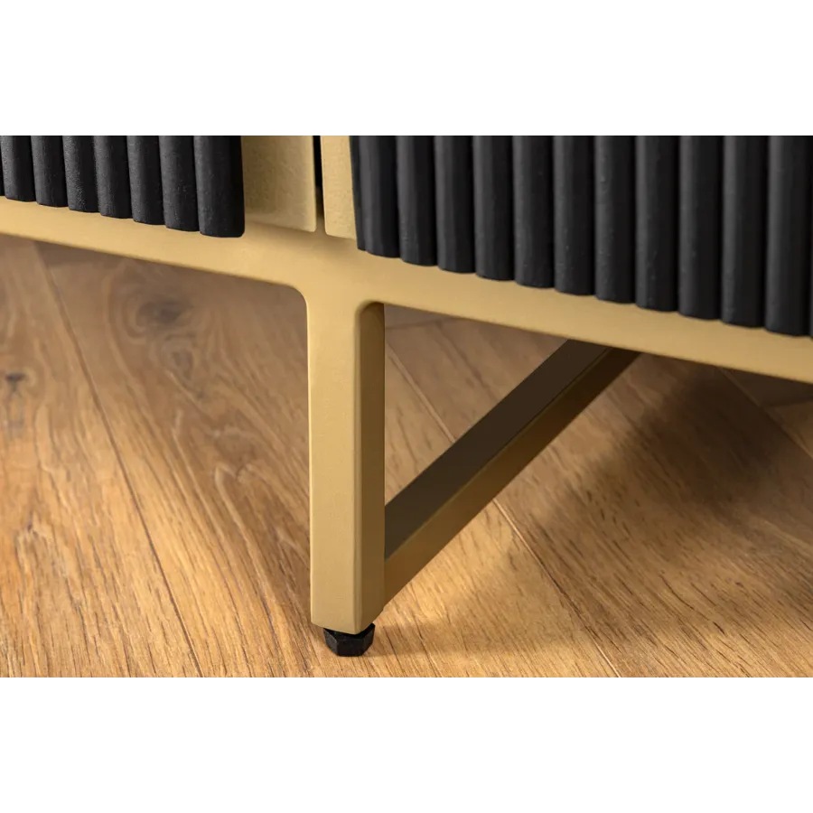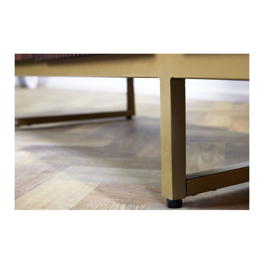 Produkt ten to niezwykły mebel, który wkracza do Twojego domu. Duże drzwi wejściowe i korpus wykonano z litego drewna mango. Drewno mango zachwyca ekscytującymi przejściami kolorów i indywidualnym usłojeniem. Zaokrąglone boki, ryflowana drewniana powierzchnia i matowa metalowa rama w kolorze złotym zapewniają idealne połączenie nowoczesnego wyglądu i stylu retro.