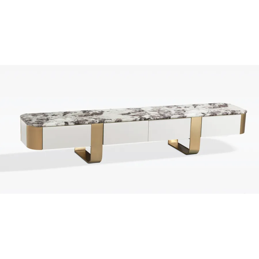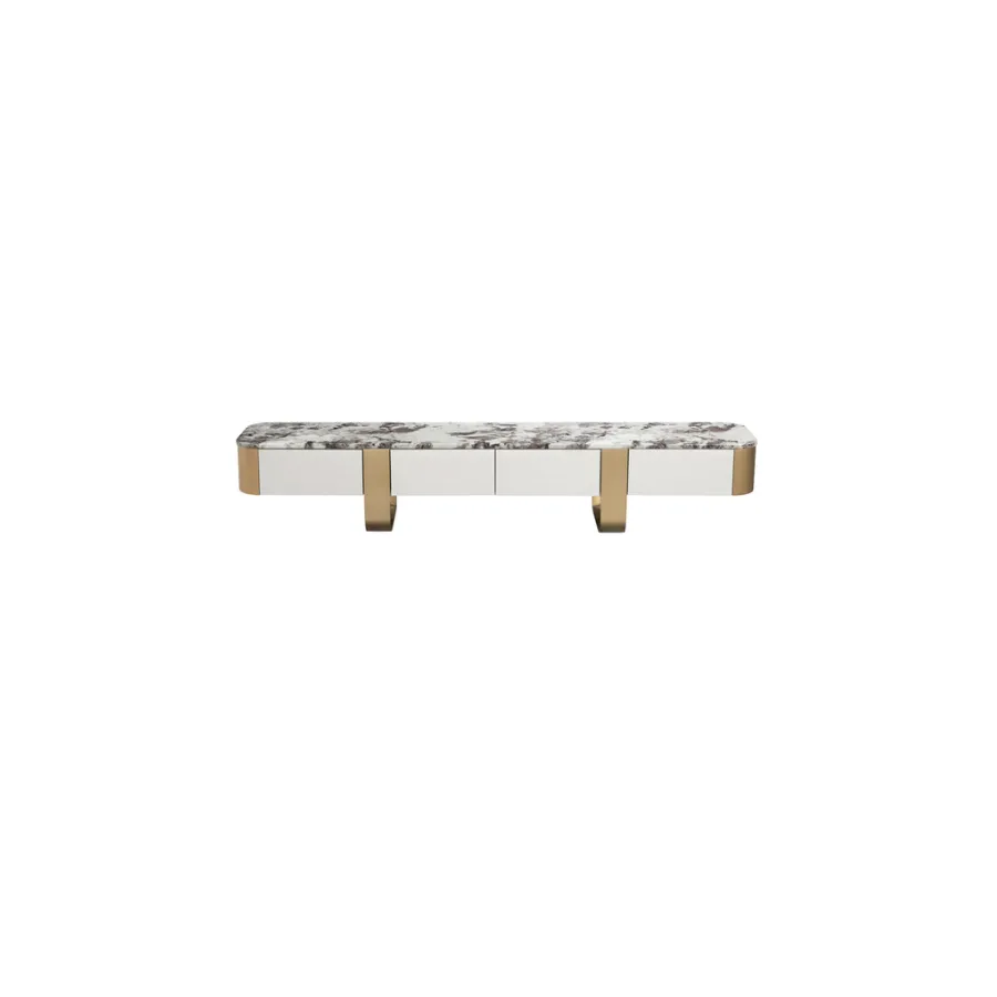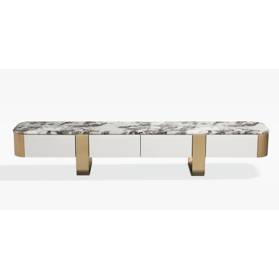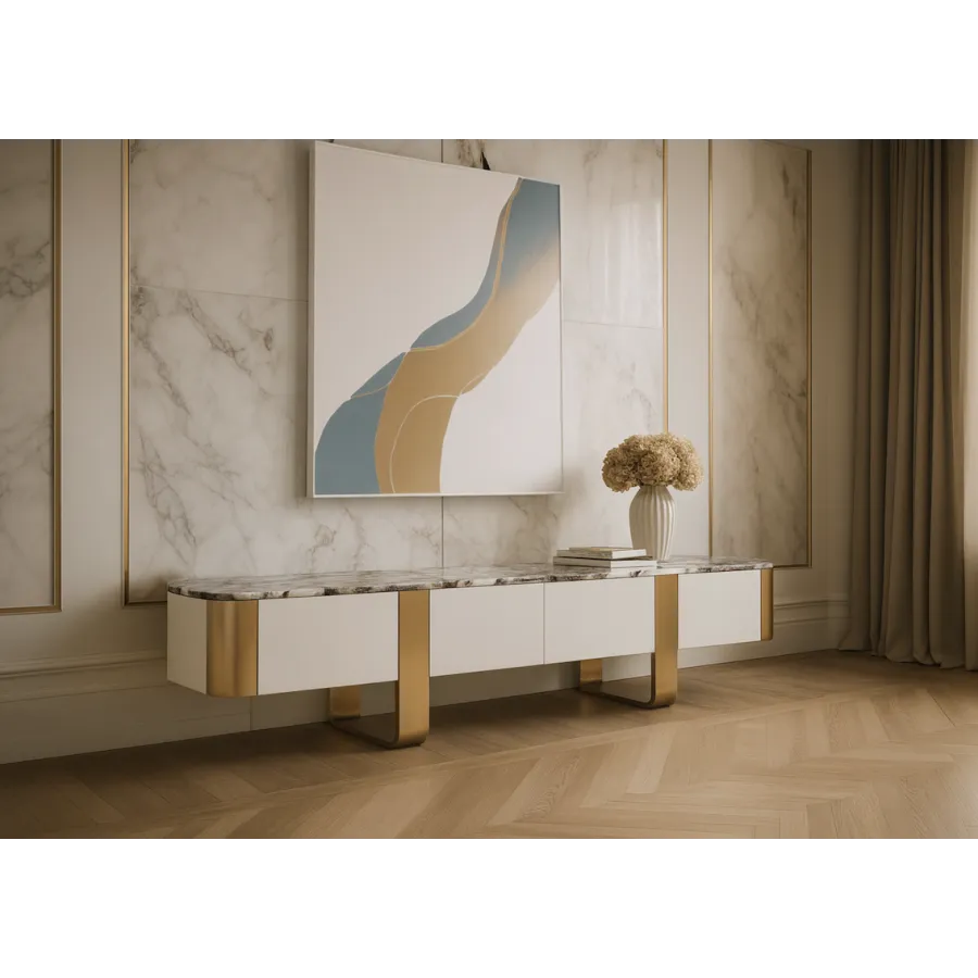 Ta owalna szafka RTV w odcieniu złamanej bieli zachwyca subtelną elegancją i ponadczasowym designem. Jej charakterystycznym elementem są pionowe panele oraz nogi w kolorze szczotkowanego złota, które płynnie łączą się z zaoblonymi bokami mebla, tworząc harmonijną i nowoczesną sylwetkę. Front komody zdobi sześć smukłych szuflad z drobnymi, złotymi uchwytami o biżuteryjnym charakterze. Marmurowy blat — w ciepłej tonacji beżu, szarości i delikatnych żyłowań — dodaje całości luksusowego wykończenia.
