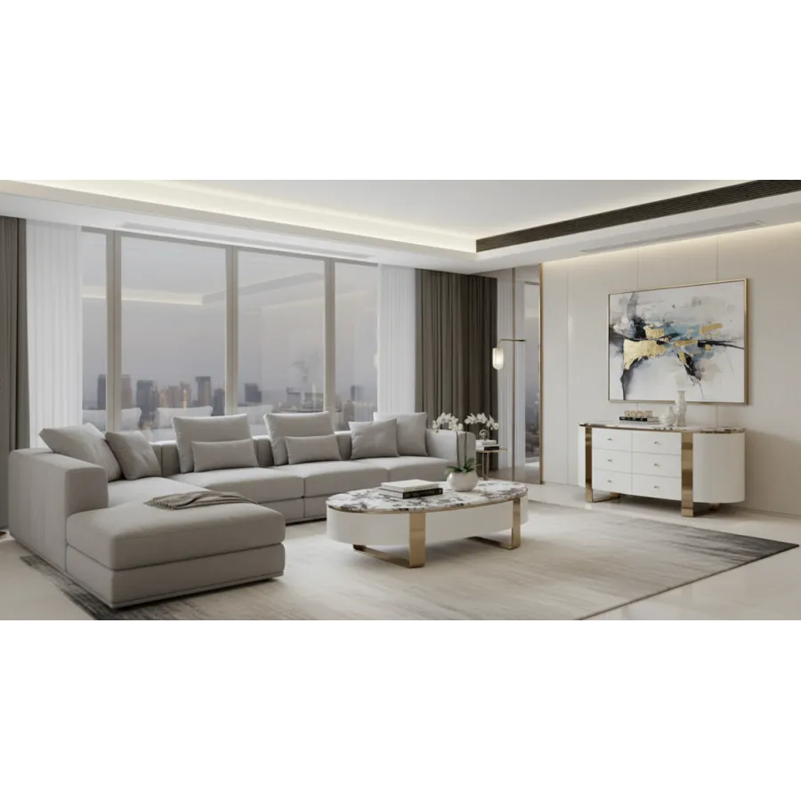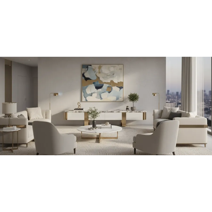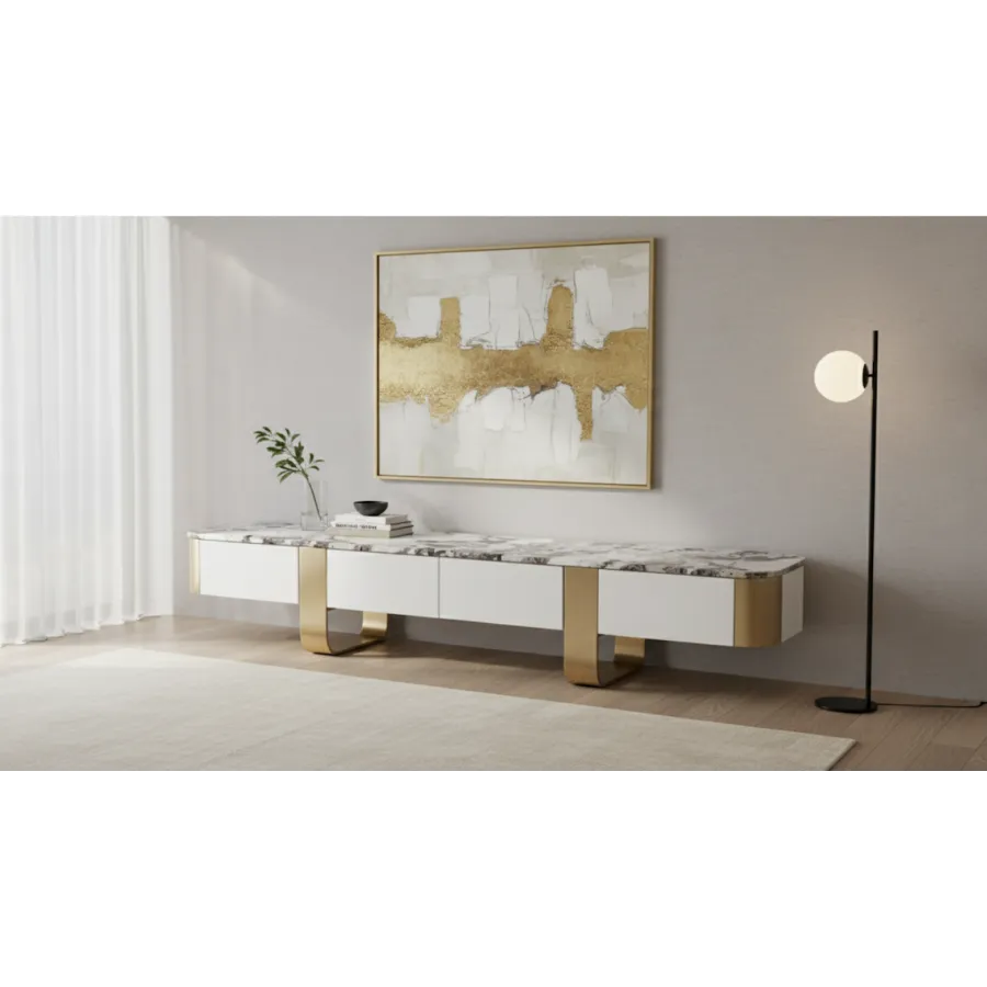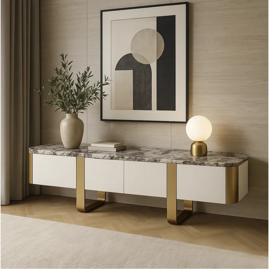 Ta owalna szafka RTV w odcieniu złamanej bieli zachwyca subtelną elegancją i ponadczasowym designem. Jej charakterystycznym elementem są pionowe panele oraz nogi w kolorze szczotkowanego złota, które płynnie łączą się z zaoblonymi bokami mebla, tworząc harmonijną i nowoczesną sylwetkę. Front komody zdobi sześć smukłych szuflad z drobnymi, złotymi uchwytami o biżuteryjnym charakterze. Marmurowy blat — w ciepłej tonacji beżu, szarości i delikatnych żyłowań — dodaje całości luksusowego wykończenia.