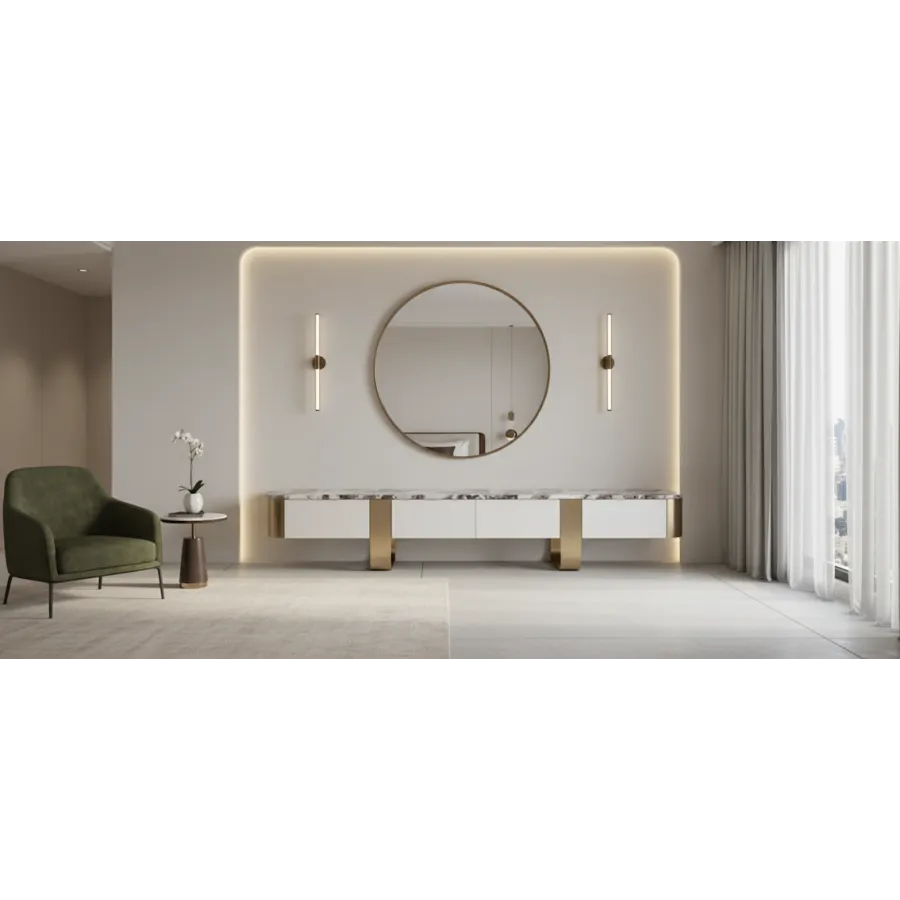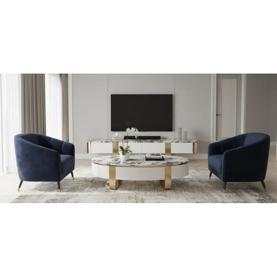 Stylowa, owalna szafka RTV w odcieniu złamanej bieli zachwyca elegancką formą i dopracowanymi detalami. Złote akcenty — subtelna listwa podblatowa oraz smukłe nogi płynnie łączące się z frontami — nadają jej wyrafinowanego charakteru. Całość dopełnia blat o marmurowym wykończeniu, który podkreśla luksusowy, ponadczasowy styl mebla.