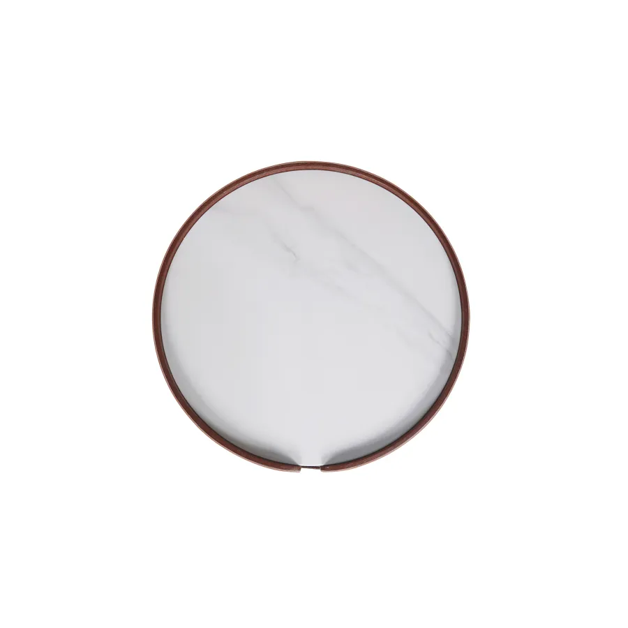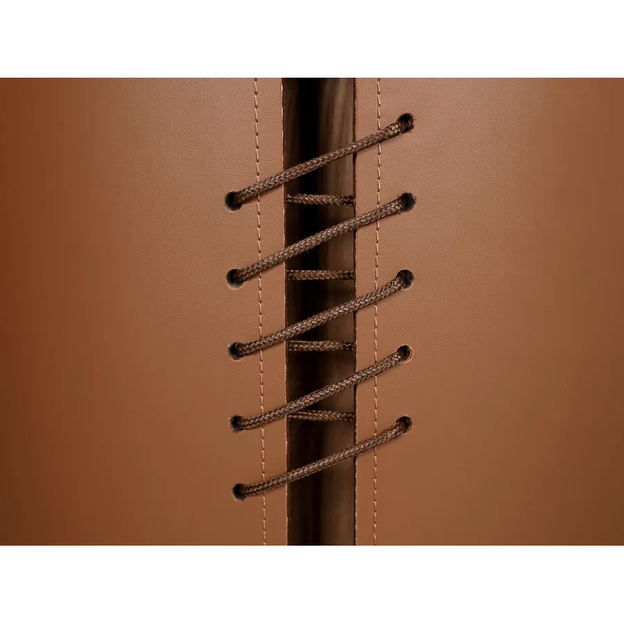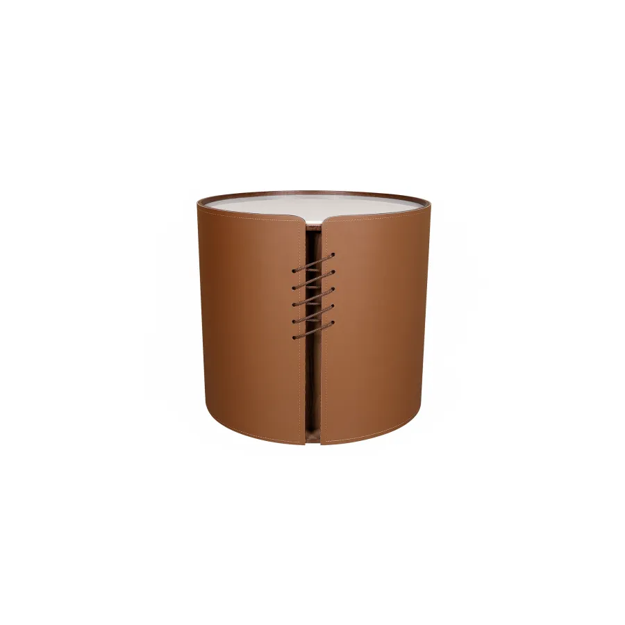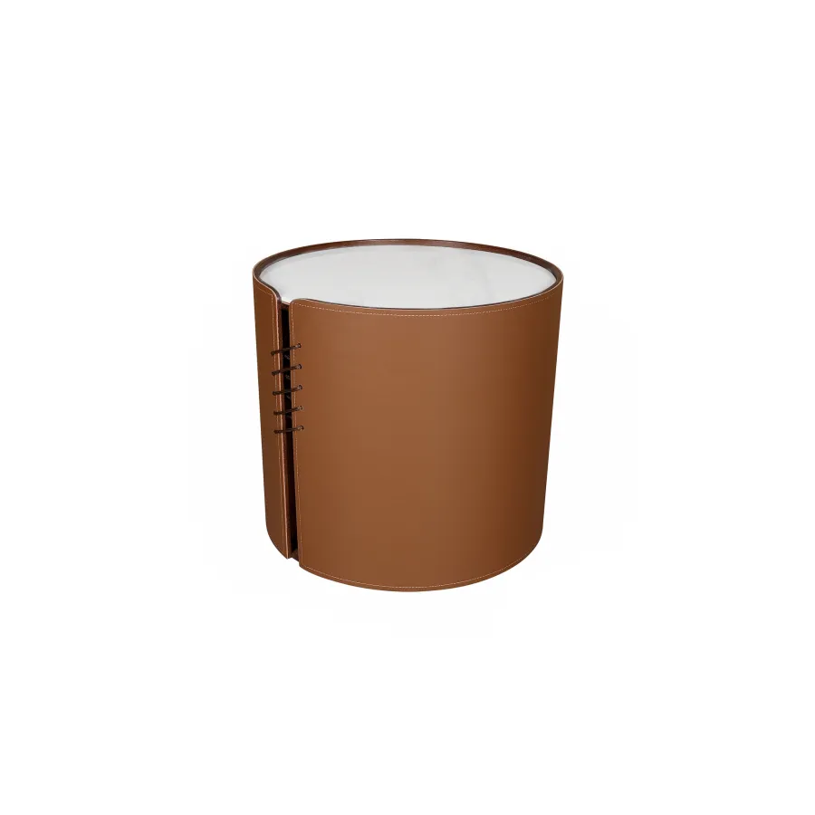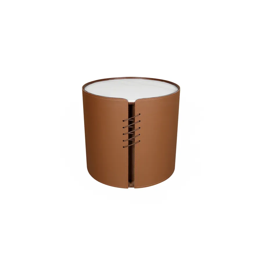 • Nowoczesny stolik w kształcie walca, pokryty ekoskórą z widocznymi przeszyciami i ozdobnym wiązaniem. Blat wykonany jest z kamiennego spieku imitującego marmur.