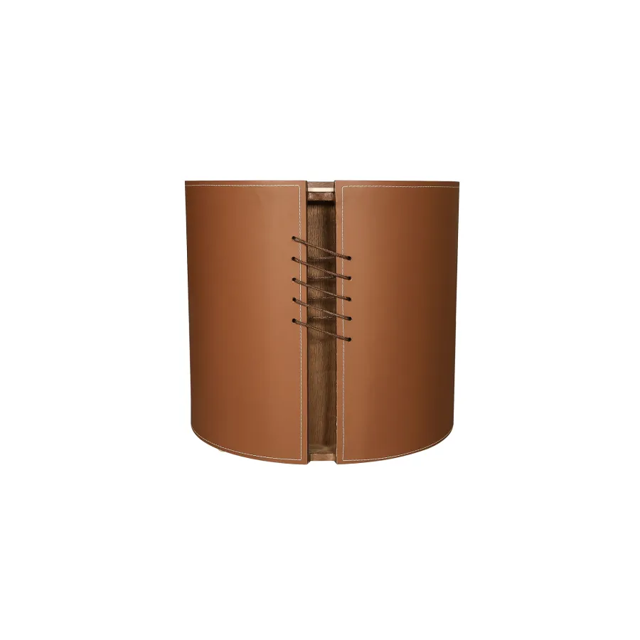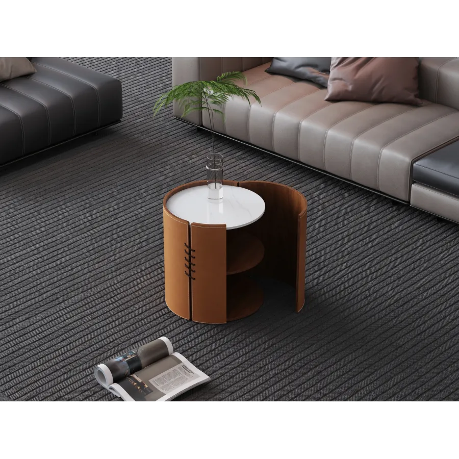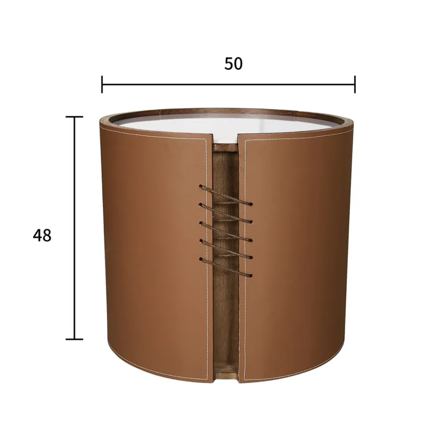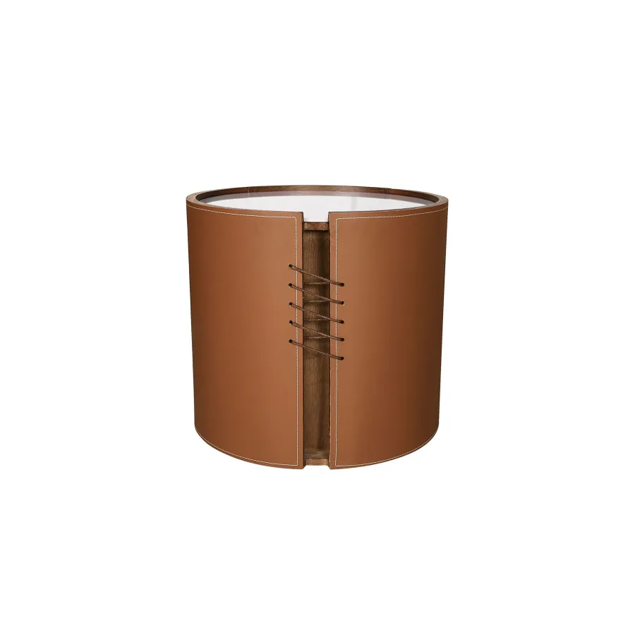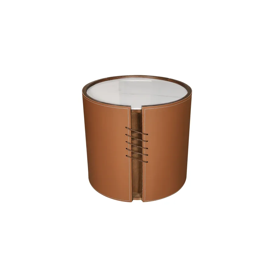 Nowoczesny stolik w kształcie walca, pokryty ekoskórą z widocznymi przeszyciami i ozdobnym wiązaniem. Blat wykonany jest z kamiennego spieku imitującego marmur.