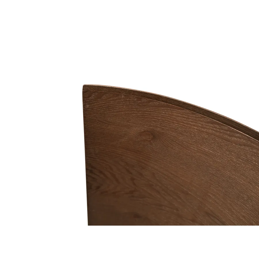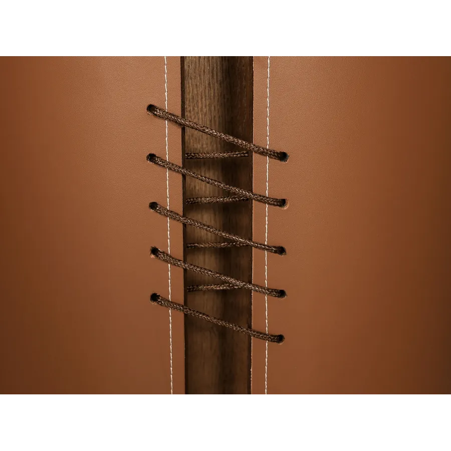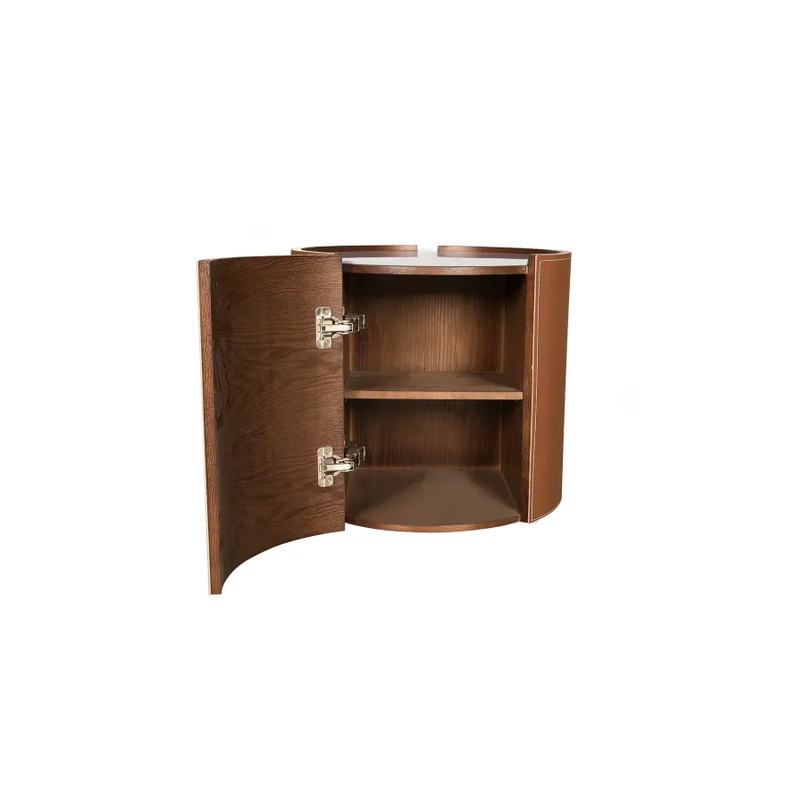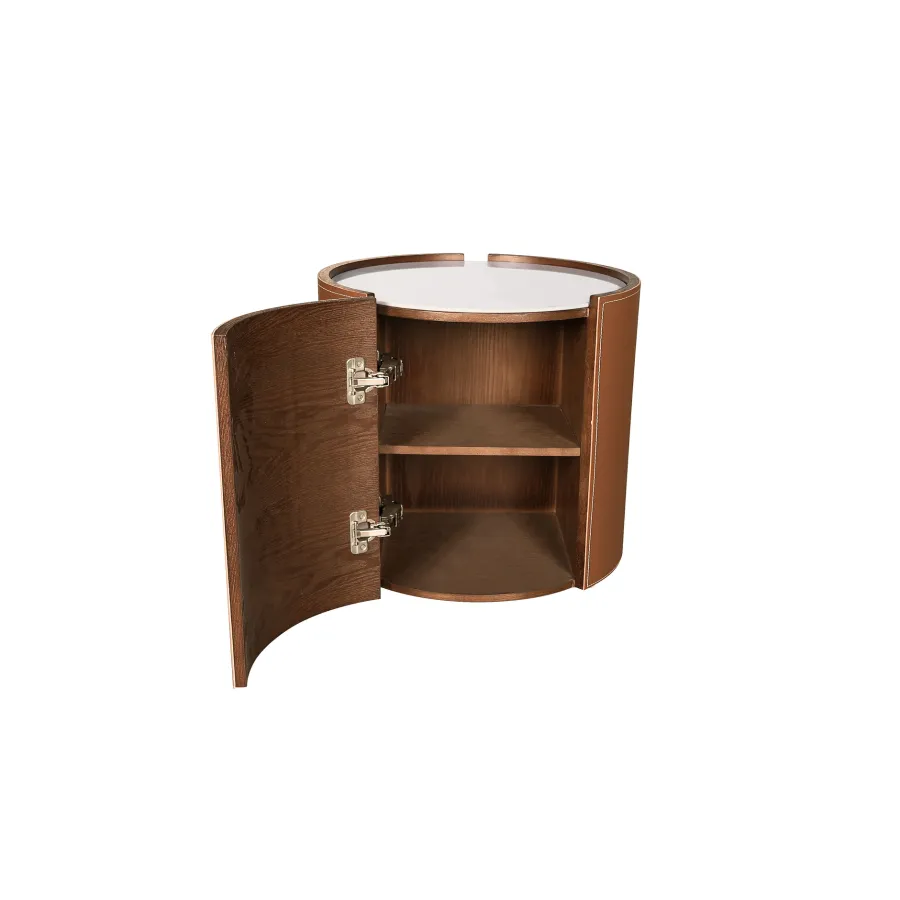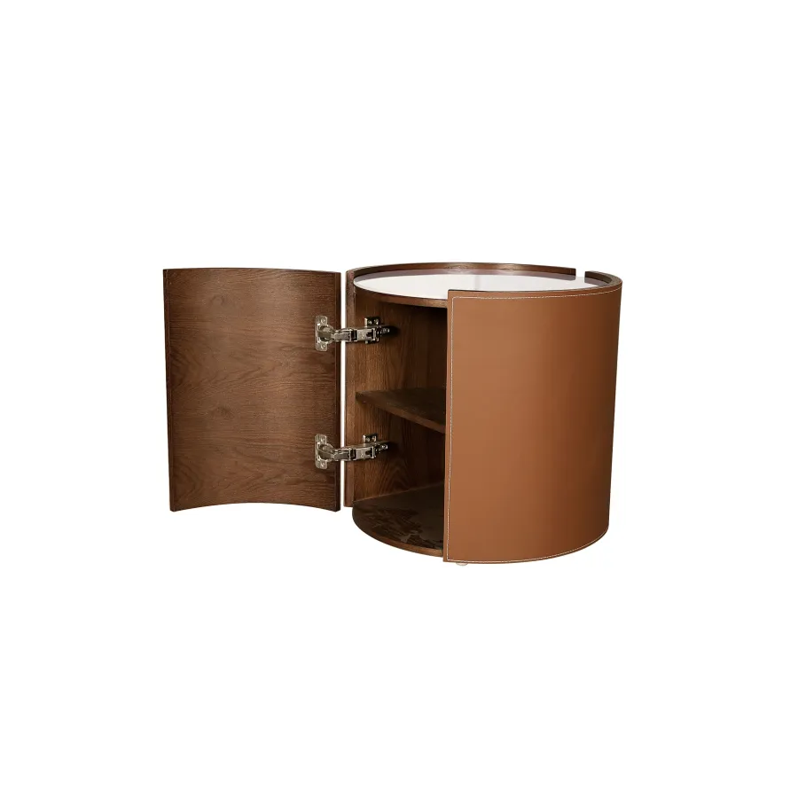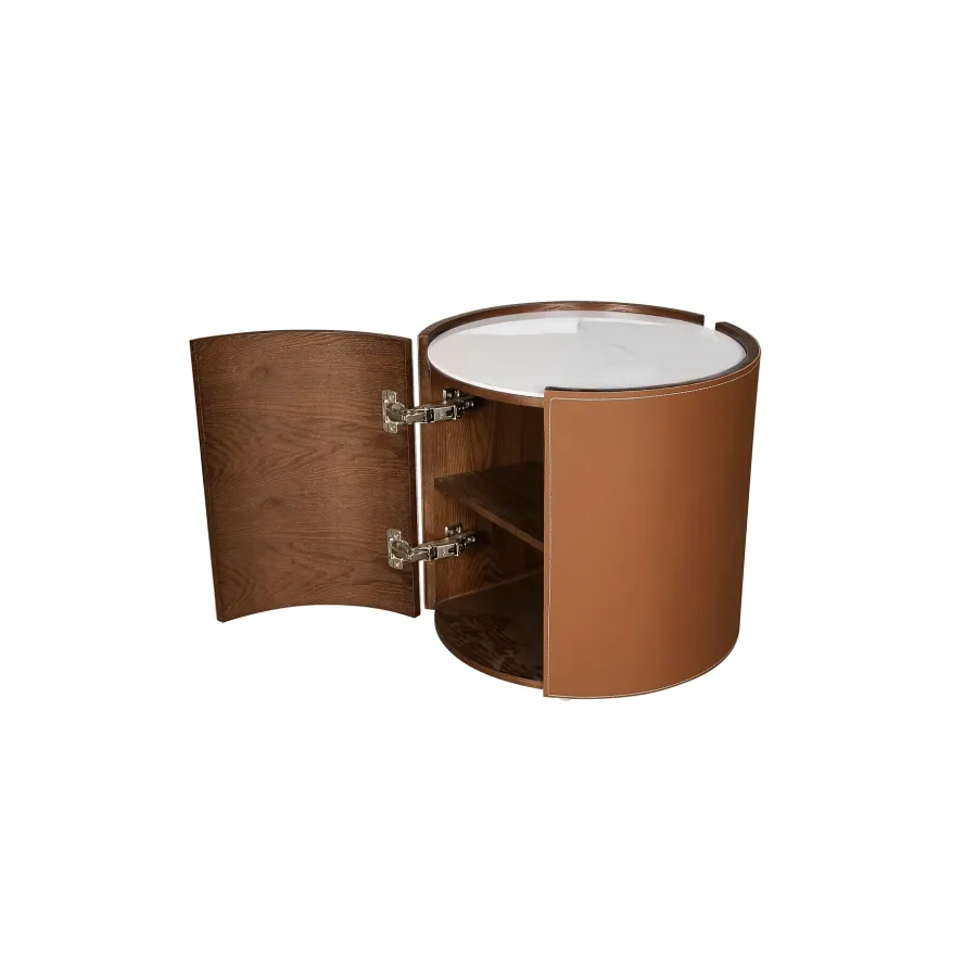 Nowoczesny stolik w kształcie walca, pokryty ekoskórą z widocznymi przeszyciami i ozdobnym wiązaniem. Blat wykonany jest z kamiennego spieku imitującego marmur.