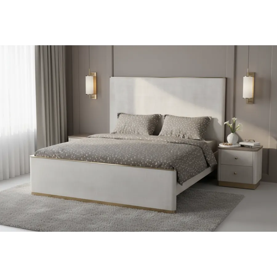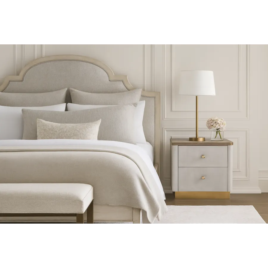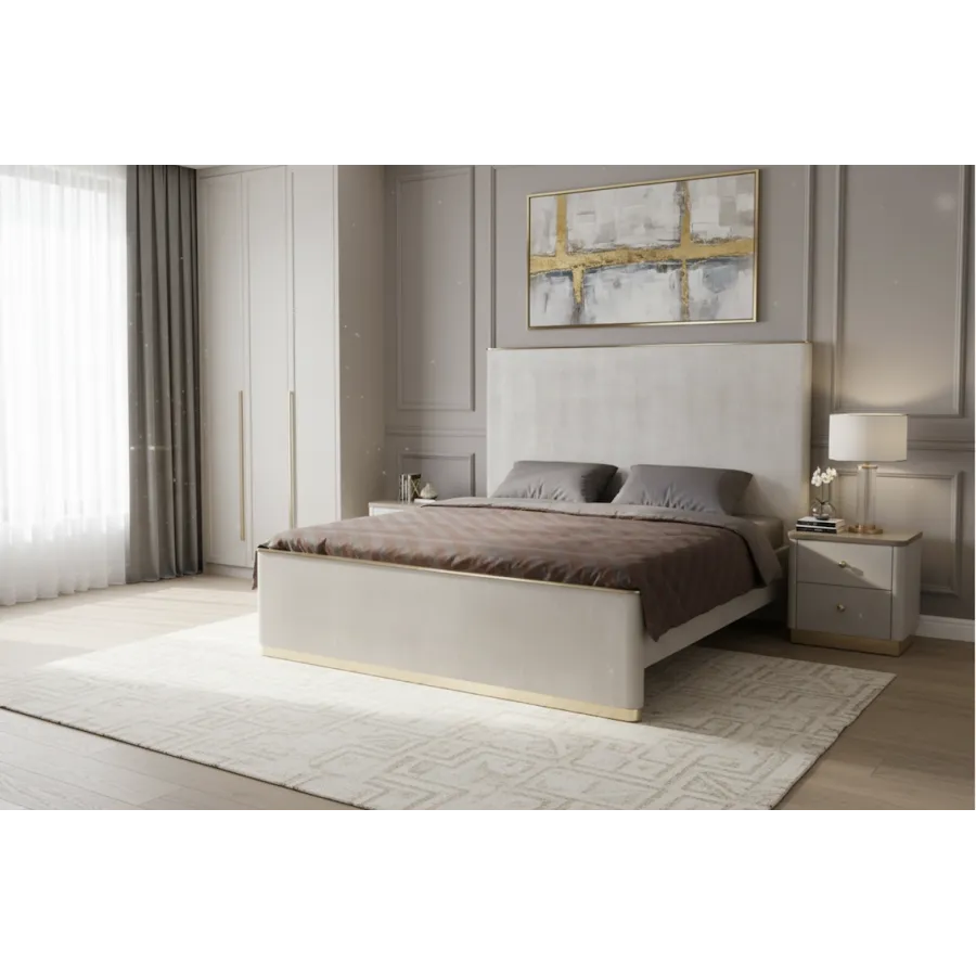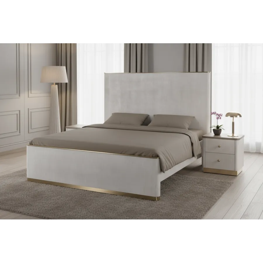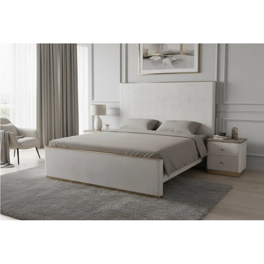 Dolna część szafki zdobiona jest złotą podstawą, doskonale komponującą się z metalowymi uchwytami w kolorze szampańskiego złota. Dwie pojemne szuflady zapewniają praktyczne miejsce do przechowywania, a gładki blat stanowi idealną przestrzeń na lampkę, książkę lub dekoracje.
