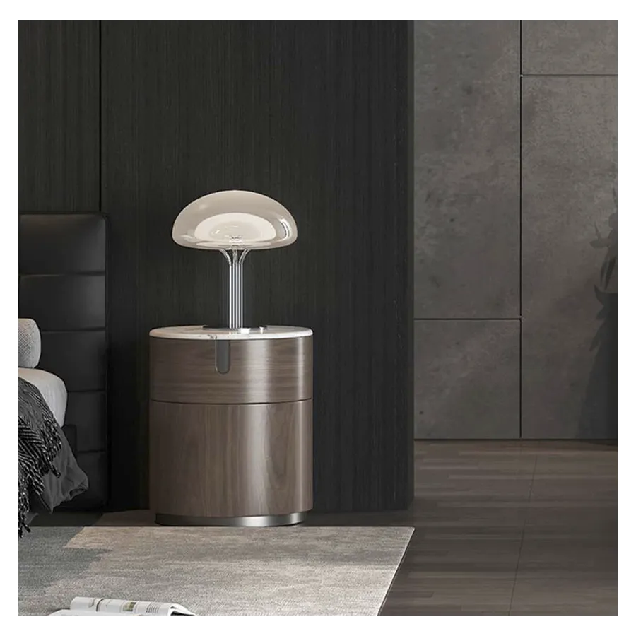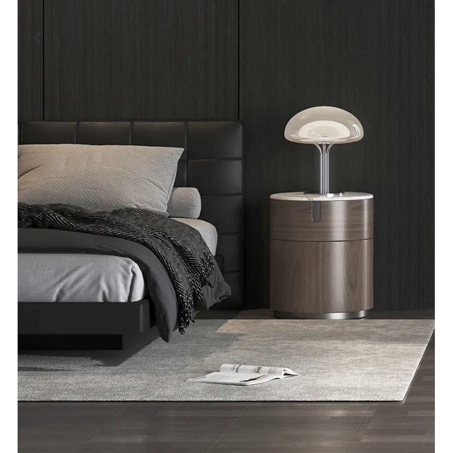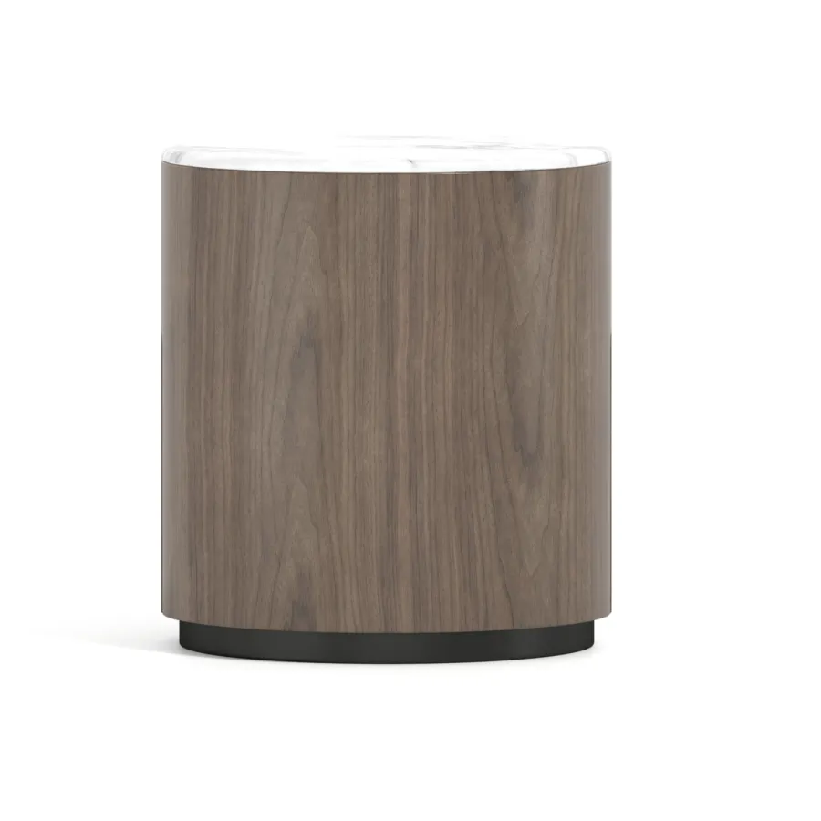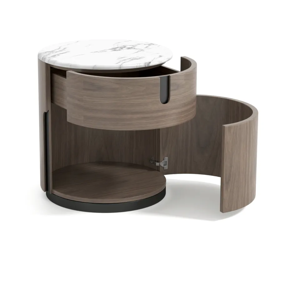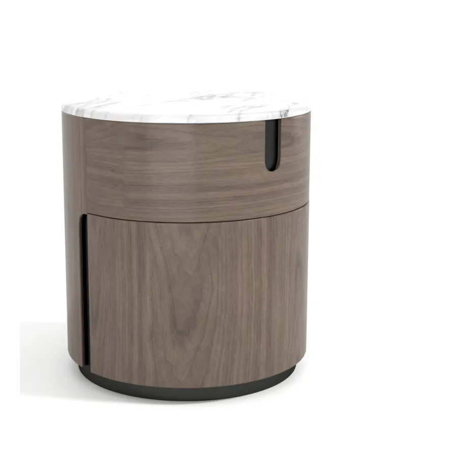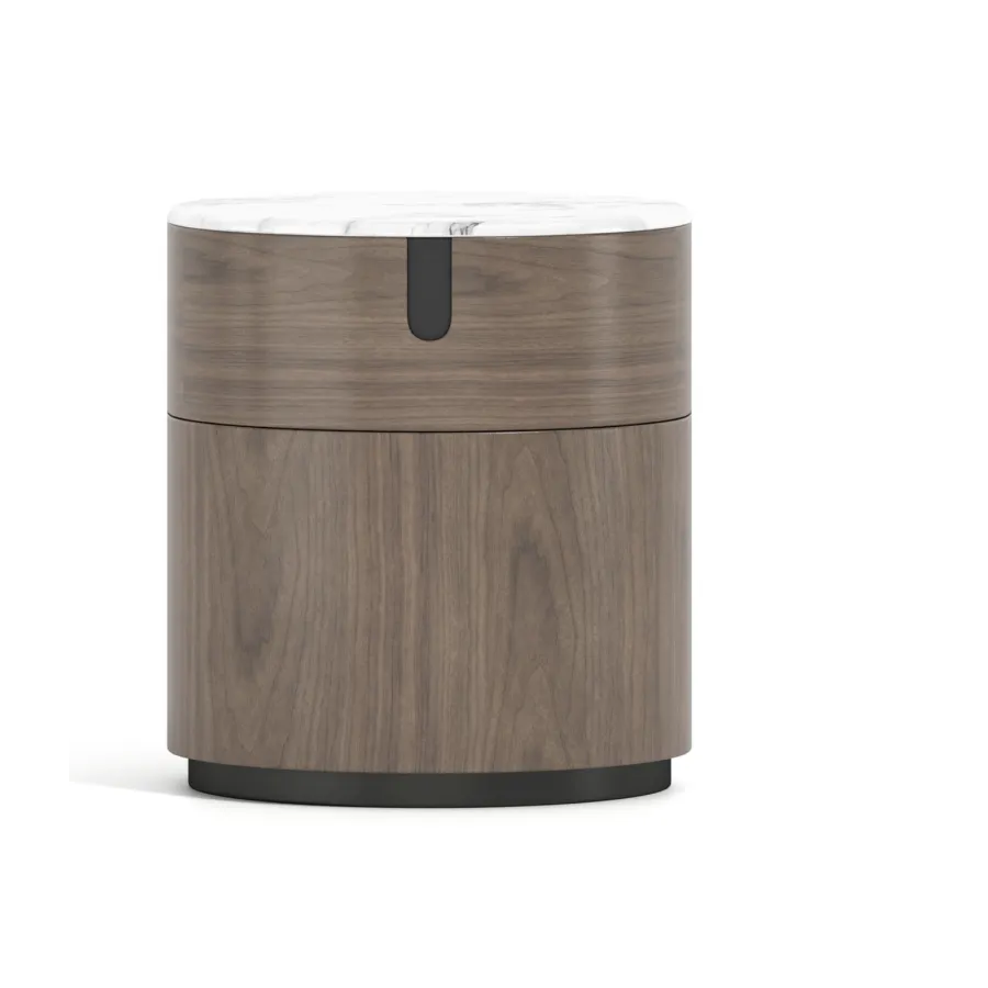 Nowoczesna szafka w kolorze orzecha włoskiego z widocznymi słojami drewna. Blat wykonany z naturalnego marmuru w kolorze białym. Opływowa linia bryły została podkreślona detalami w postaci elementów w kształcie łuków.