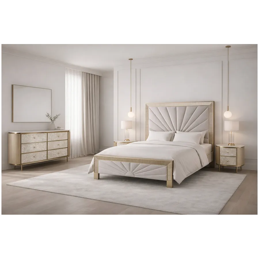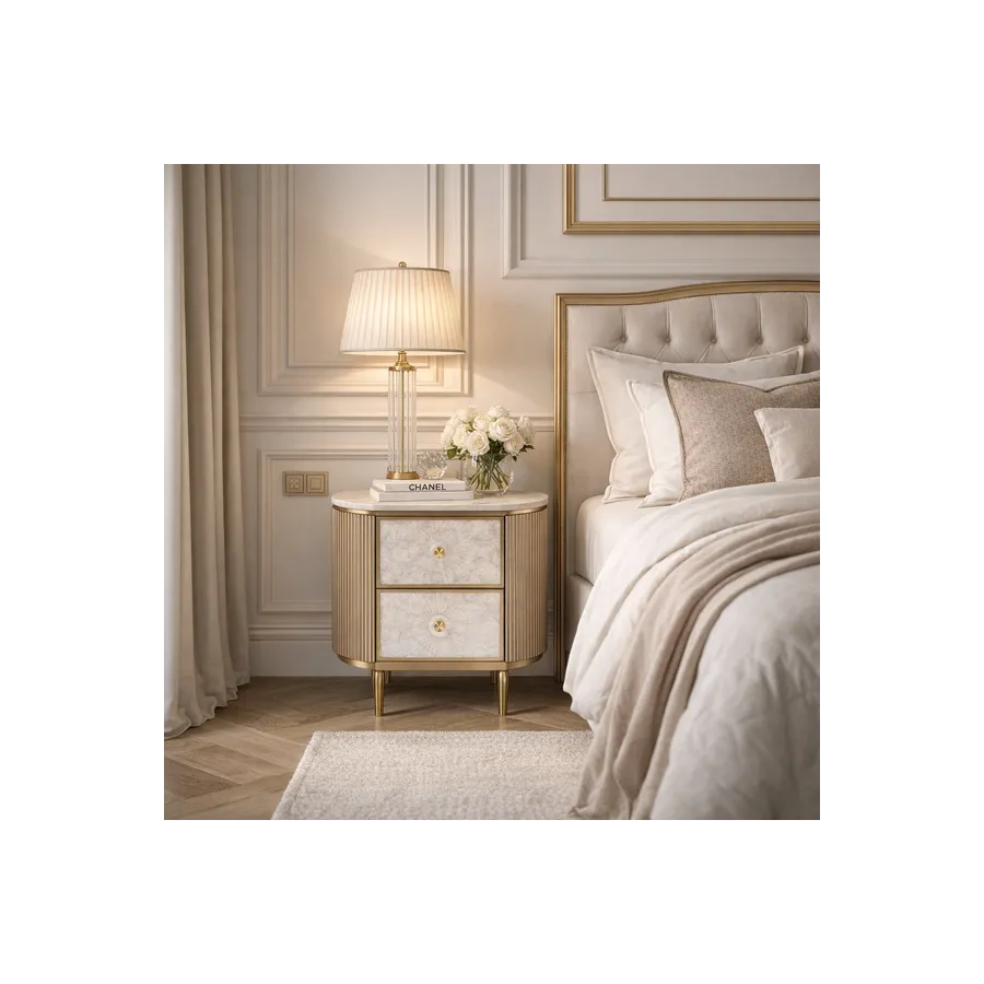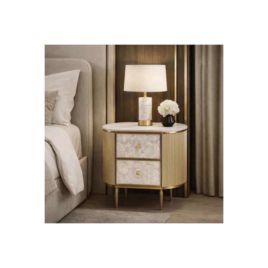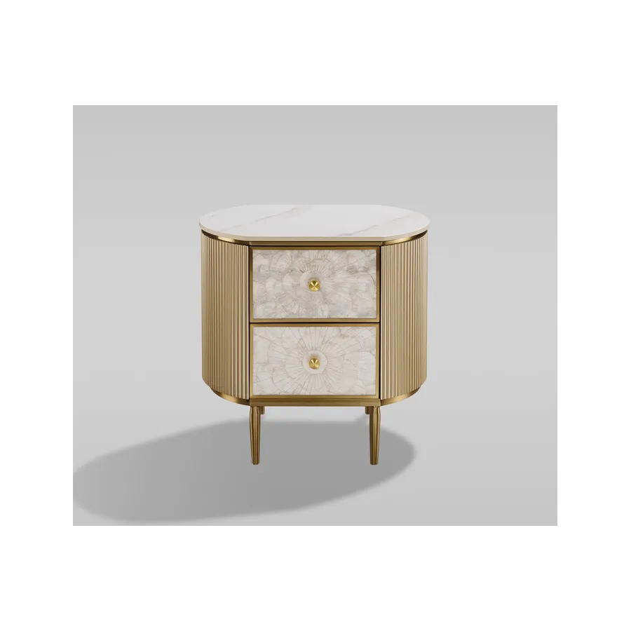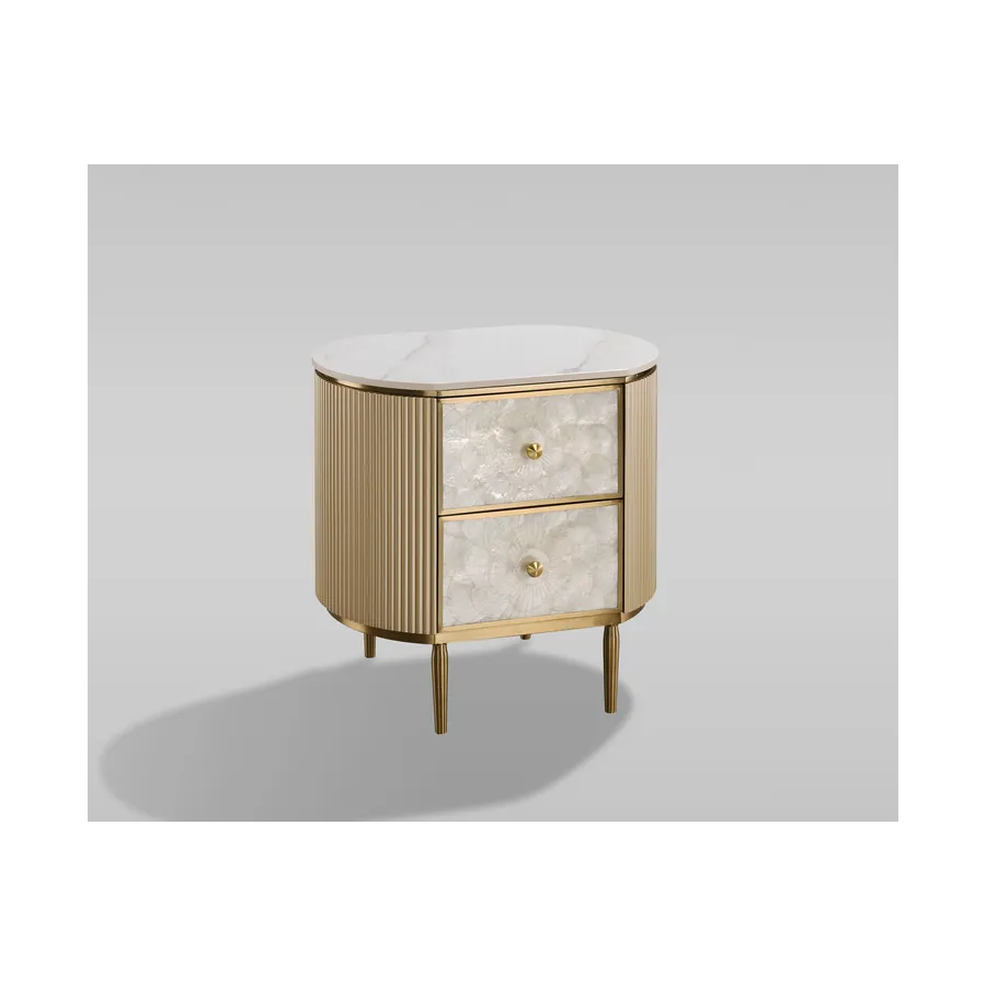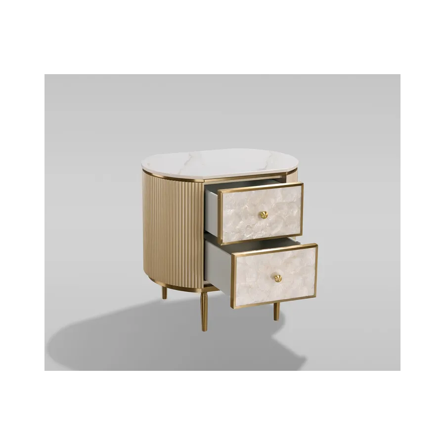 Oryginalna szafka nocna w kolorze szampańskiego złota z frontem wykonanym z naturalnej muszli układającej się w symetryczny wzór. Korpus posiada ryflowane drewno oraz blat z wykończeniem marmurowym.
