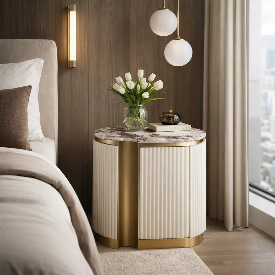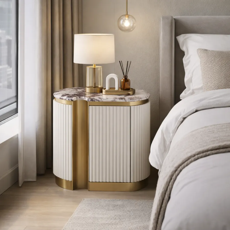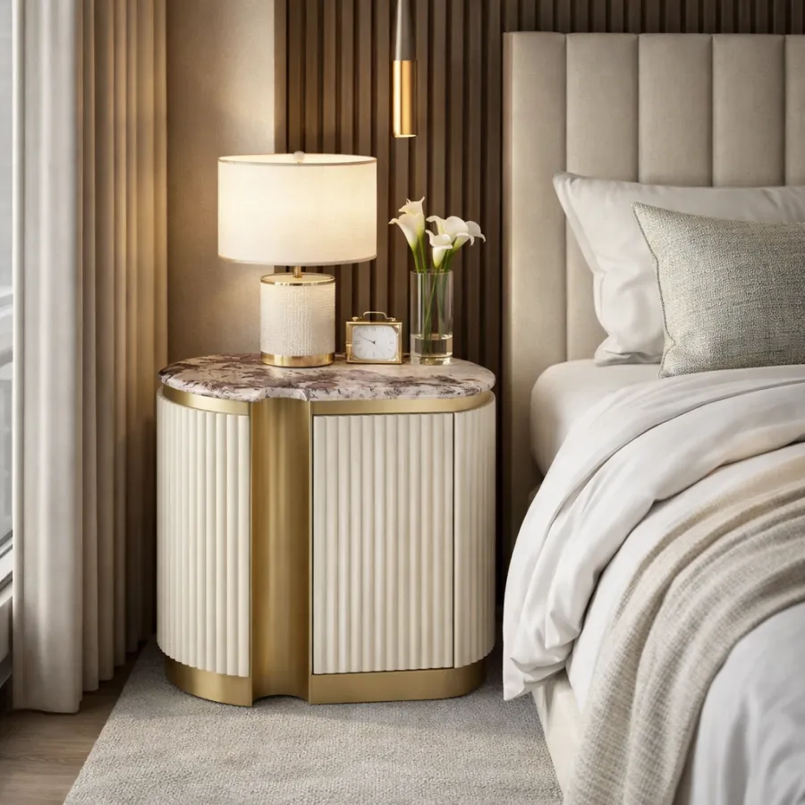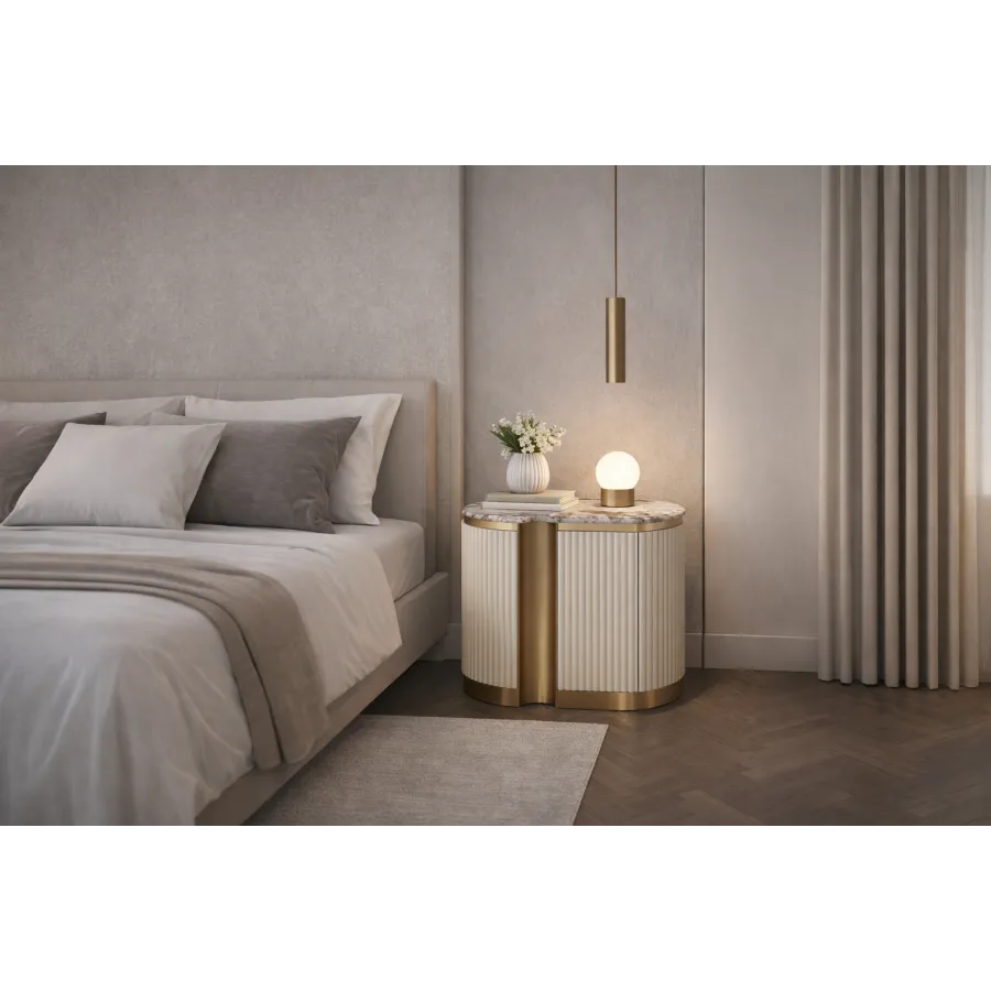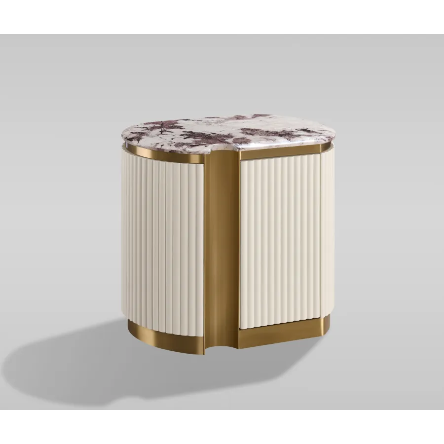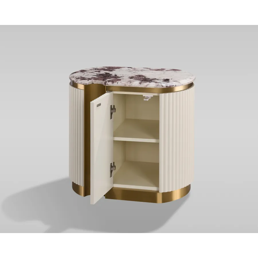 Stylowa szafka nocna - lewa w kolorze białym ecru ze złotymi akcentami i wieńcem dolnym. Korpus posiada ryflowane drewno. Blat ma wykończenie marmurowe.
