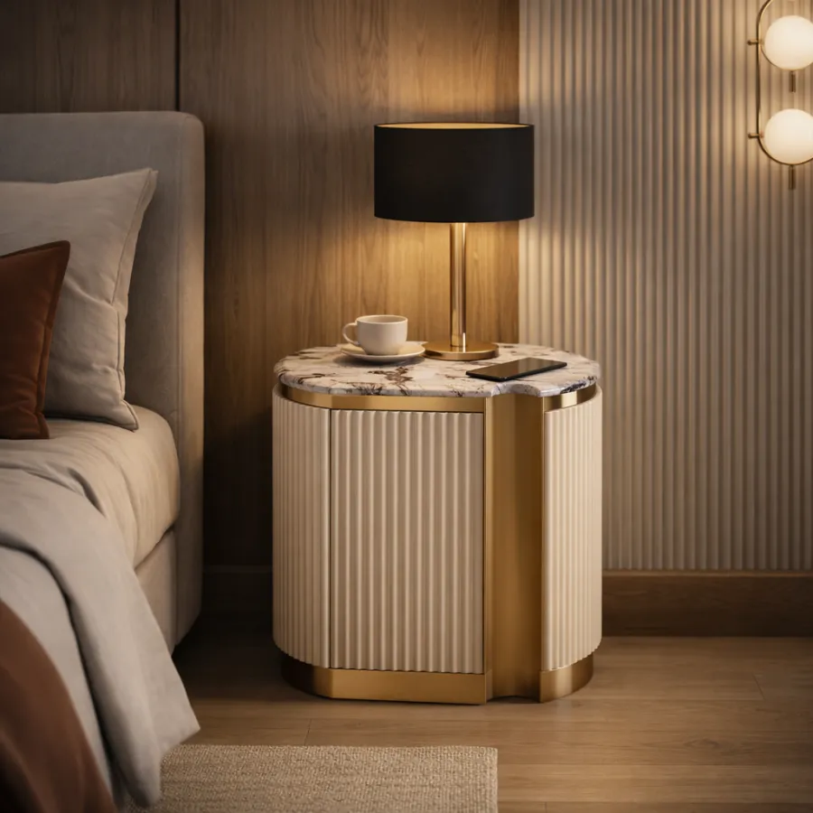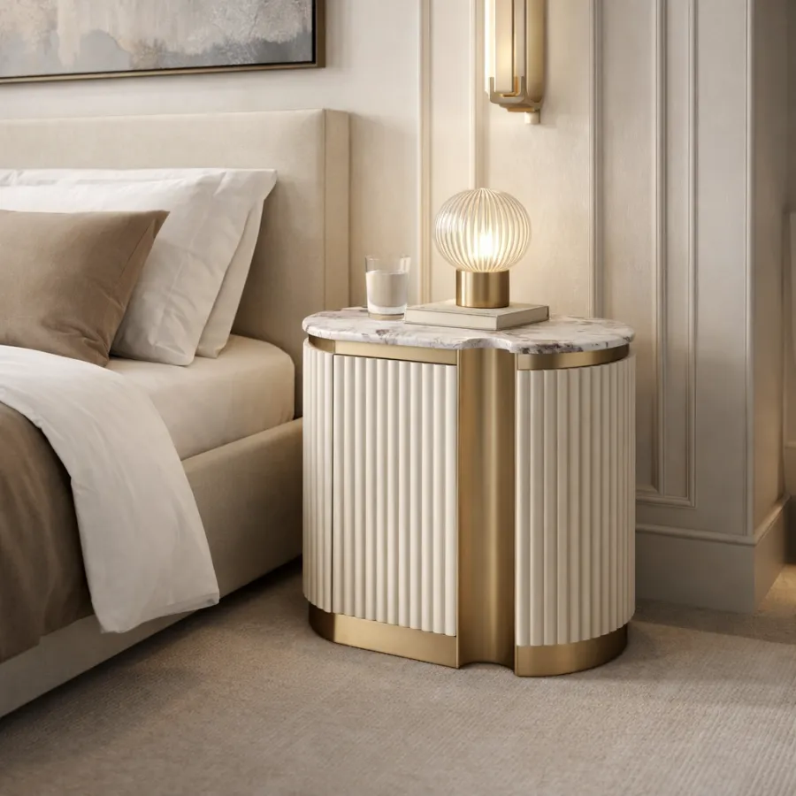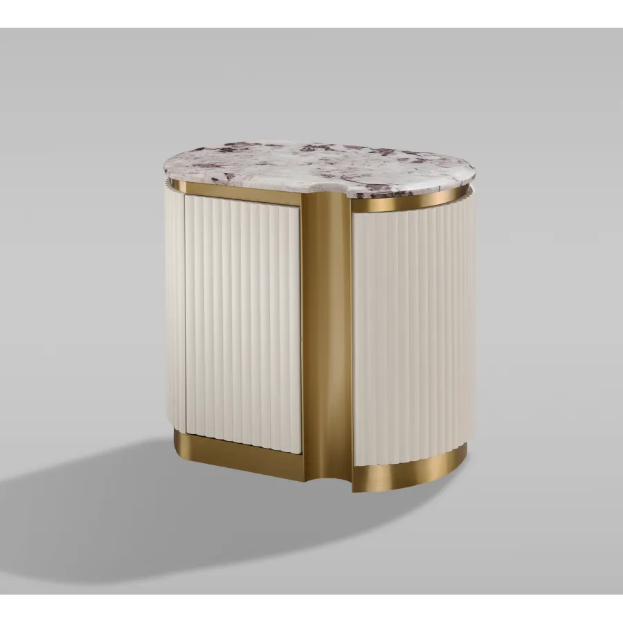 Stylowa szafka nocna - prawa w kolorze białym ecru ze złotymi akcentami i wieńcem dolnym. Korpus posiada ryflowane drewno. Blat ma wykończenie marmurowe.