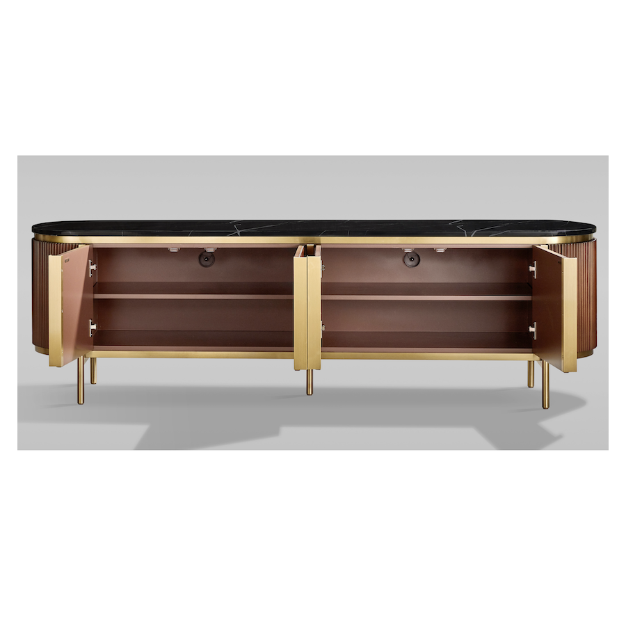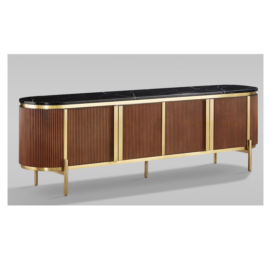 Stylowa komoda w kolorze kasztanowym ze złotymi akcentami i nogami. Korpus posiada ryflowane drewno. Blat ma wykończenie marmurowe.