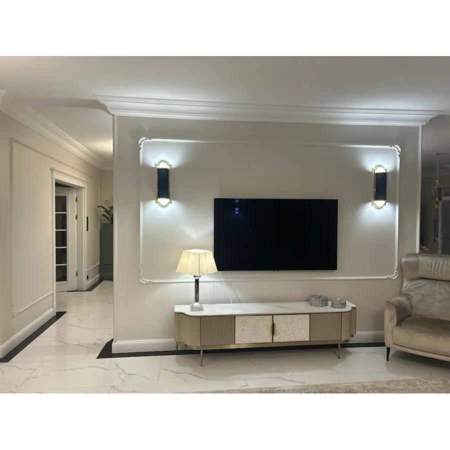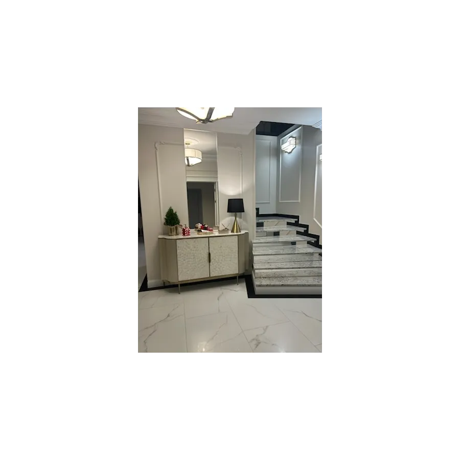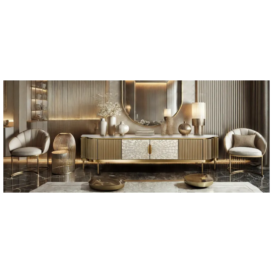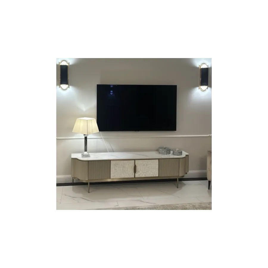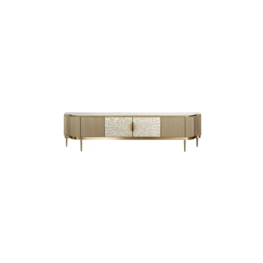 Stylowa szafka rtv w kolorze szampańskiego złota z frontem wykonanym z naturalnej muszli układającej się w symetryczny wzór. Korpus posiada ryflowane drewno oraz blat z wykończeniem marmurowym