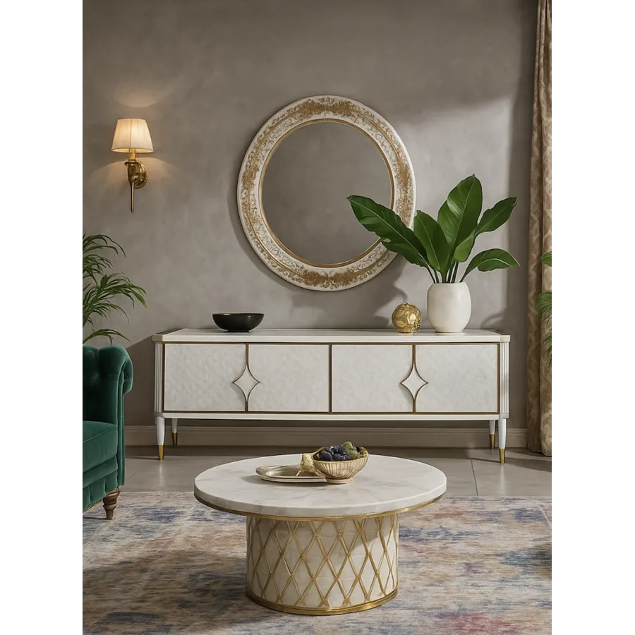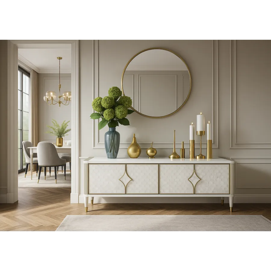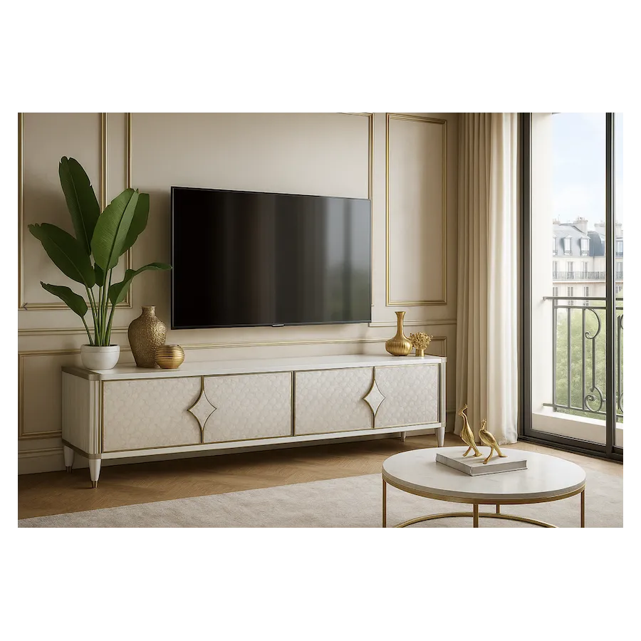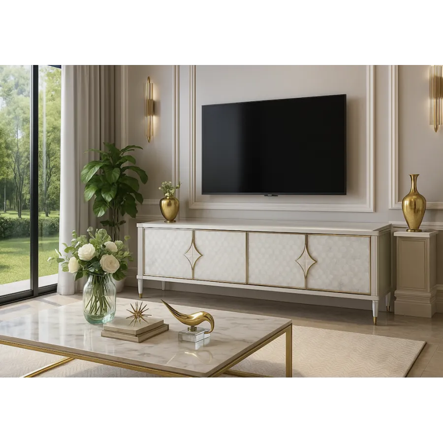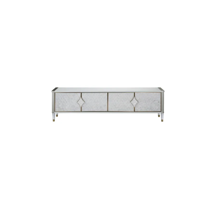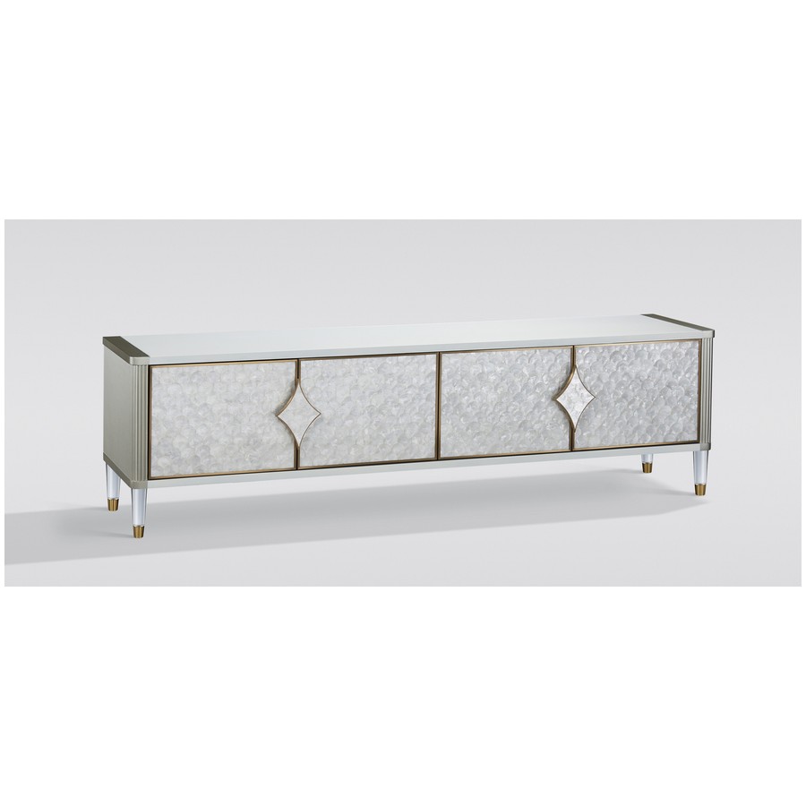 Stylowa komoda rtv w w kolorze białym ecru z frontem wykonanym z naturalnej muszli układającej się na wzór rybich łusek. Drzwi okalają złote listwy a całości dopełniają masywne uchwyty w kształcie karo. Białe nóżki zakończone są złotym akcentem.
