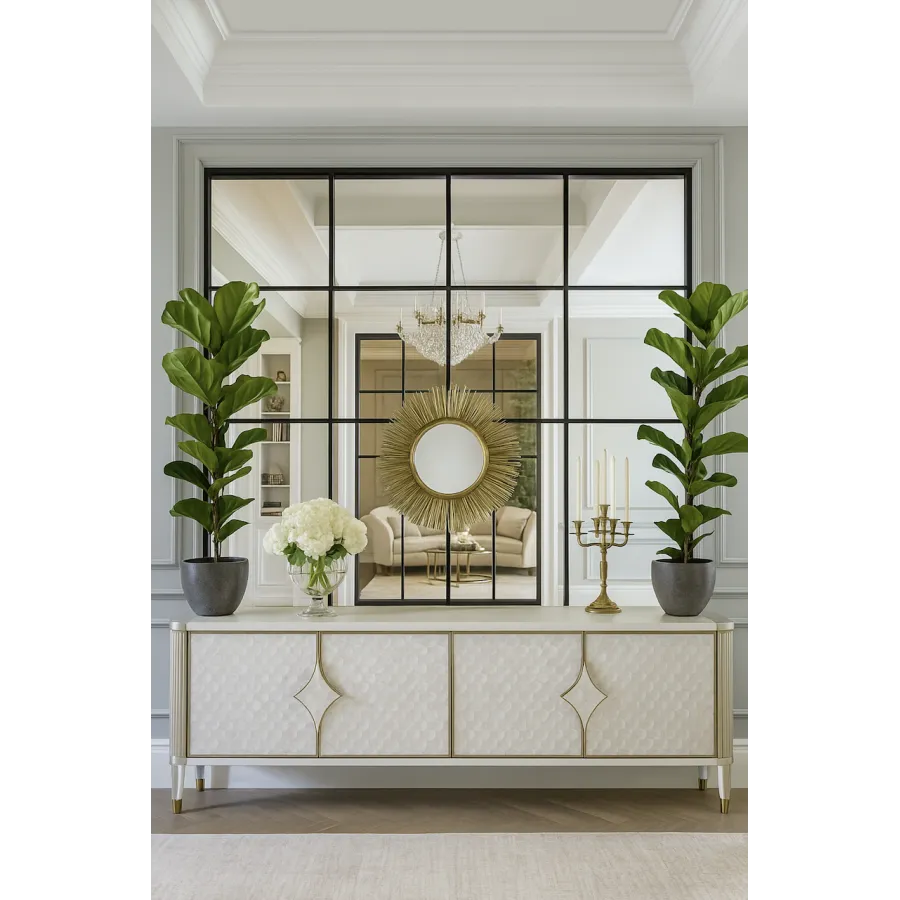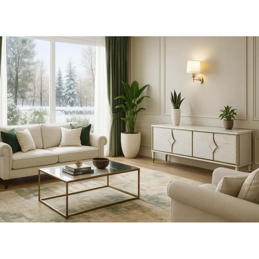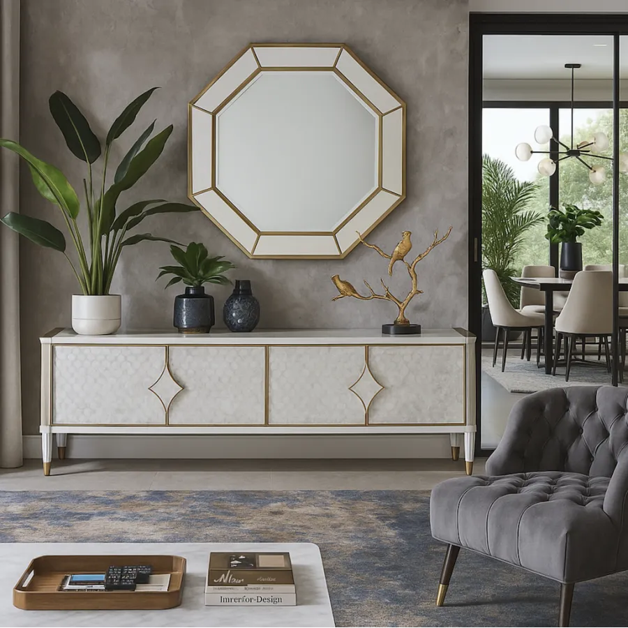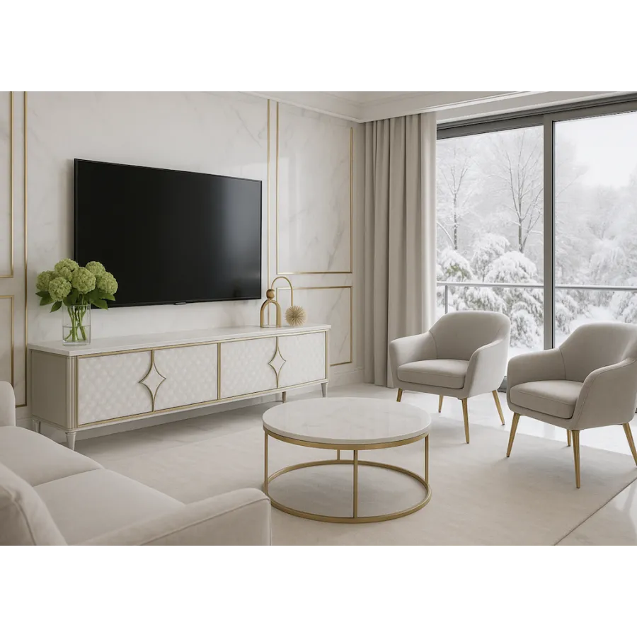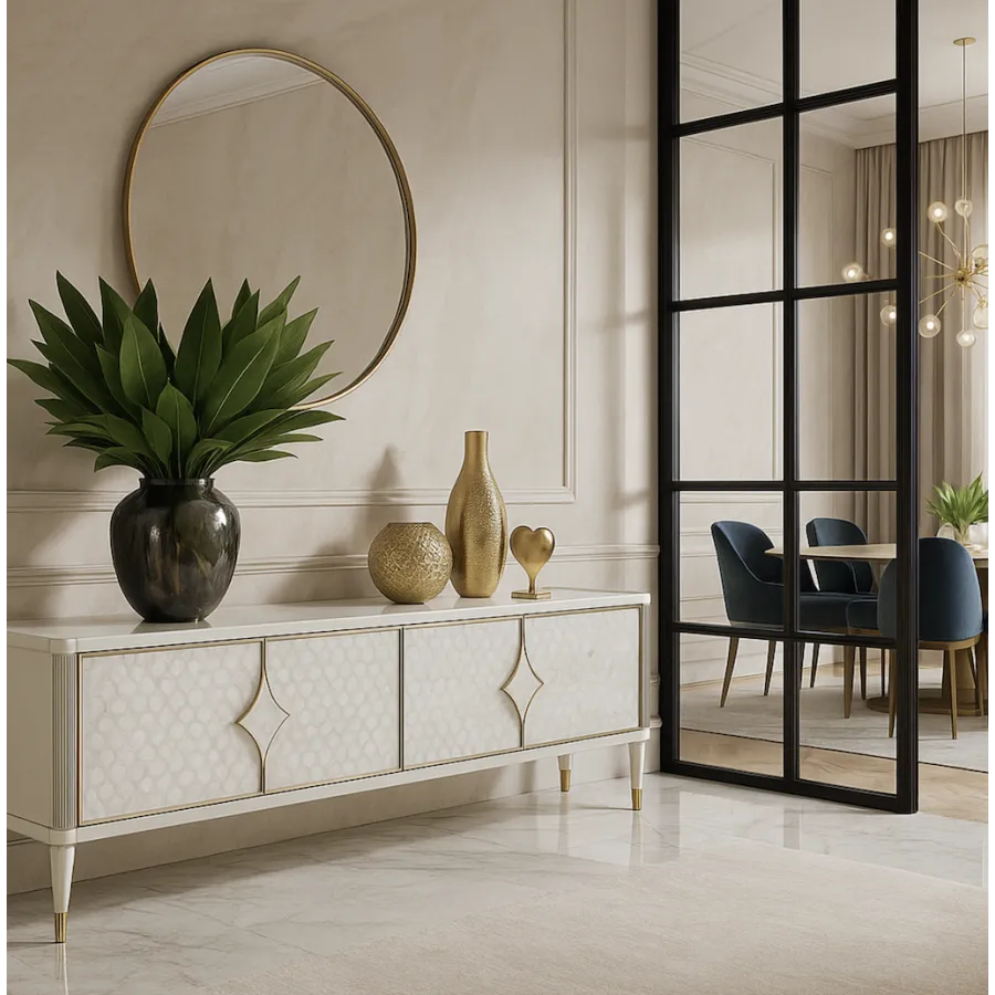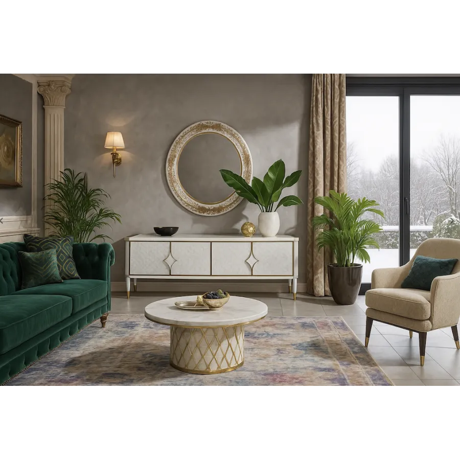 Stylowa komoda rtv w w kolorze białym ecru z frontem wykonanym z naturalnej muszli układającej się na wzór rybich łusek. Drzwi okalają złote listwy a całości dopełniają masywne uchwyty w kształcie karo. Białe nóżki zakończone są złotym akcentem.
