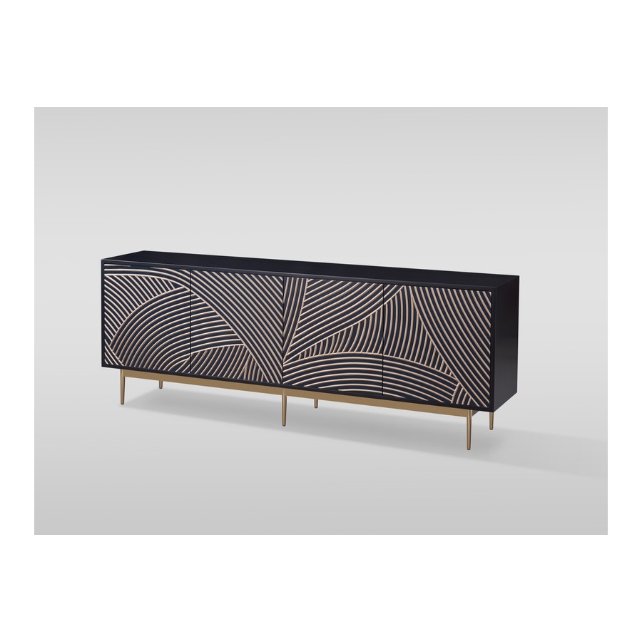 Stylowa komoda rtv w kolorze ciemnogranatowym z frontem ze złotym, wypukłym wzorem w kształcie łagodnych linii oraz ze złotymi nogami. Gładki i jednolity korpus idealnie kontrastuje ze zdobionym frontem.