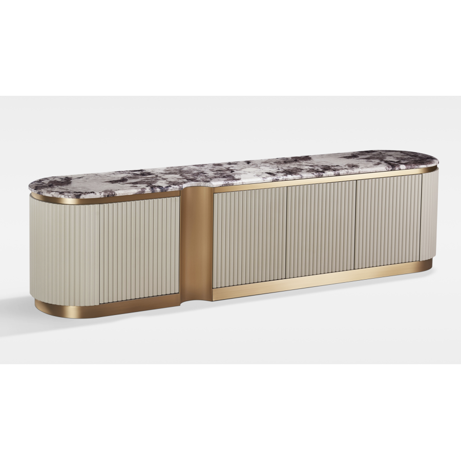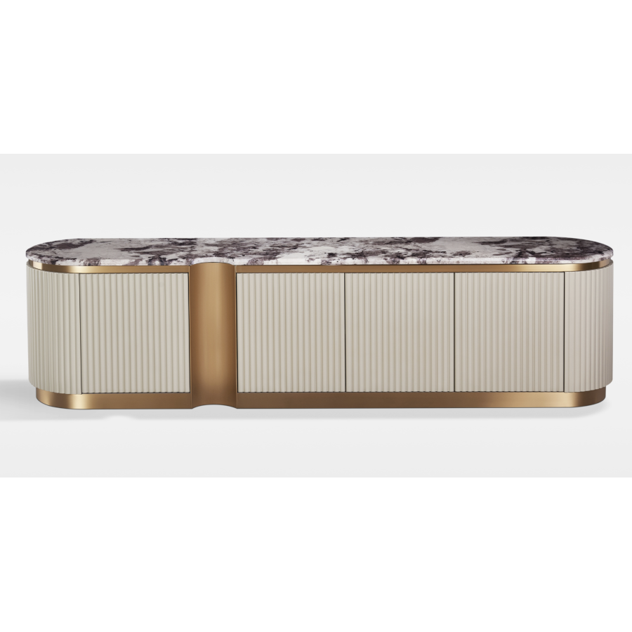 Stylowa jasnokremowa szafka RTV ze złotymi akcentami i wieńcem dolnym. Korpus posiada ryflowane drewno. Blat ma wykończenie marmurowe.