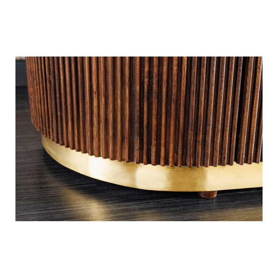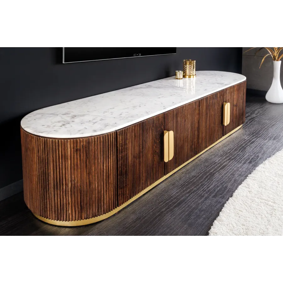Uwielbiasz ekstrawagancki design i potrzebujesz dodatkowego miejsca do przechowywania w swoim domu? W takim razie nasza designerska szafka RTV GATSBY od INVICTA INTERIOR jest idealnym wyborem! Co wyróżnia tę komodę? Okrągły design w stylu retro, blat z prawdziwego marmuru i złote detale. Prążkowany przód jest atrakcją zarówno pod względem dotykowym, jak i wizualnym. Dzięki litemu drewnu mango i blatowi z prawdziwego marmuru komoda posiada stabilną podstawę. Unikalne usłojenie drewna sprawi, że komoda będzie naprawdę wyjątkowy w Twoim domu. Poznaj nowoczesną szafkę RTV / komodę RTV GATSBY w swoim otoczeniu!