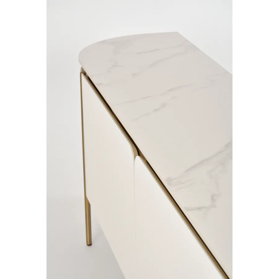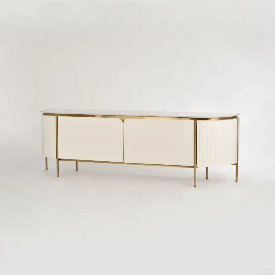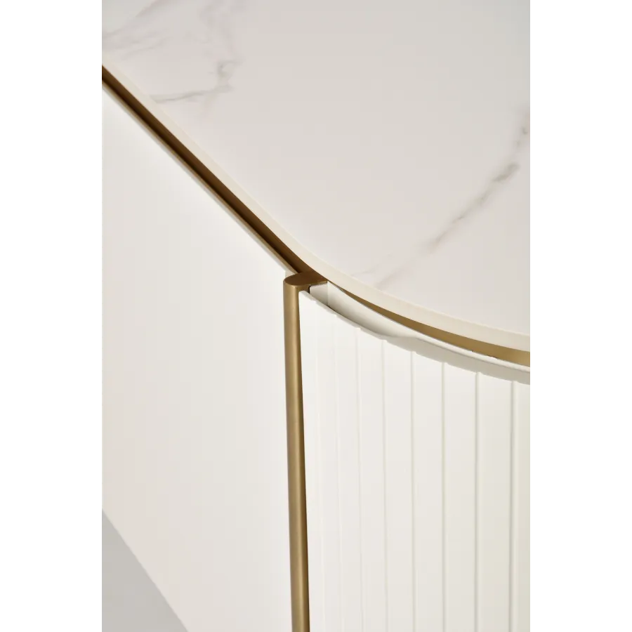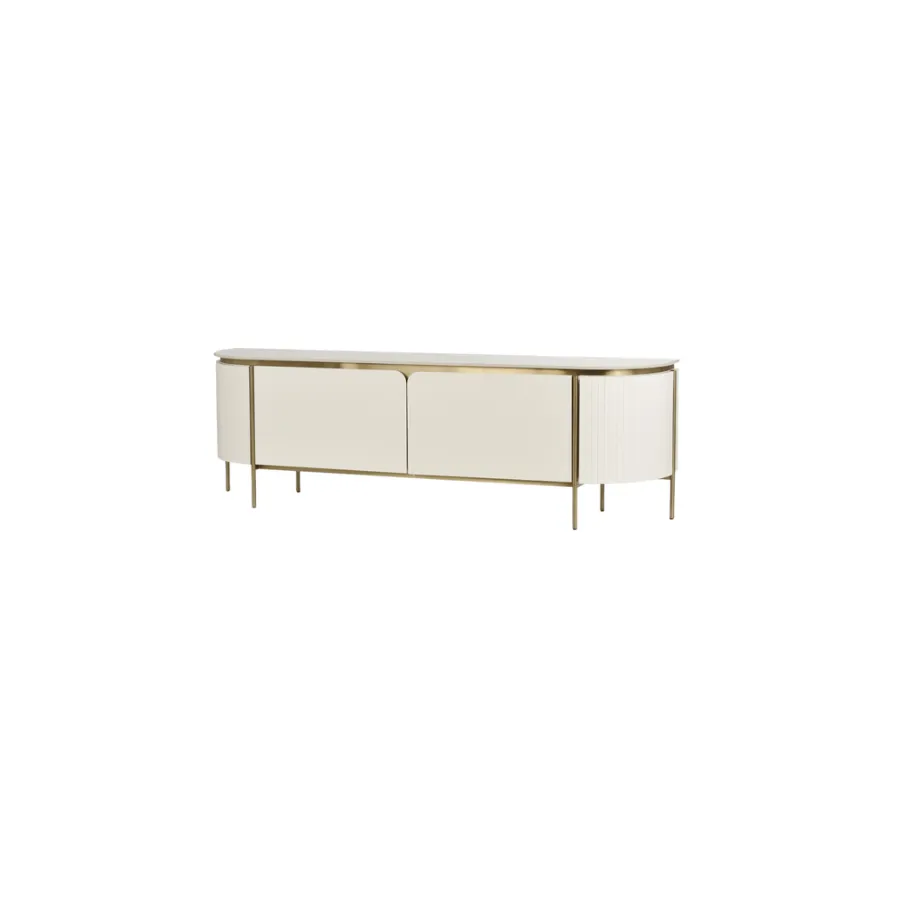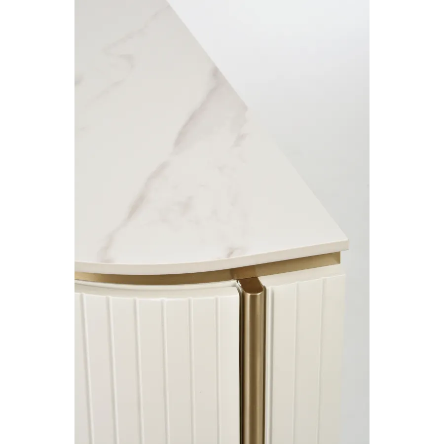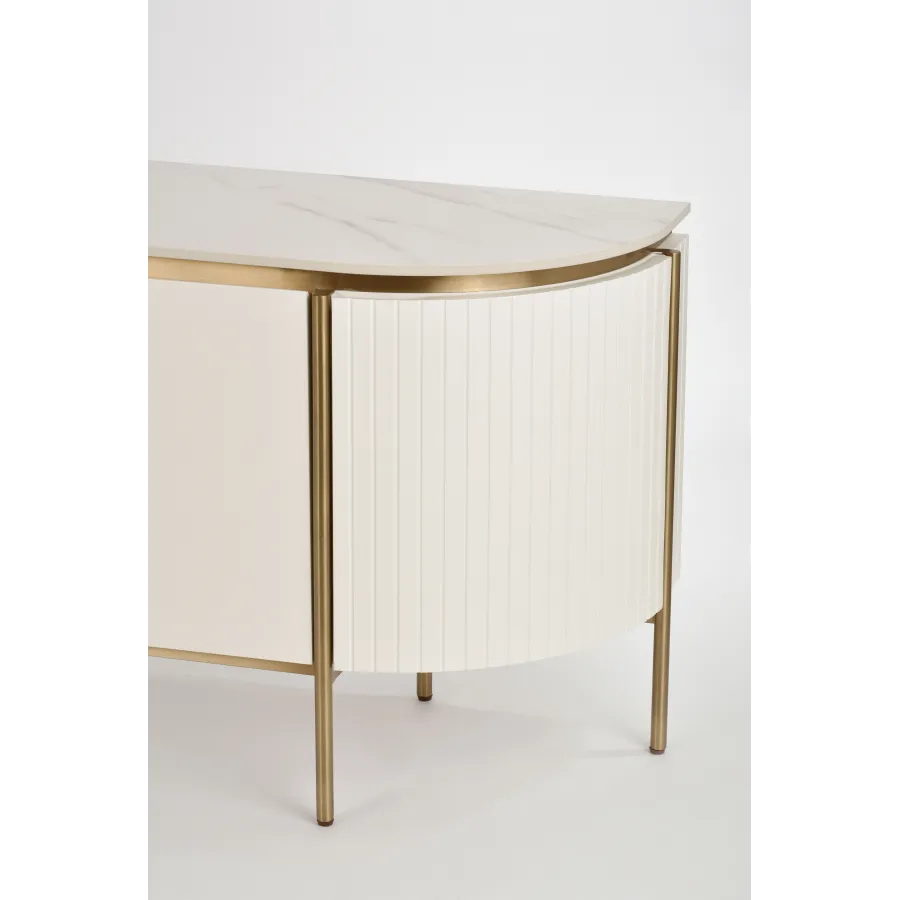 Stylowa komoda rtv w kolorze białym ecru ze złotymi akcentami i nogami. Korpus posiada ryflowane drewno. Blat ma wykończenie marmurowe.