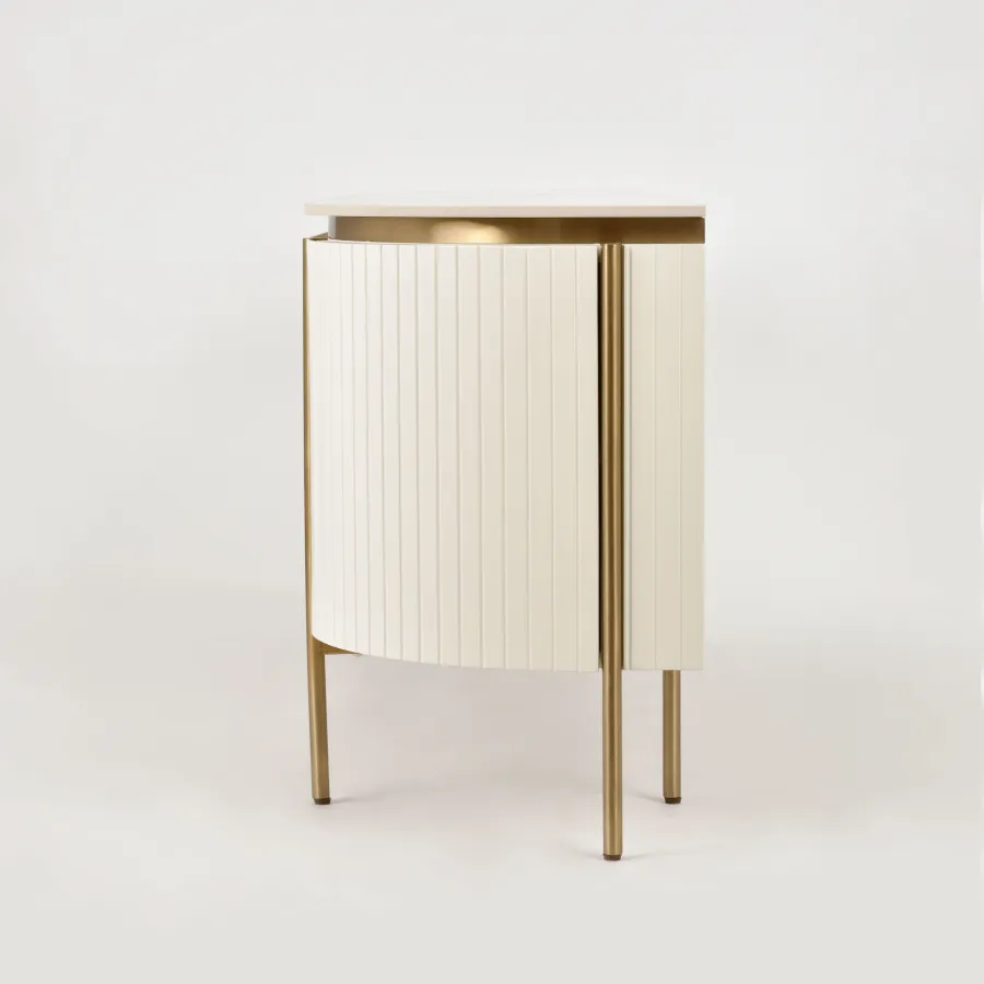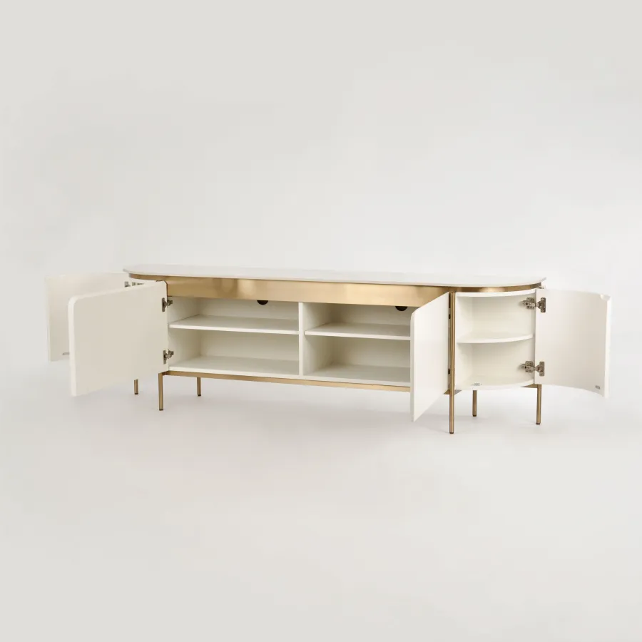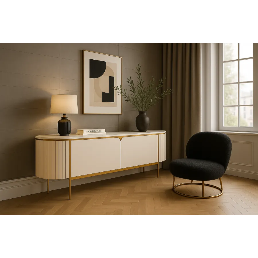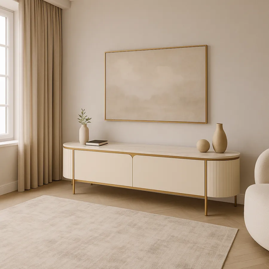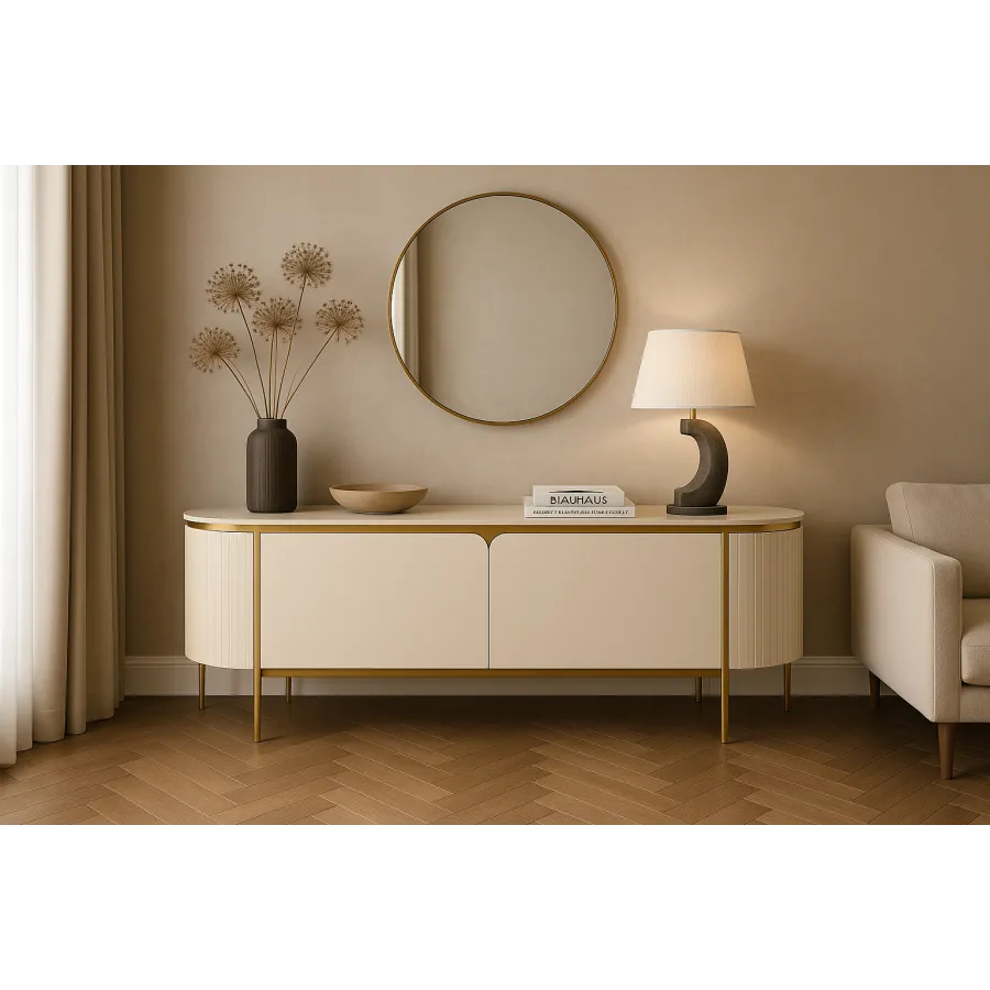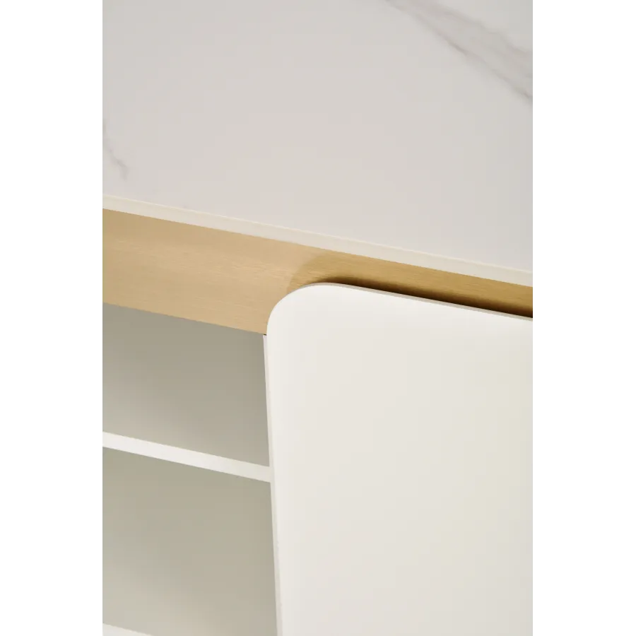 Stylowa komoda rtv w kolorze białym ecru ze złotymi akcentami i nogami. Korpus posiada ryflowane drewno. Blat ma wykończenie marmurowe.