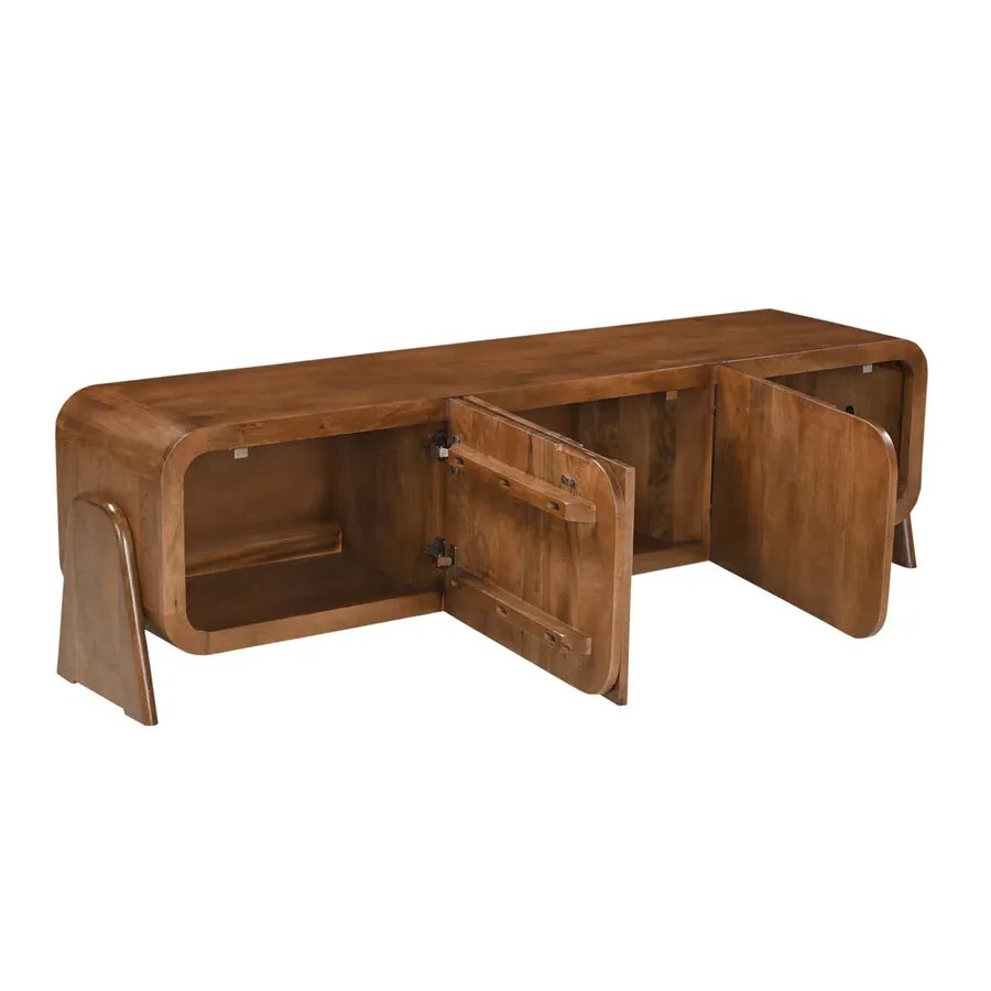 Szafka TV BRASIL dostarczany jest w stanie zmontowanym i zachwyca opływowym, bezuchwytowym designem. Za czworgiem bezuchwytowych drzwiczek kryją się cztery pojemne przegródki, oferujące wszechstronne miejsce do przechowywania naczyń, dekoracji lub dokumentów. Efektowne nóżki boczne nadają kredensowi stylową lekkość i podkreślają jego ręcznie robiony charakter. Niezależnie od tego, czy znajduje się w salonie, jadalni, czy przedpokoju – BRASIL to funkcjonalny element przyciągający wzrok o naturalnym charakterze.