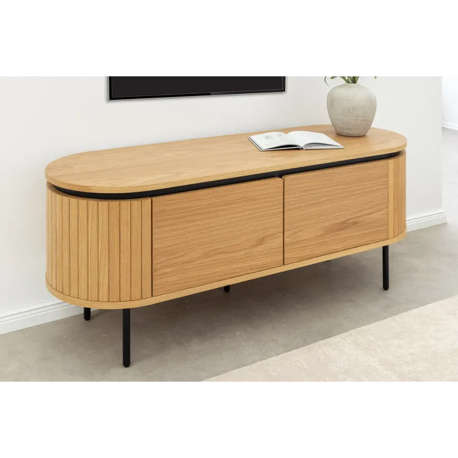 Szafka RTV ATELIER to stylowy element wyposażenia, który wprowadzi do Twojego salonu ciepło naturalnego drewna i nowoczesną lekkość formy. Zaokrąglone krawędzie, fornir z prawdziwego dębu oraz minimalistyczny design tworzą harmonijną, przytulną atmosferę. Całość uzupełnia czarna metalowa rama, stanowiąca elegancki kontrast dla naturalnego wykończenia i gwarantująca solidną stabilność.