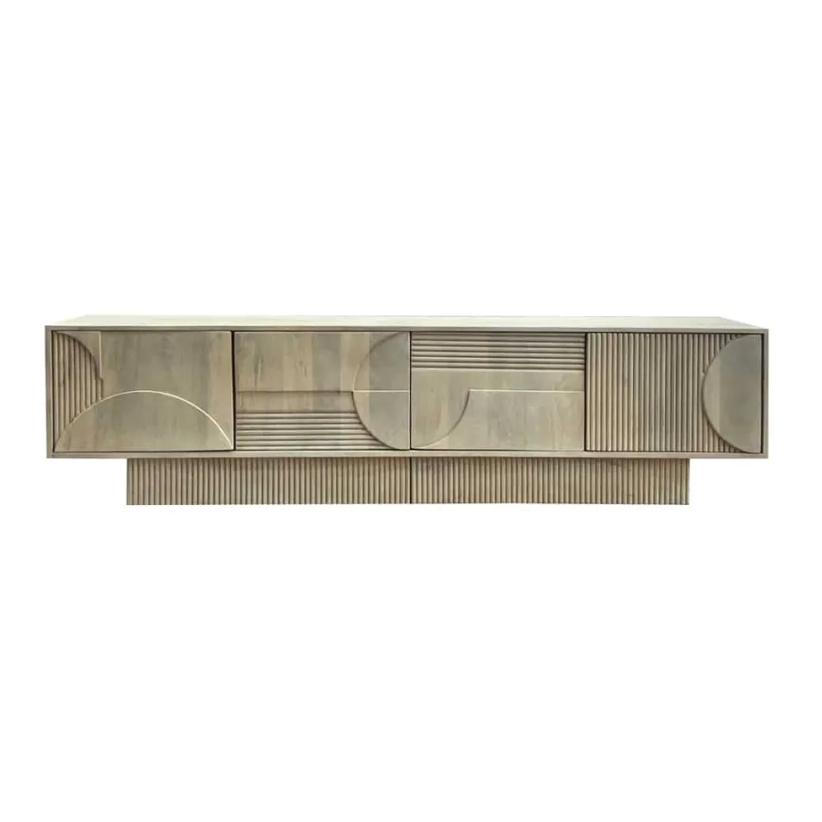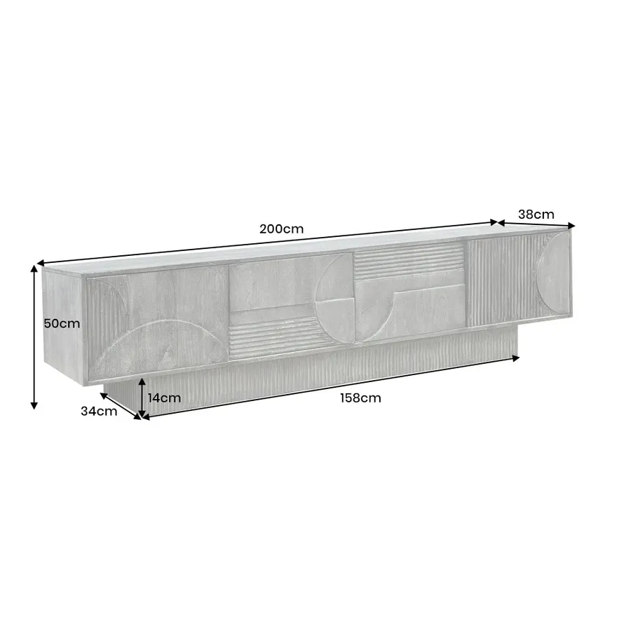 Niska szafka RTV ART DECO łączy w sobie artystyczny design z kunsztem wykonania. Wykonany z litego drewna mango i wykończony wyrafinowaną białą glazurą, nadaje Twojemu wnętrzu poczucie spokoju i wyrafinowania. Misternie wykonane fronty z rzeźbiarskimi krzywiznami, delikatnymi liniami i geometrycznymi kształtami sprawiają, że każdy mebel jest wyjątkowy. Delikatnie półprzezroczyste usłojenie drewna podkreśla jego naturalny charakter i tworzy ciepłą, domową atmosferę z nutą nowoczesnej elegancji.