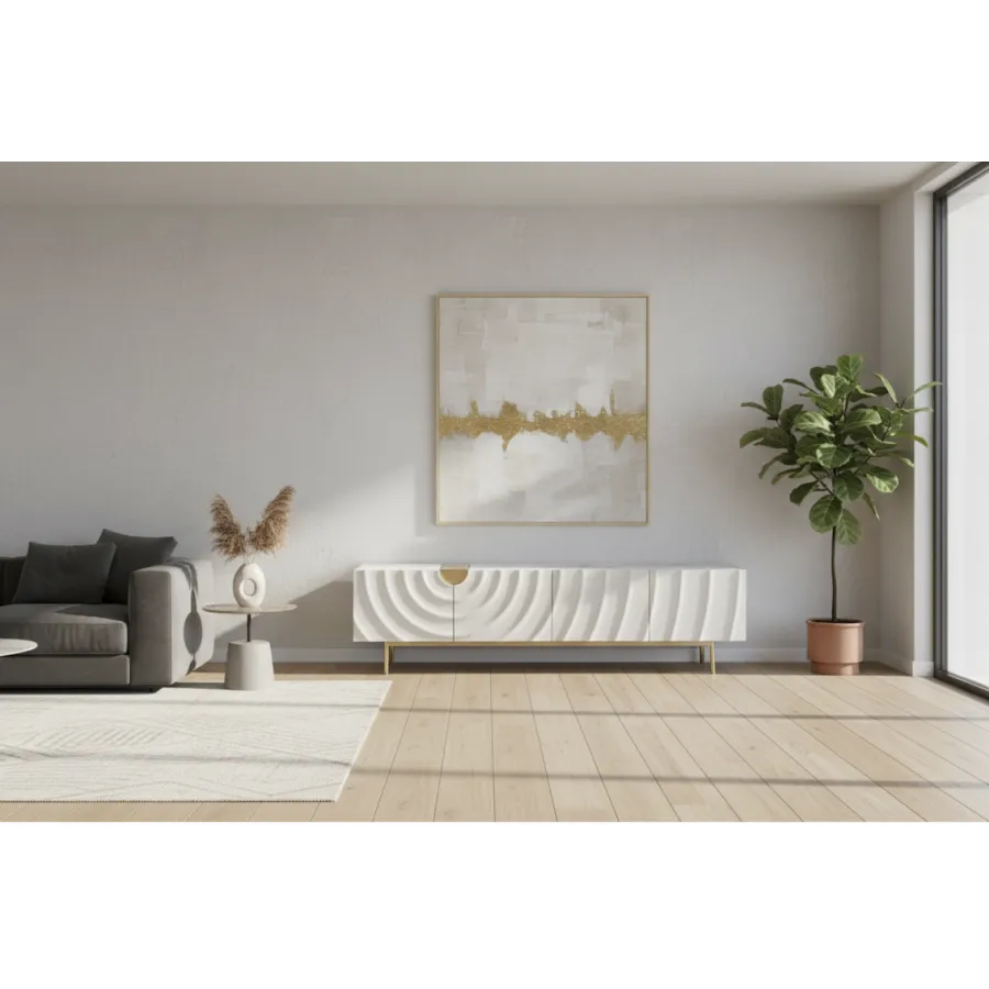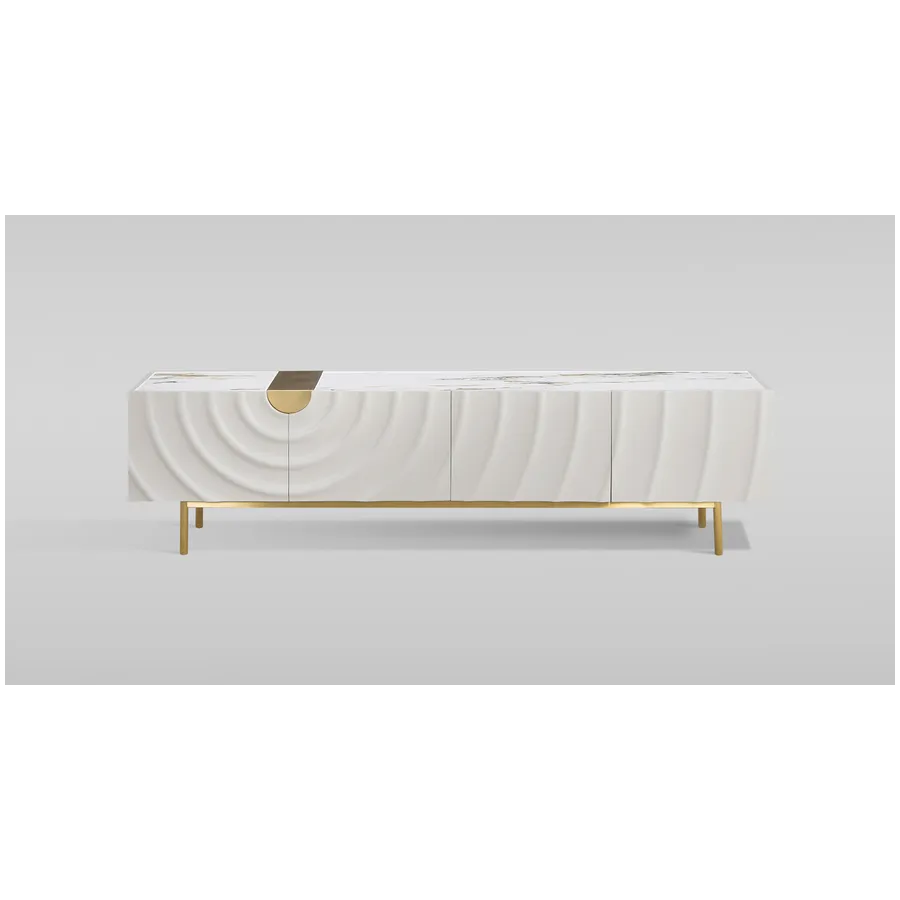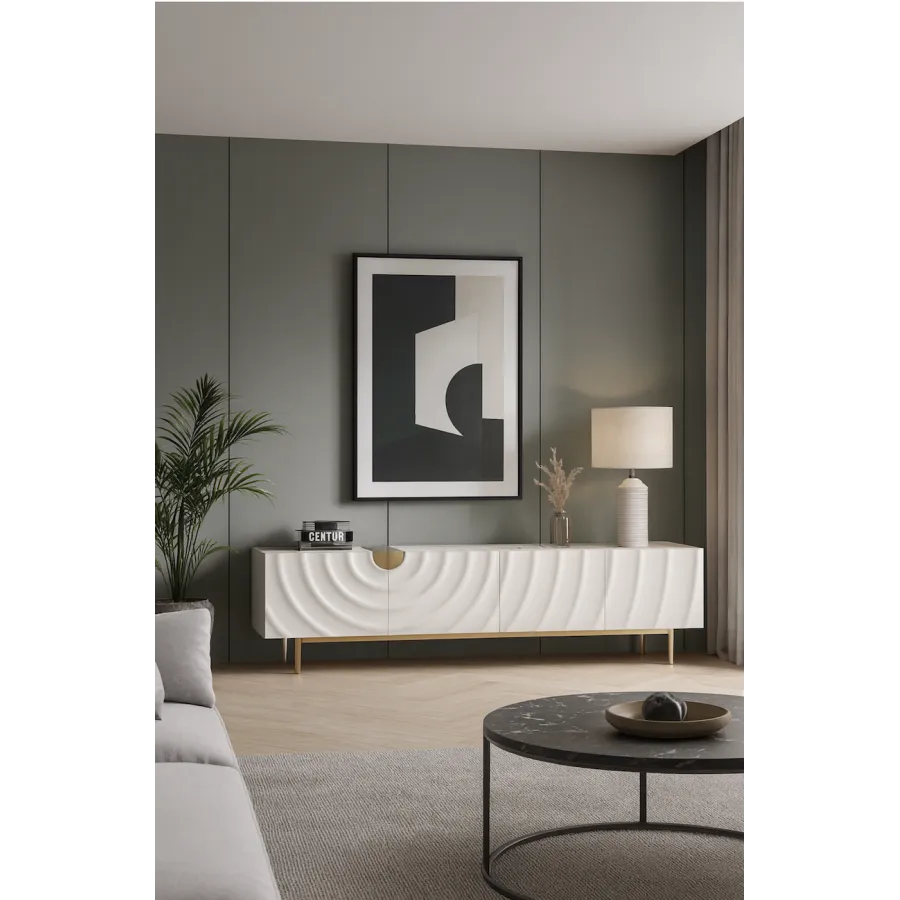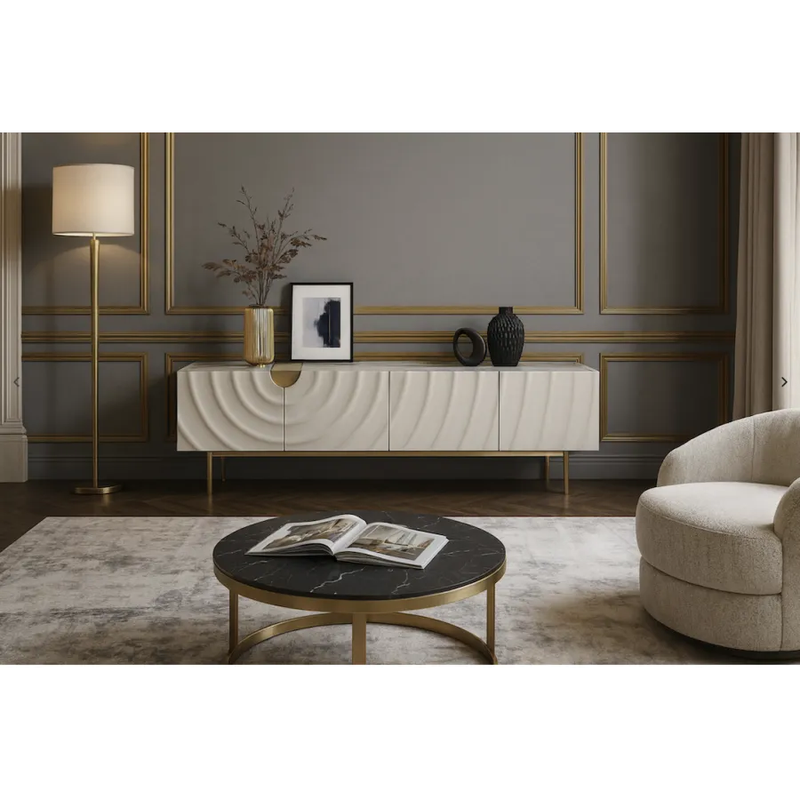 Szafka tv w odcieniu ciepłego białego ecru, wykończona złotymi akcentami oraz smukłymi, metalowymi nogami. Nawiązuje do elegancji stylu art déco. Fronty zdobią tłoczone, koncentryczne kręgi, które tworzą efekt gry światła i struktury, a centralny, asymetryczny detal płynnie łączy się z blatem o marmurowym wykończeniu.
