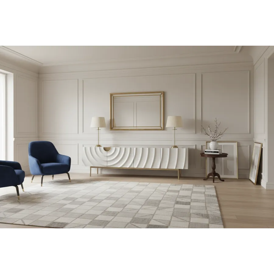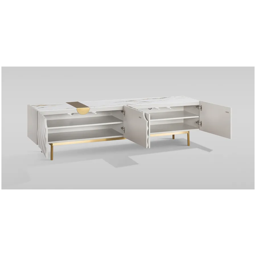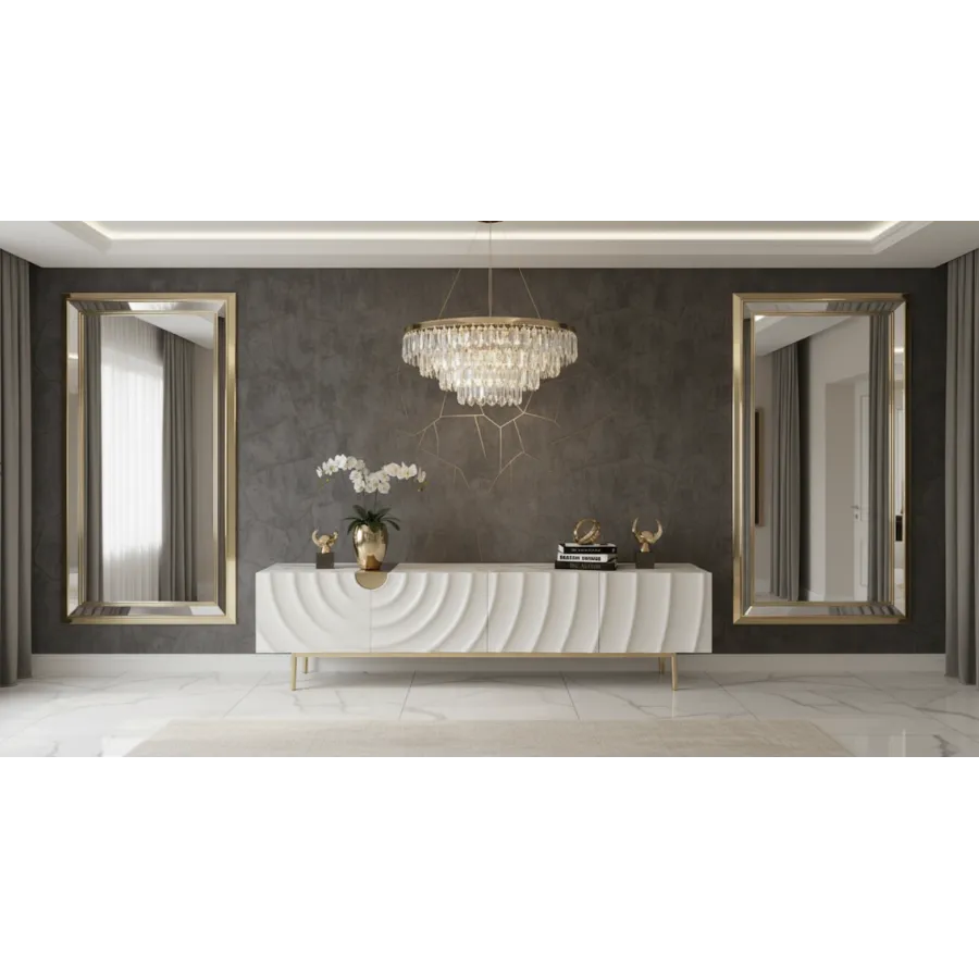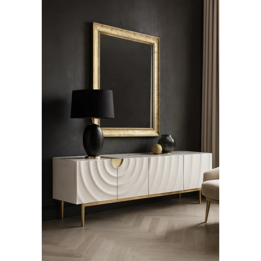 Szafka tv w odcieniu ciepłego białego ecru, wykończona złotymi akcentami oraz smukłymi, metalowymi nogami. Nawiązuje do elegancji stylu art déco. Fronty zdobią tłoczone, koncentryczne kręgi, które tworzą efekt gry światła i struktury, a centralny, asymetryczny detal płynnie łączy się z blatem o marmurowym wykończeniu.