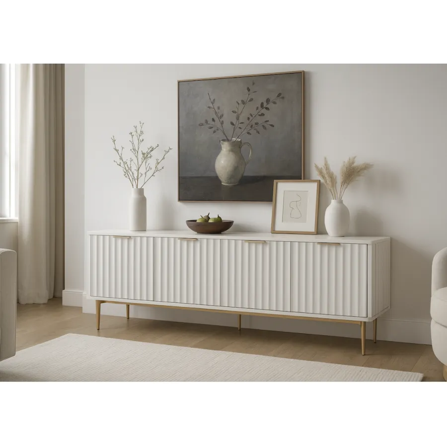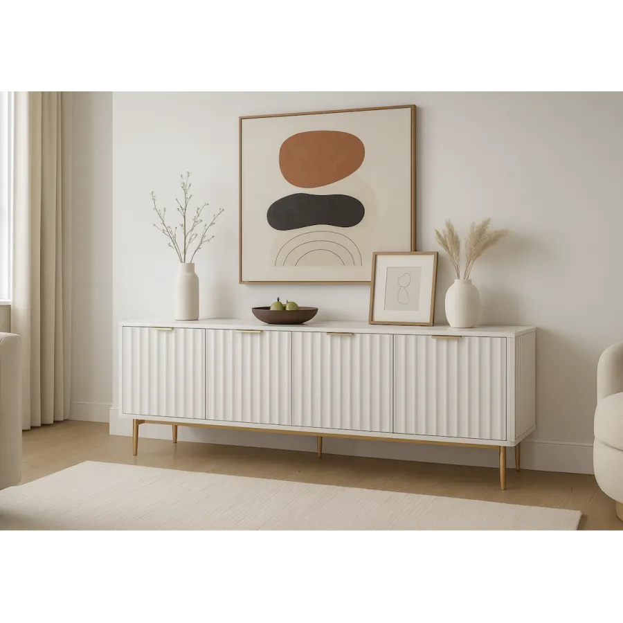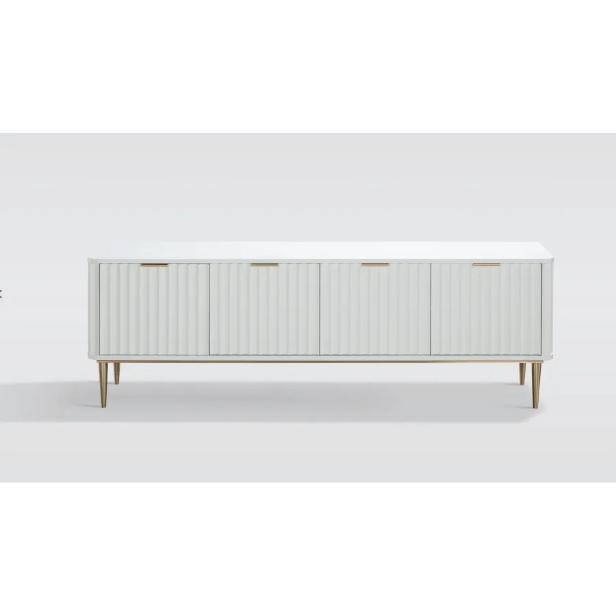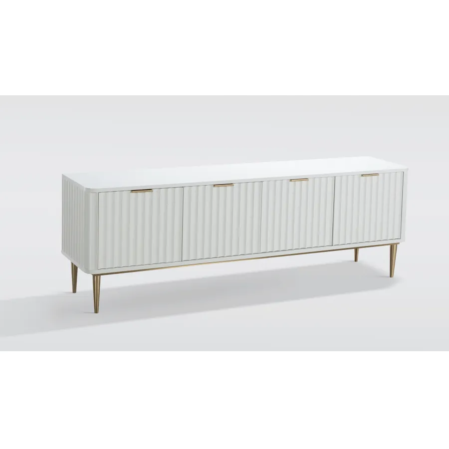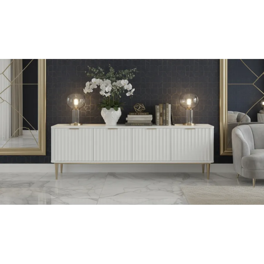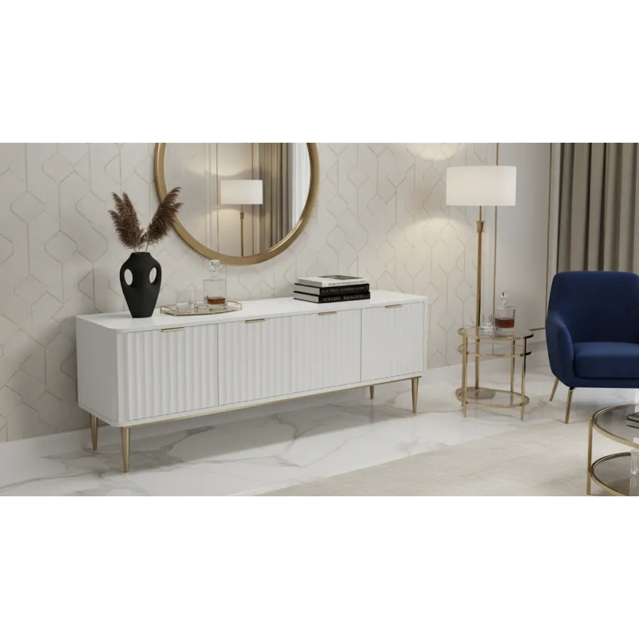 Stylowa komoda RTV w odcieniu białego ecru, wykończona złotymi uchwytami i smukłymi metalowymi nogami. Korpus i fronty zdobi ryflowane wykończenie, a zaokrąglone krawędzie nadają całości lekkości i subtelnej elegancji. Idealny wybór do wnętrz, w których liczy się zarówno funkcjonalność, jak i wysmakowany design.