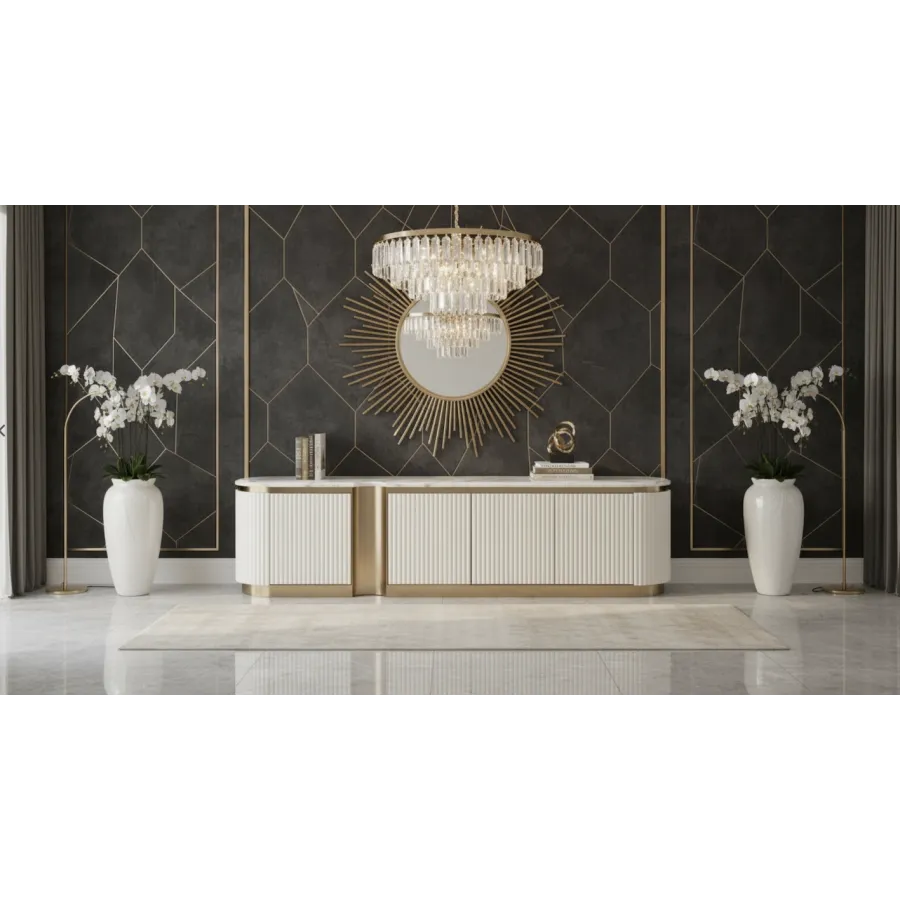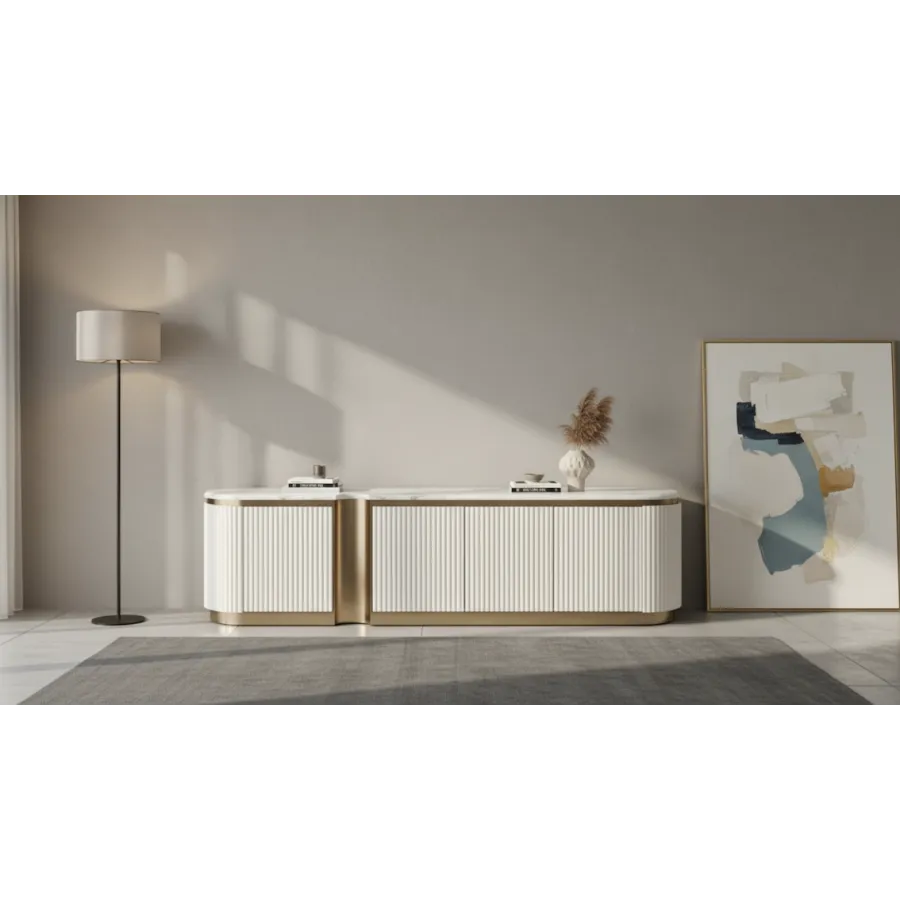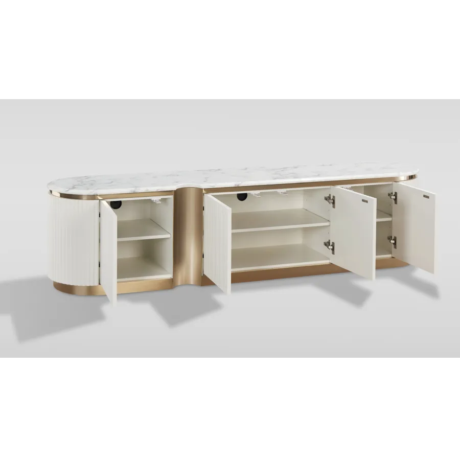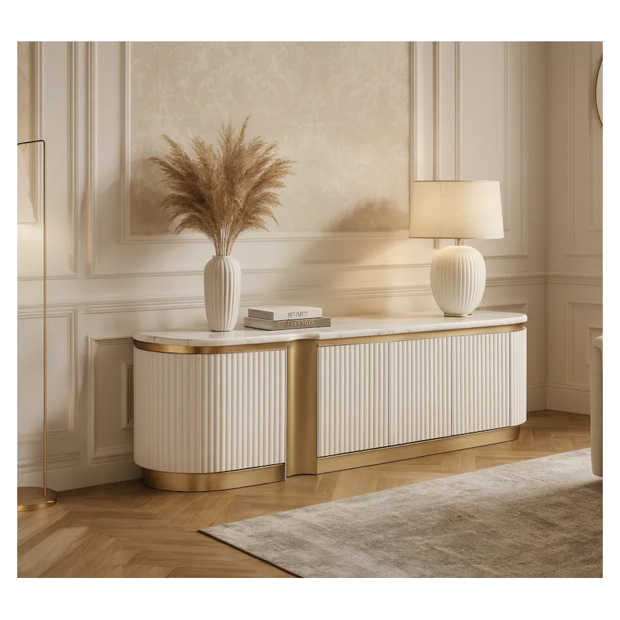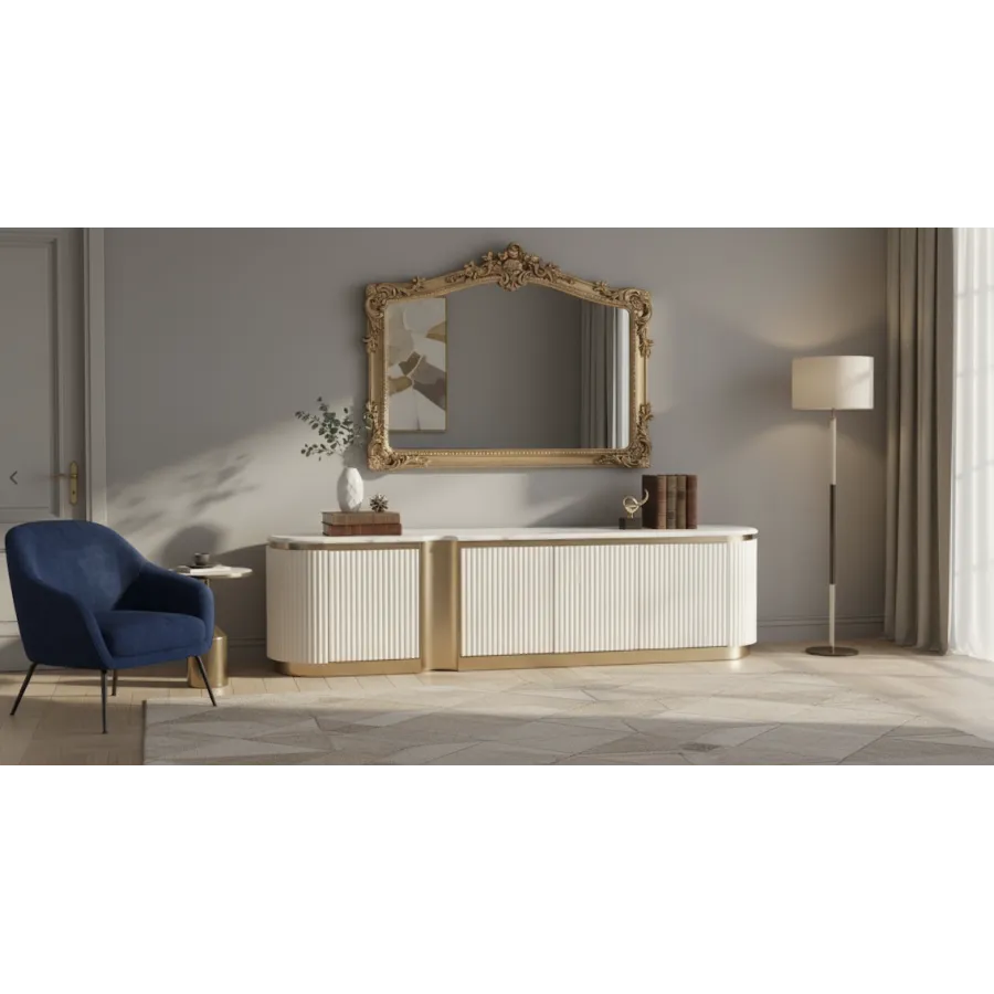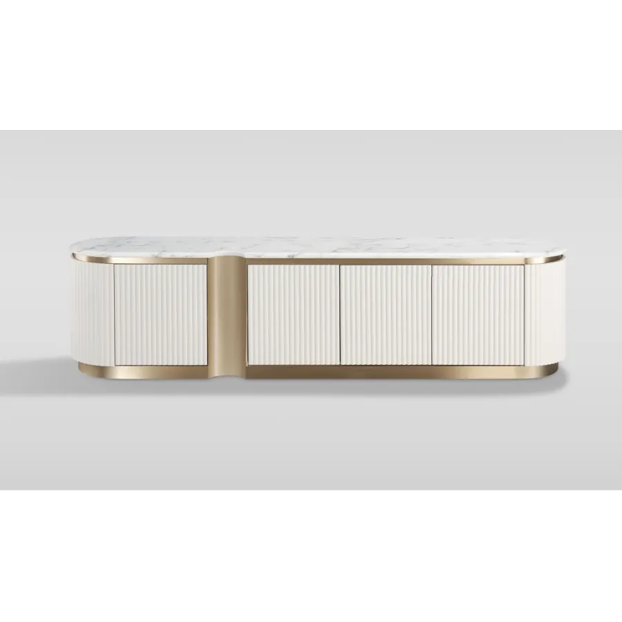 Stylowa beżowa szafka RTV ze złotymi akcentami i wieńcem dolnym w niklowanym kolorze. Korpus posiada ryflowane drewno. Blat ma wykończenie marmurowe.
