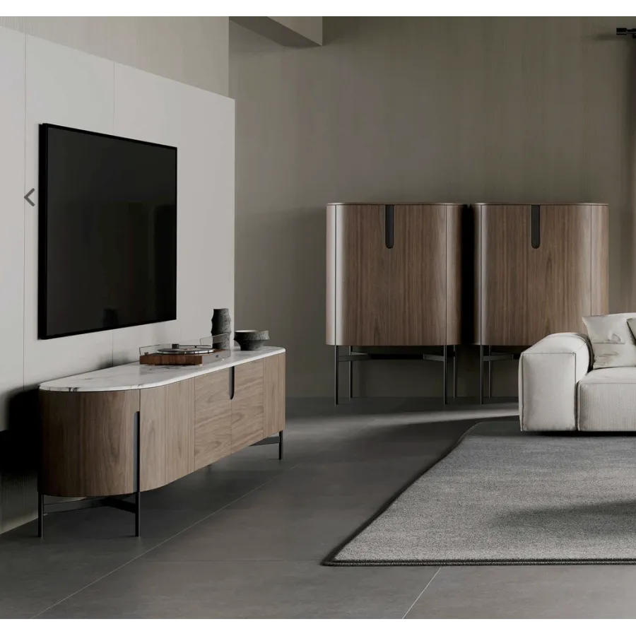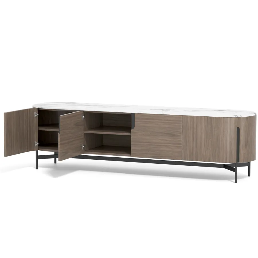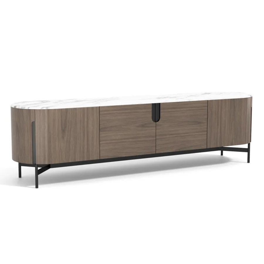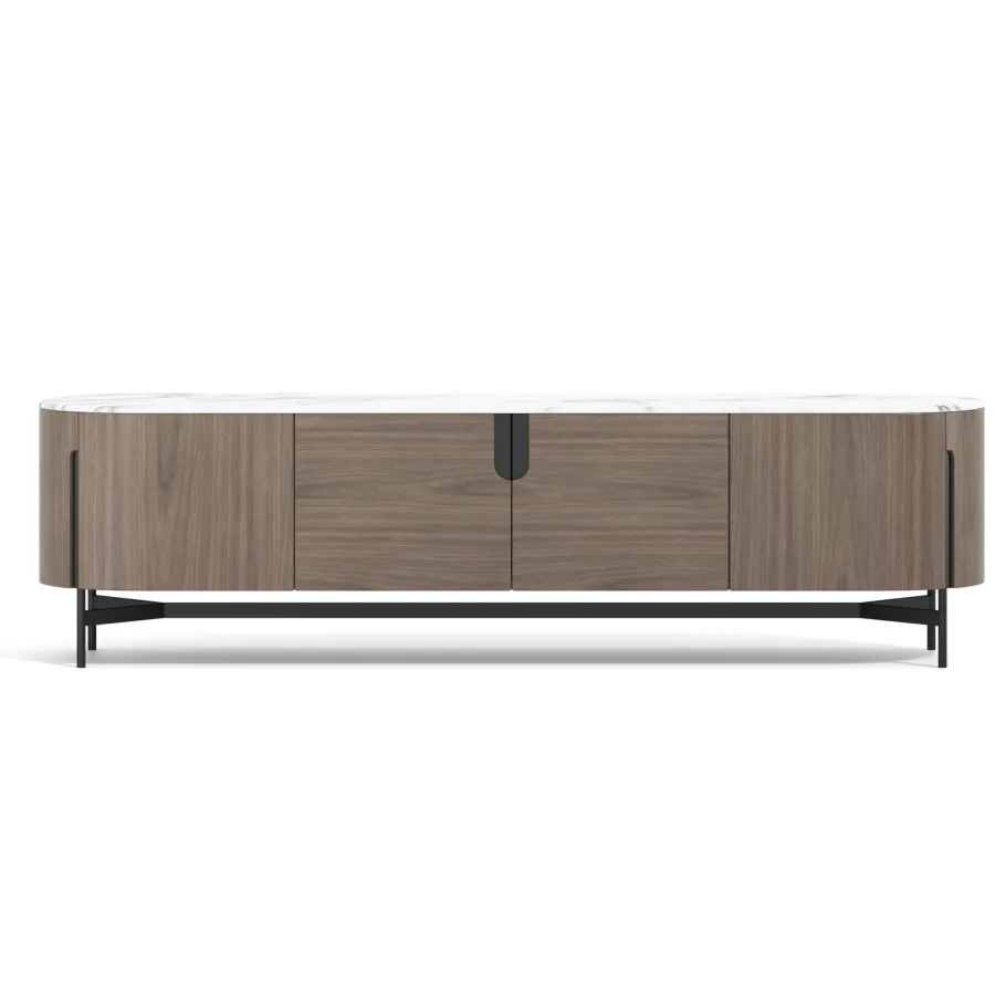 Nowoczesna komoda rtv w kolorze orzecha włoskiego z widocznymi słojami drewna. Metalowa podstawa i akcenty są w kolorze czarnym. Opływowa linia bryły została podkreślona detalami w postaci elementów w kształcie łuków.