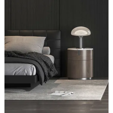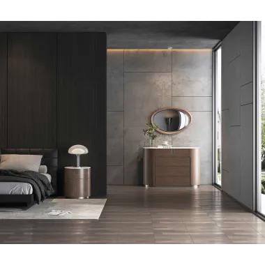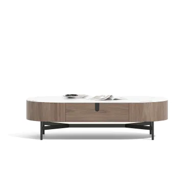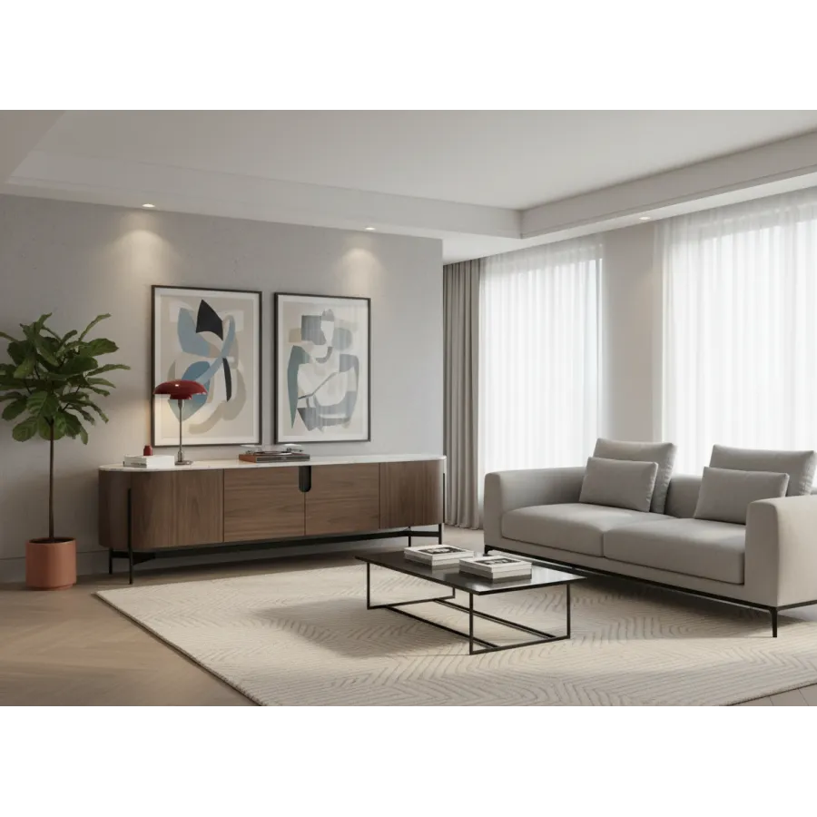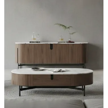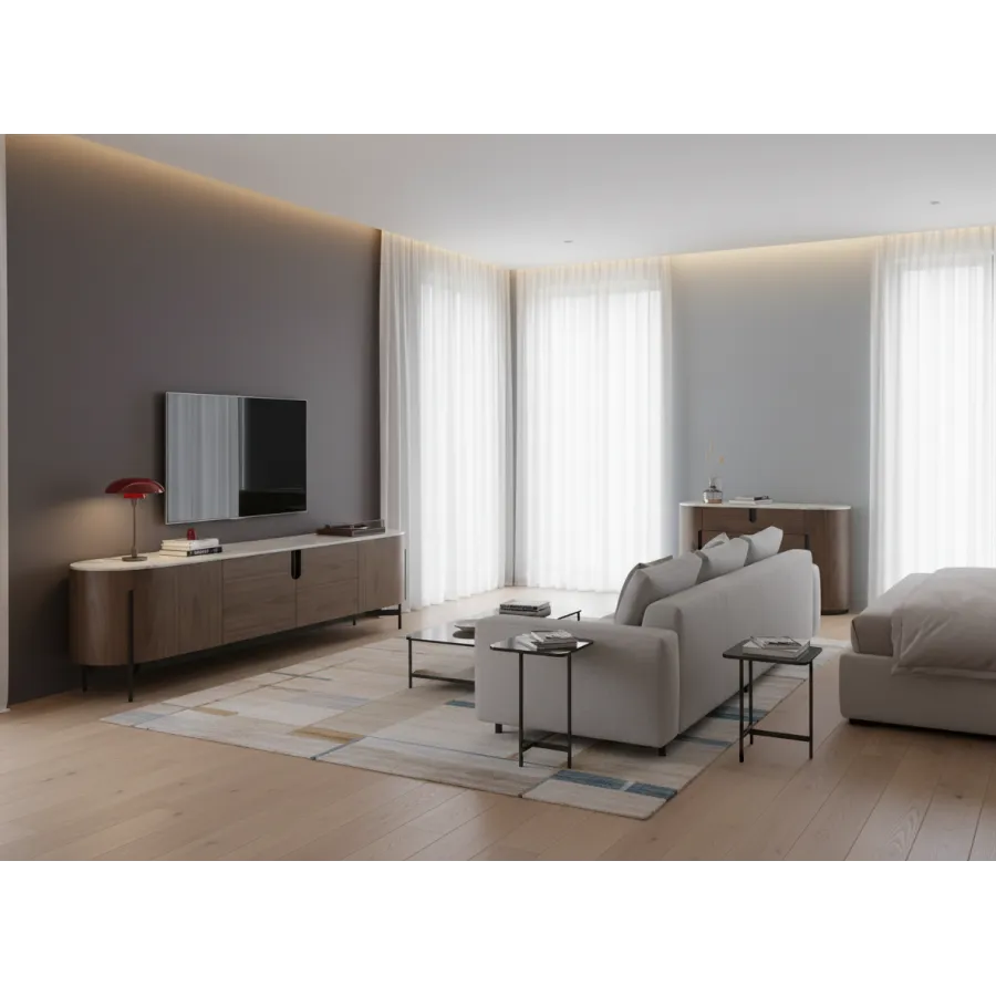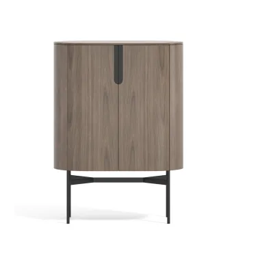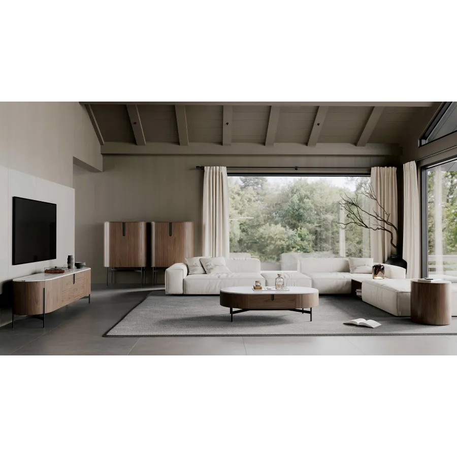Nowoczesna komoda rtv w kolorze orzecha włoskiego z widocznymi słojami drewna. Metalowa podstawa i akcenty są w kolorze czarnym. Opływowa linia bryły została podkreślona detalami w postaci elementów w kształcie łuków.