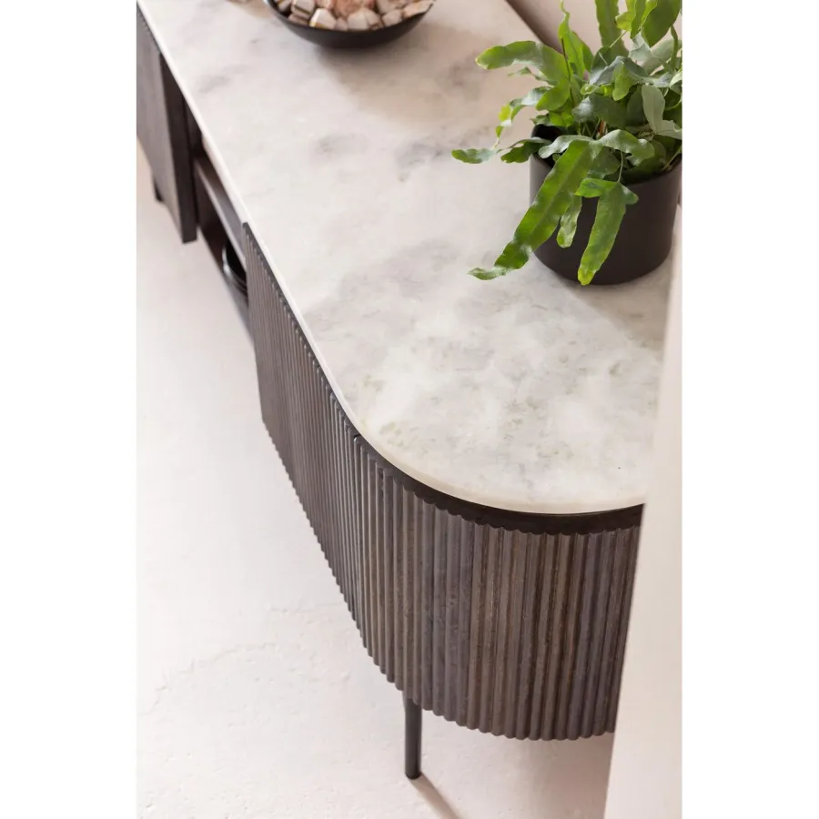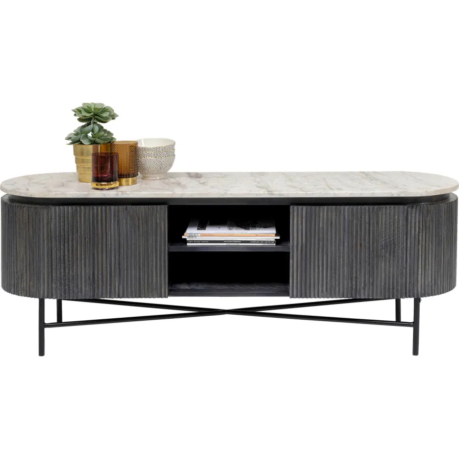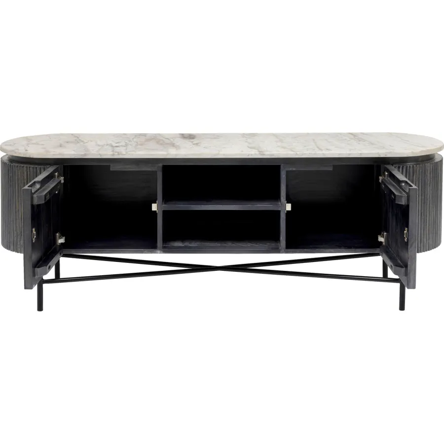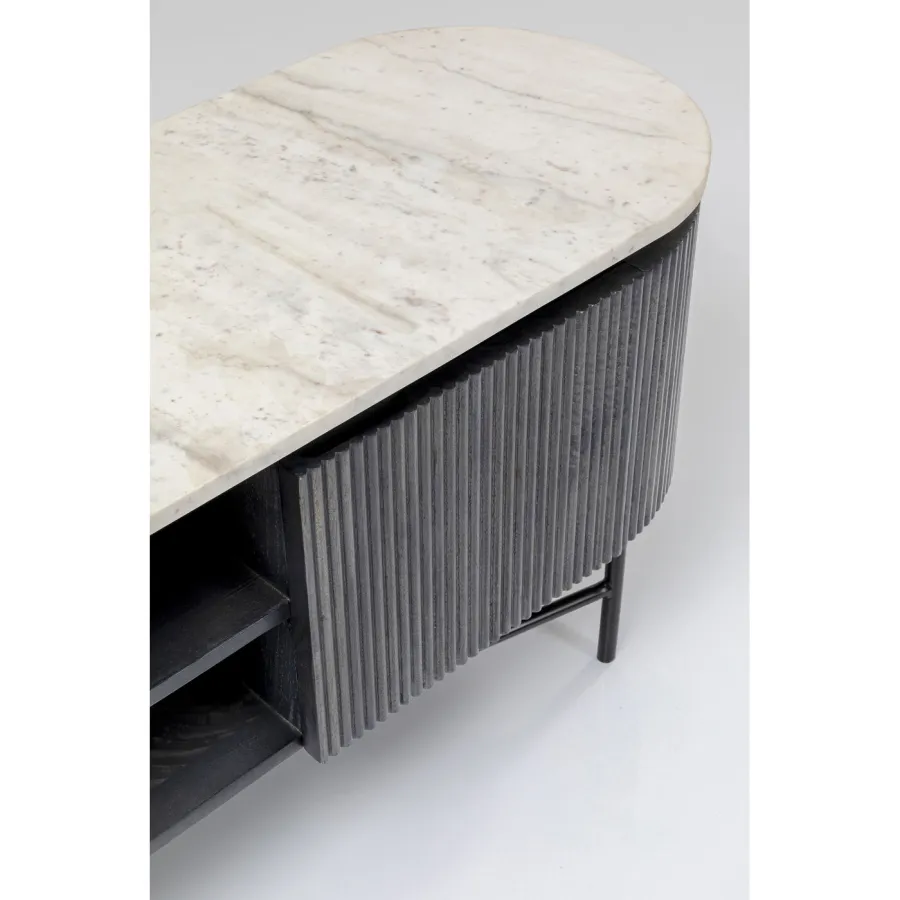 Szlachetna i wyjątkowa – ta szafka pod telewizor pragnie czegoś więcej. Kształt: płaski owal, powierzchnia do przechowywania wykonana z jasnego, prawdziwego marmuru oraz korpus, który wyróżnia się wśród szafek z ciemnoszarymi frontami i bokami z litego drewna o żebrowanym wykończeniu. Glenn emanuje dyskretną szlachetnością i ponadczasową elegancją, przekonując cennymi materiałami. Materiał: (korpus: lite drewno mango lakierowane, front: lite drewno mango lakierowane, panel tylny: płyta pilśniowa średniej gęstości lakierowana, panel górny: marmur, stopa/stopy: stal malowana proszkowo, półka: płyta pilśniowa średniej gęstości lakierowana).