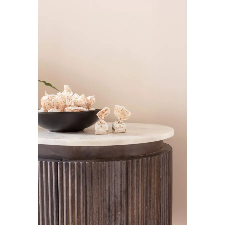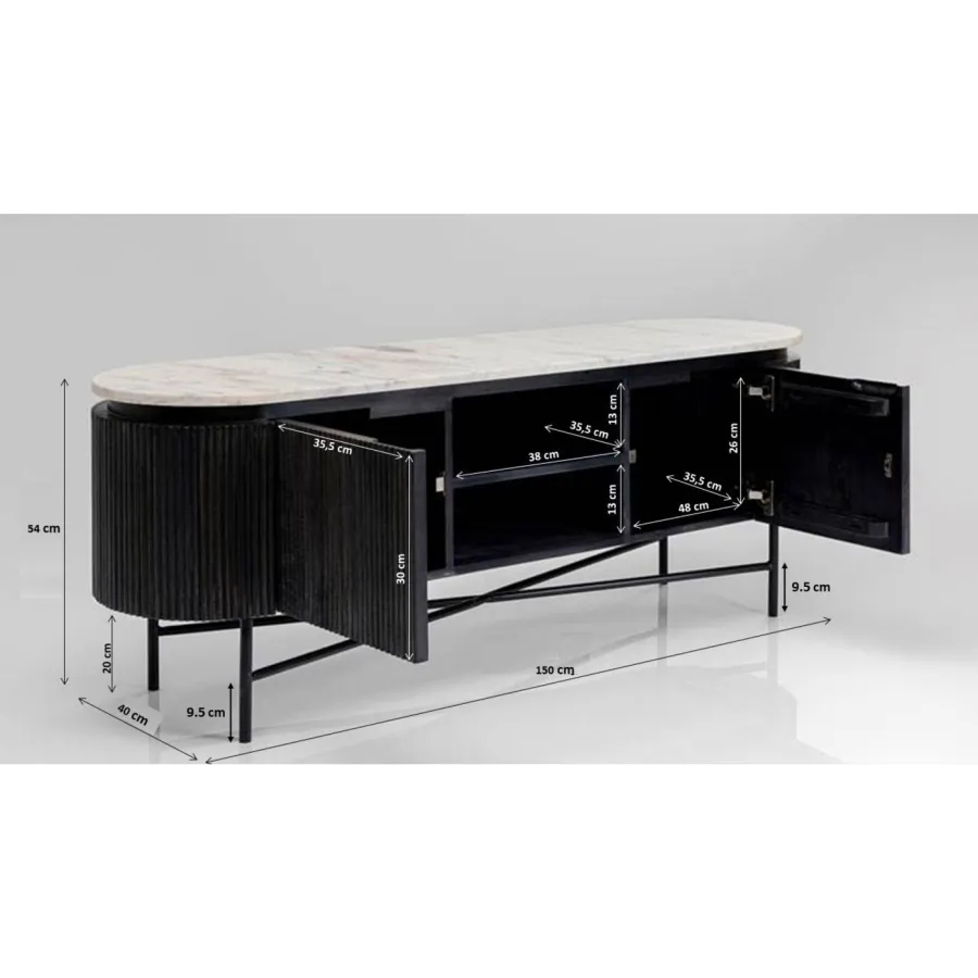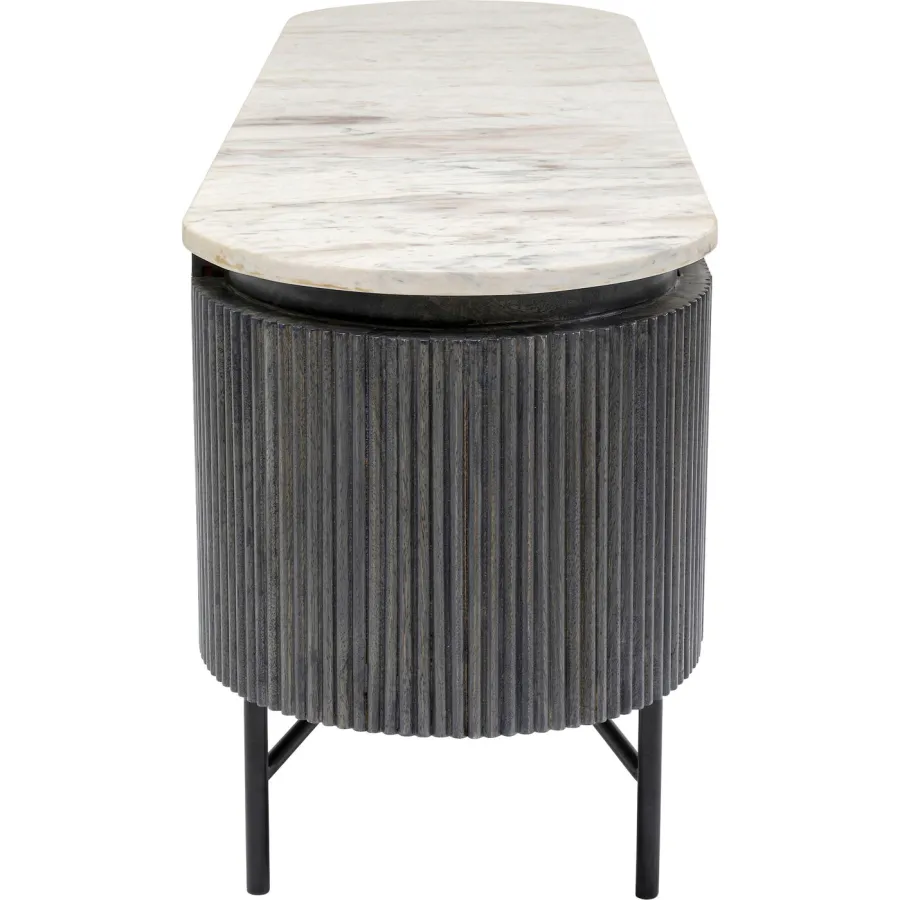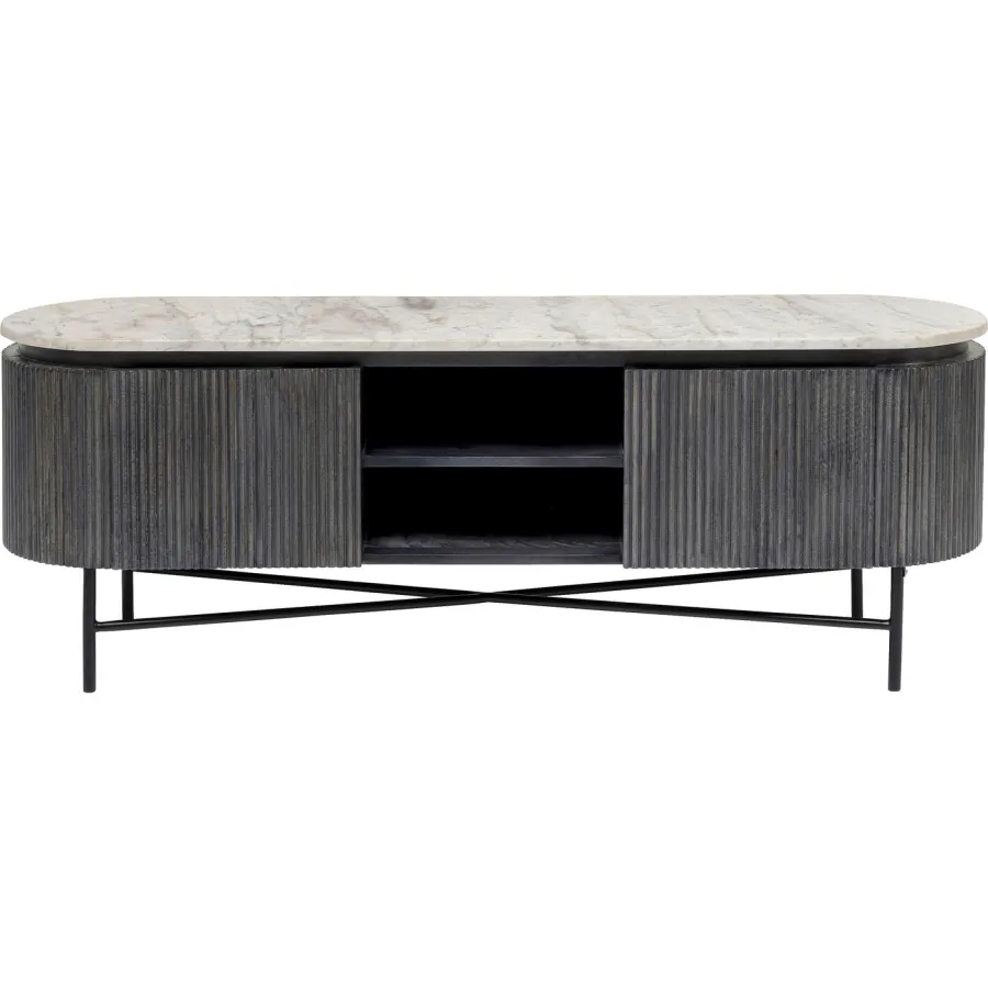 Szlachetna i wyjątkowa – ta szafka pod telewizor pragnie czegoś więcej. Kształt: płaski owal, powierzchnia do przechowywania wykonana z jasnego, prawdziwego marmuru oraz korpus, który wyróżnia się wśród szafek z ciemnoszarymi frontami i bokami z litego drewna o żebrowanym wykończeniu. Glenn emanuje dyskretną szlachetnością i ponadczasową elegancją, przekonując cennymi materiałami. Materiał: (korpus: lite drewno mango lakierowane, front: lite drewno mango lakierowane, panel tylny: płyta pilśniowa średniej gęstości lakierowana, panel górny: marmur, stopa/stopy: stal malowana proszkowo, półka: płyta pilśniowa średniej gęstości lakierowana).