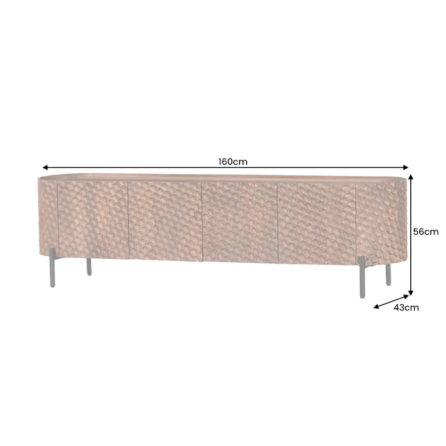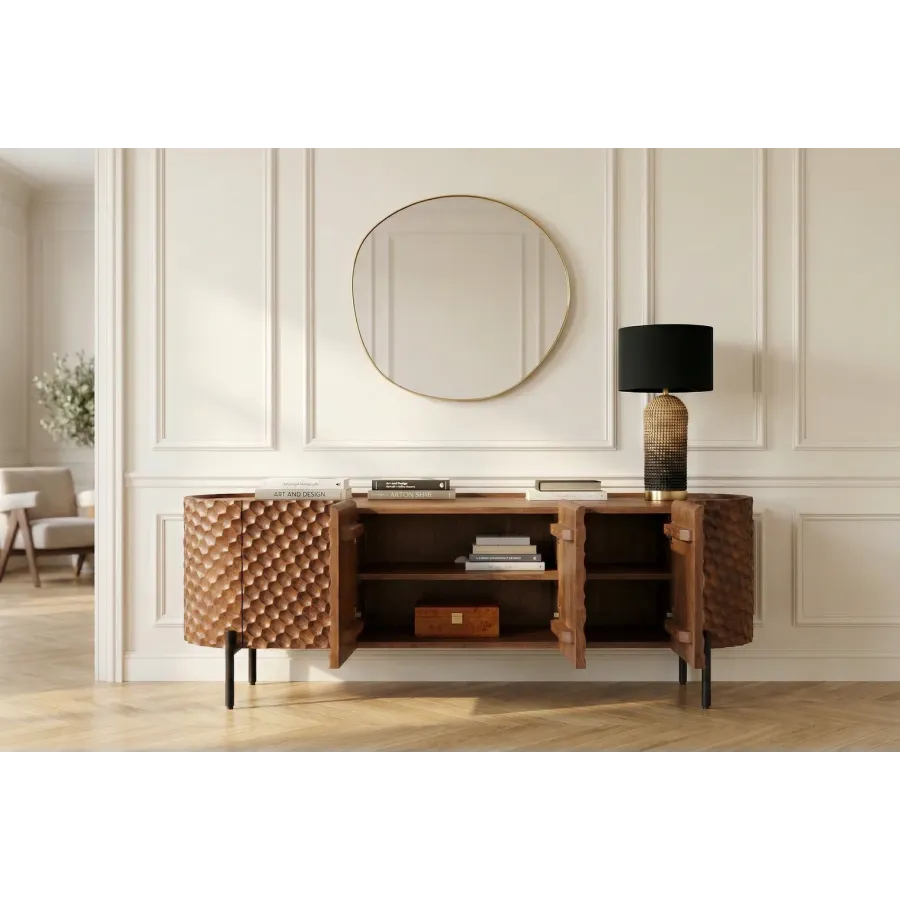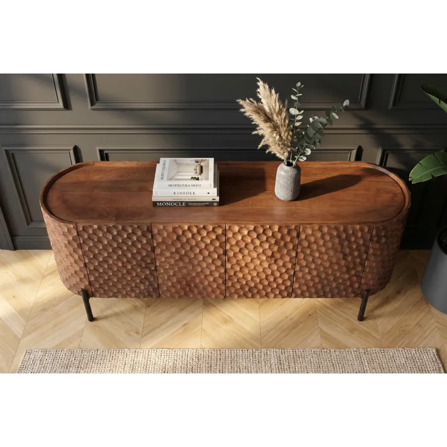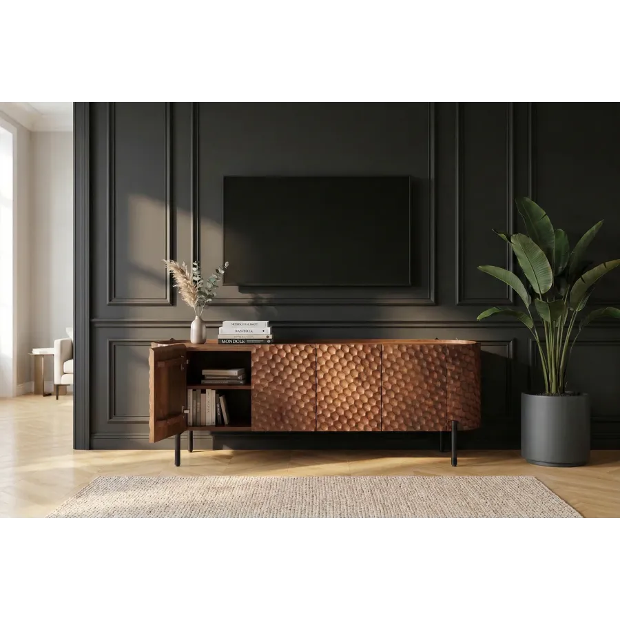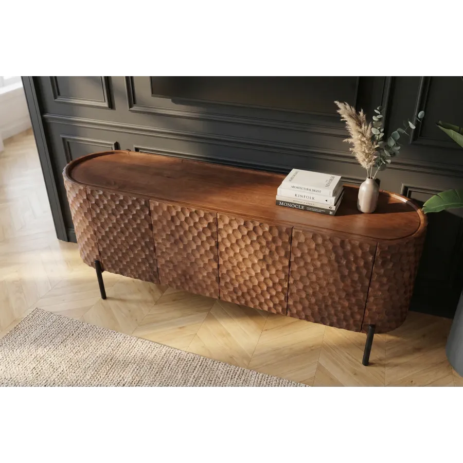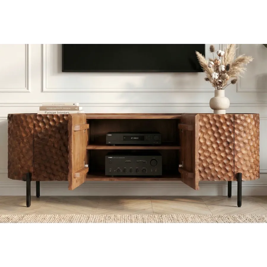 Szafka TV ADLON to prawdziwa ozdoba każdego wnętrza. Jej unikalny front 3D o strukturze plastra miodu, wykonany z litego drewna mango, natychmiast przyciąga wzrok. Powierzchnia nadaje meblowi luksusowy charakter i wyjątkową głębię.
